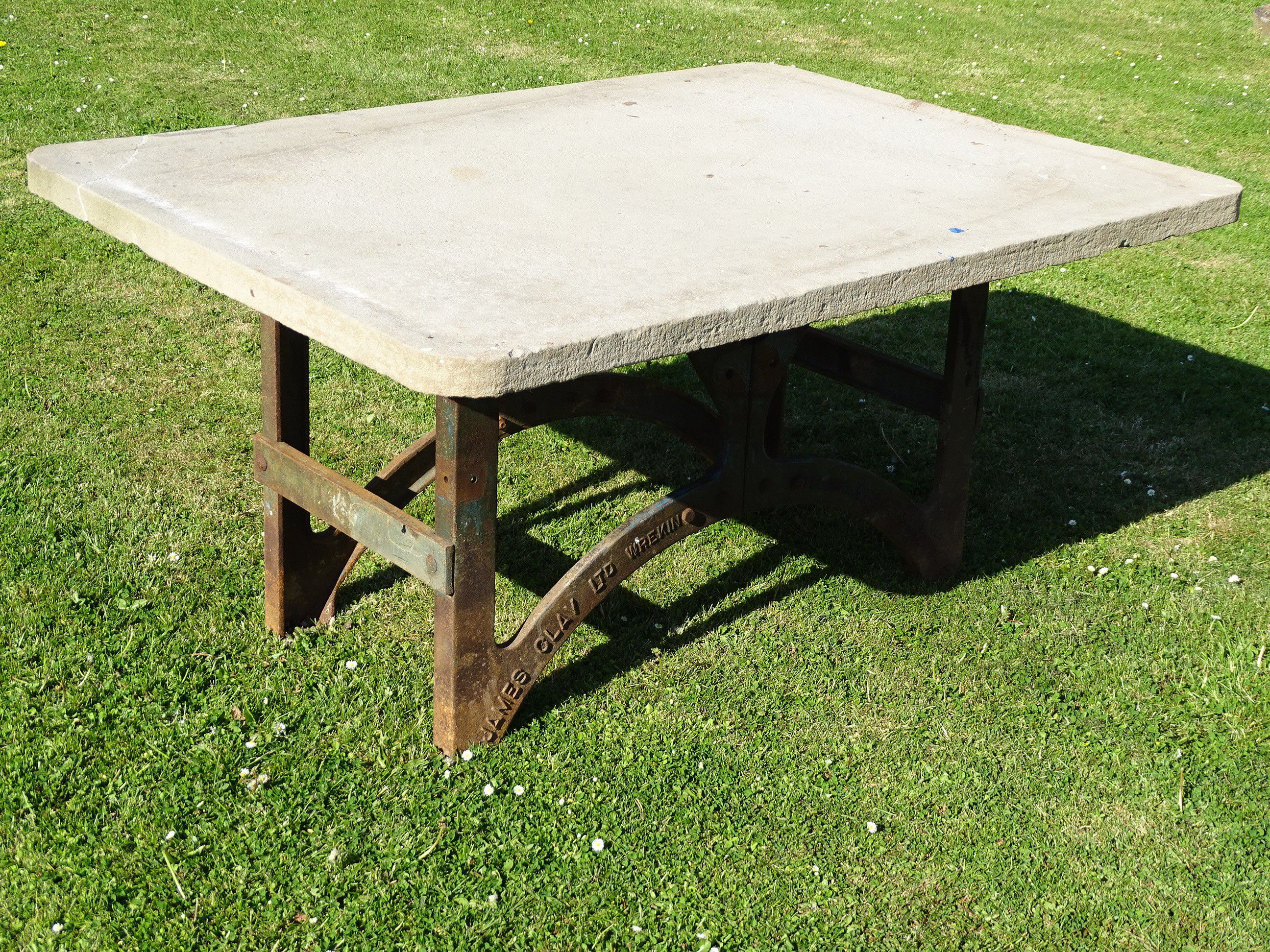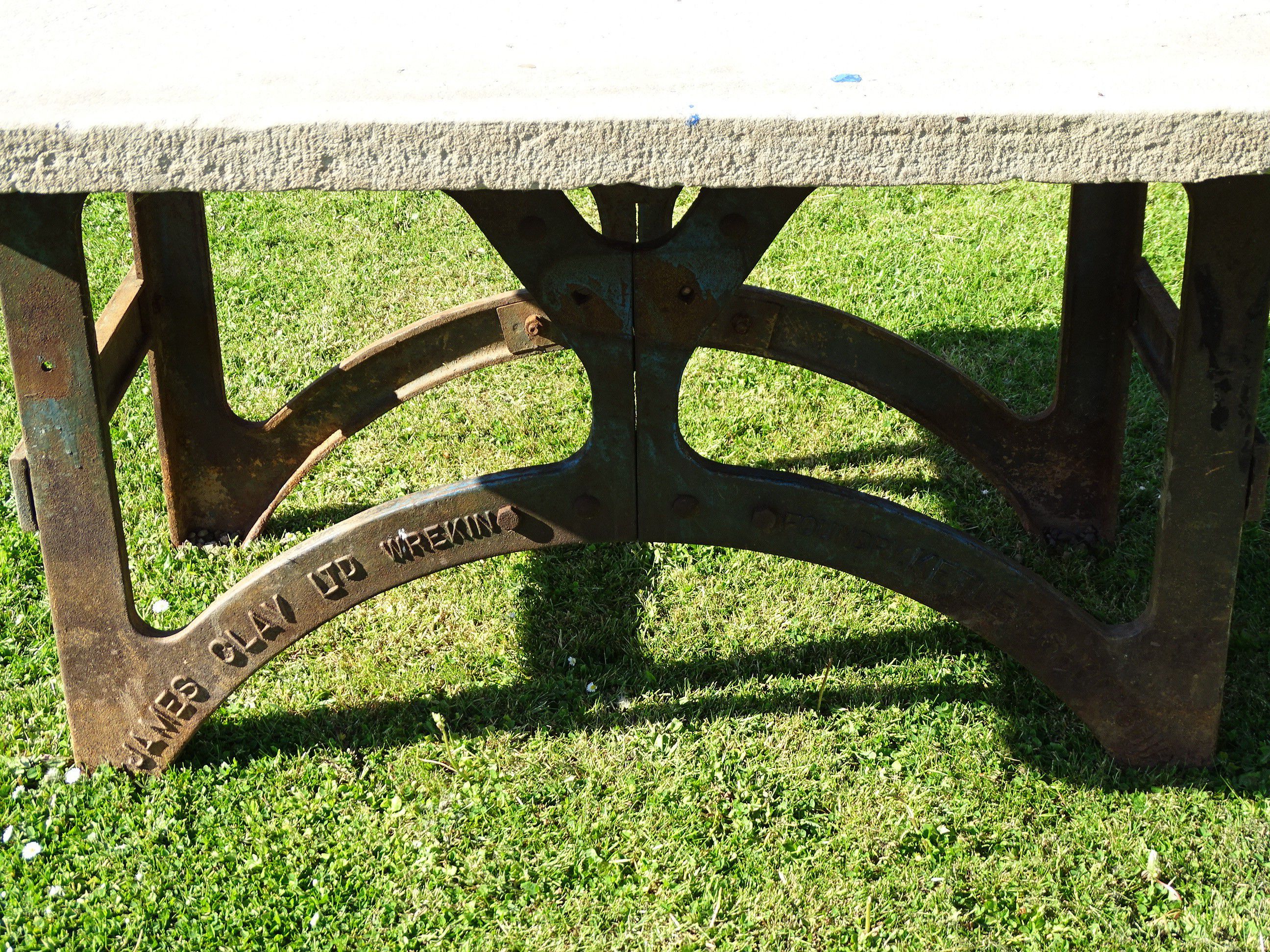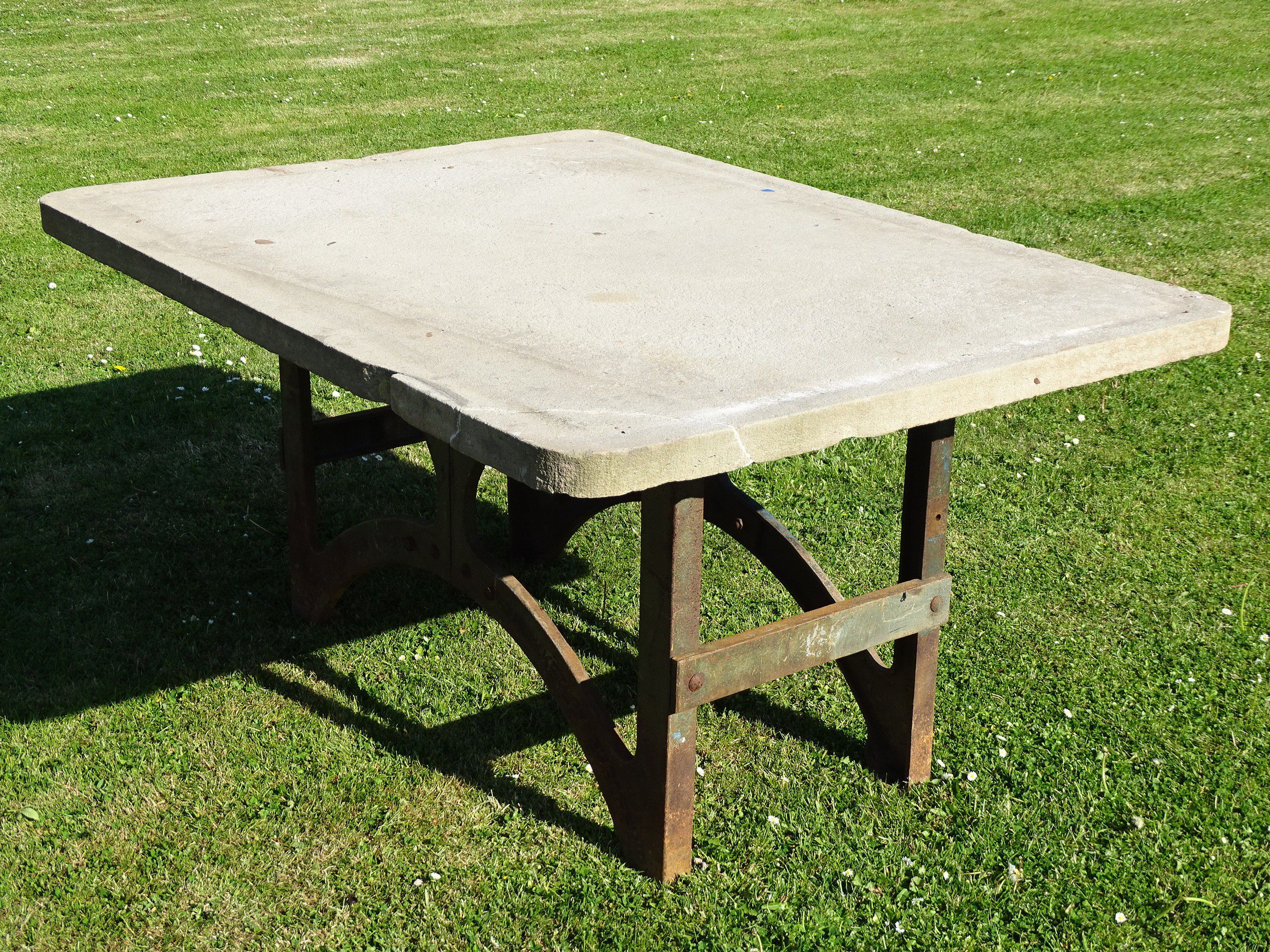 A large stone garden table consisting of a salvaged rectangular salting slab supported on an old cast iron frame This unique combination works well together and could be used either as a dining table or drinks table. The base is stamped 'James Clay Ltd, Wrekin foundery, Ketley, Shropshire'