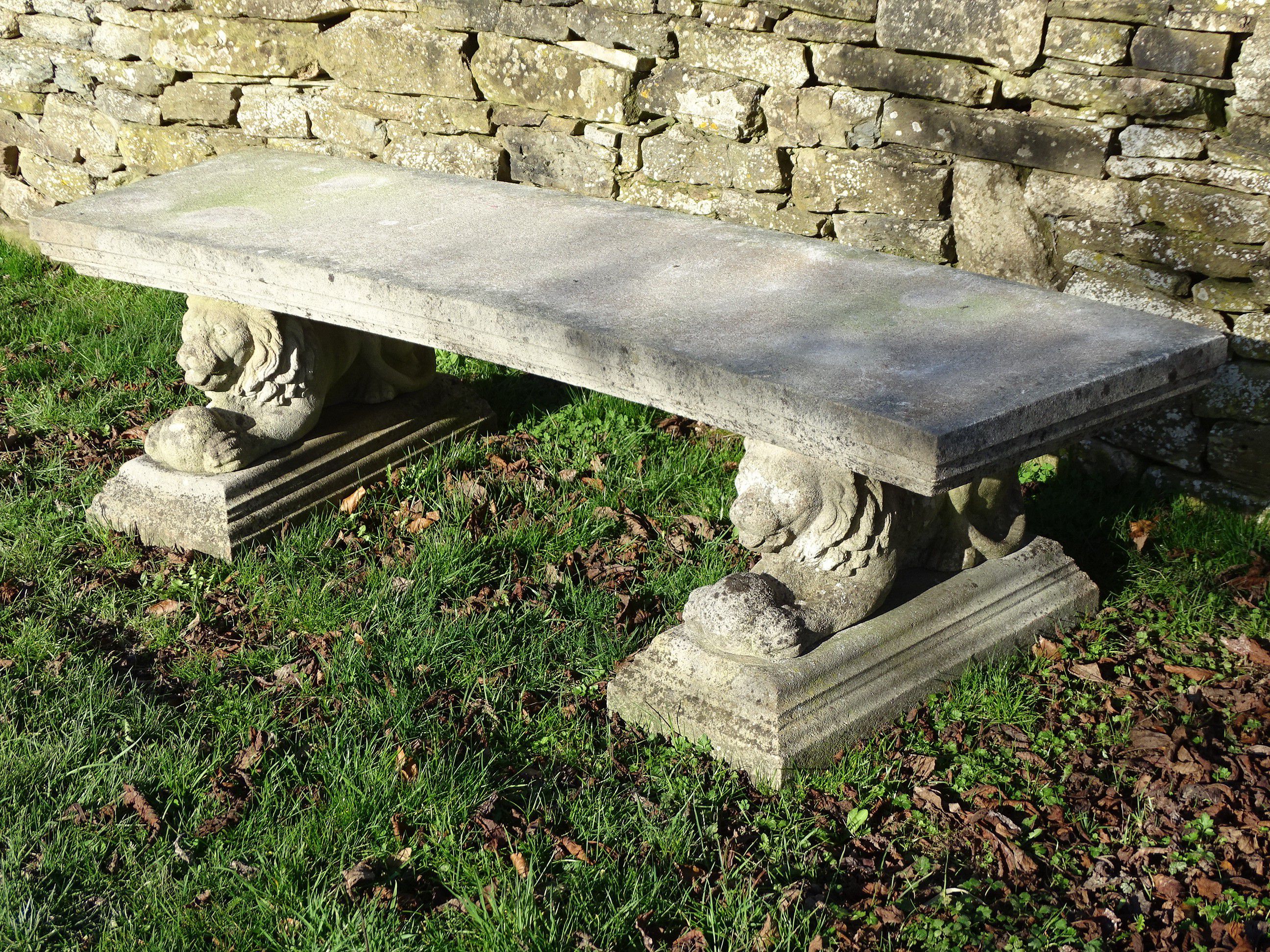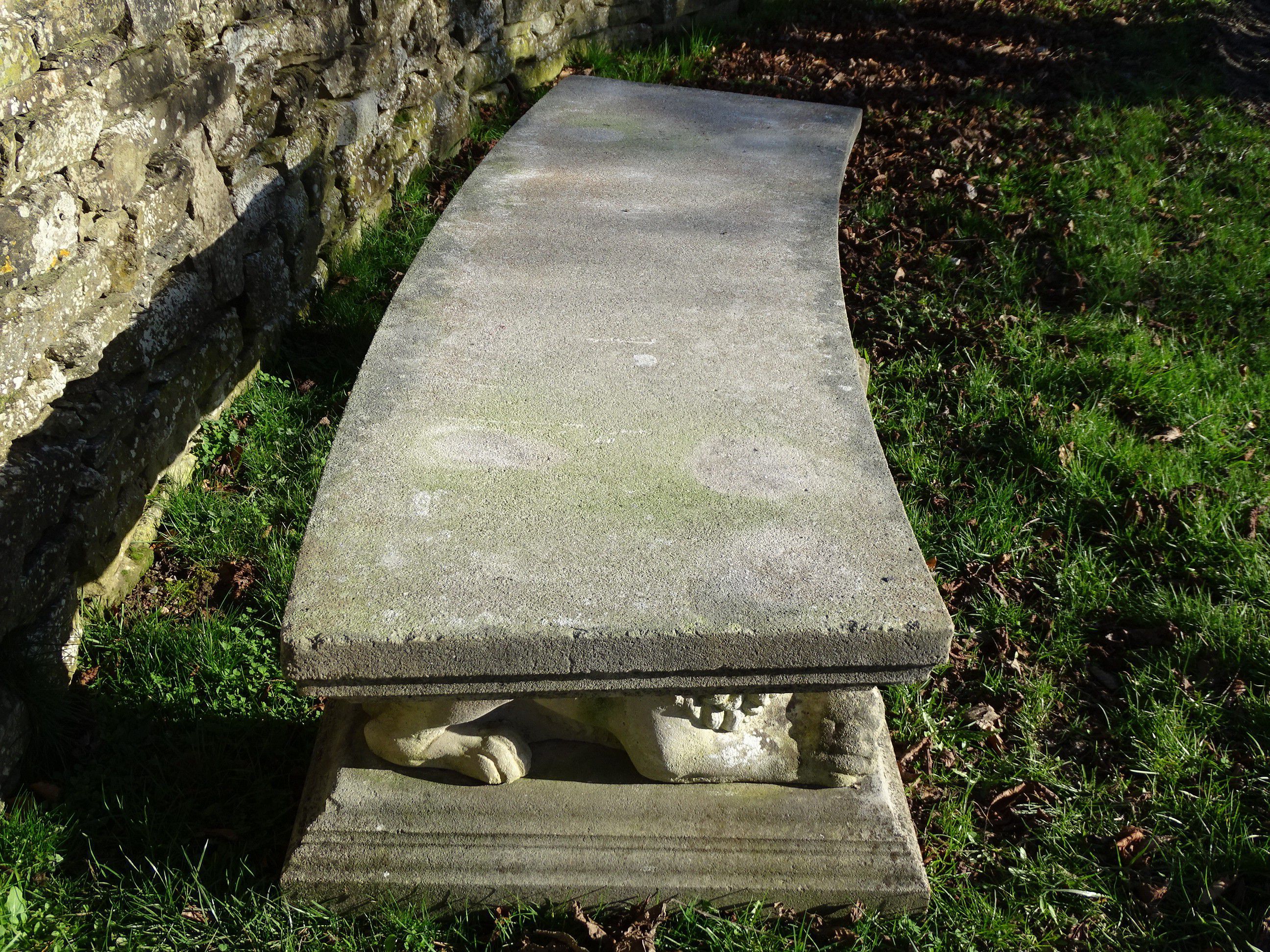 A vintage composition stone bench, the curved top raised on two lions on rectangular plinths. The top on this bench is sound but not very weathered because it was used the other way up in the past. It will develop a weathered patination quite quickly in an outdoor location. This is a large and a relatively heavy item but we offer a delivery service which includes setting up provided there is a suitable site prepared.