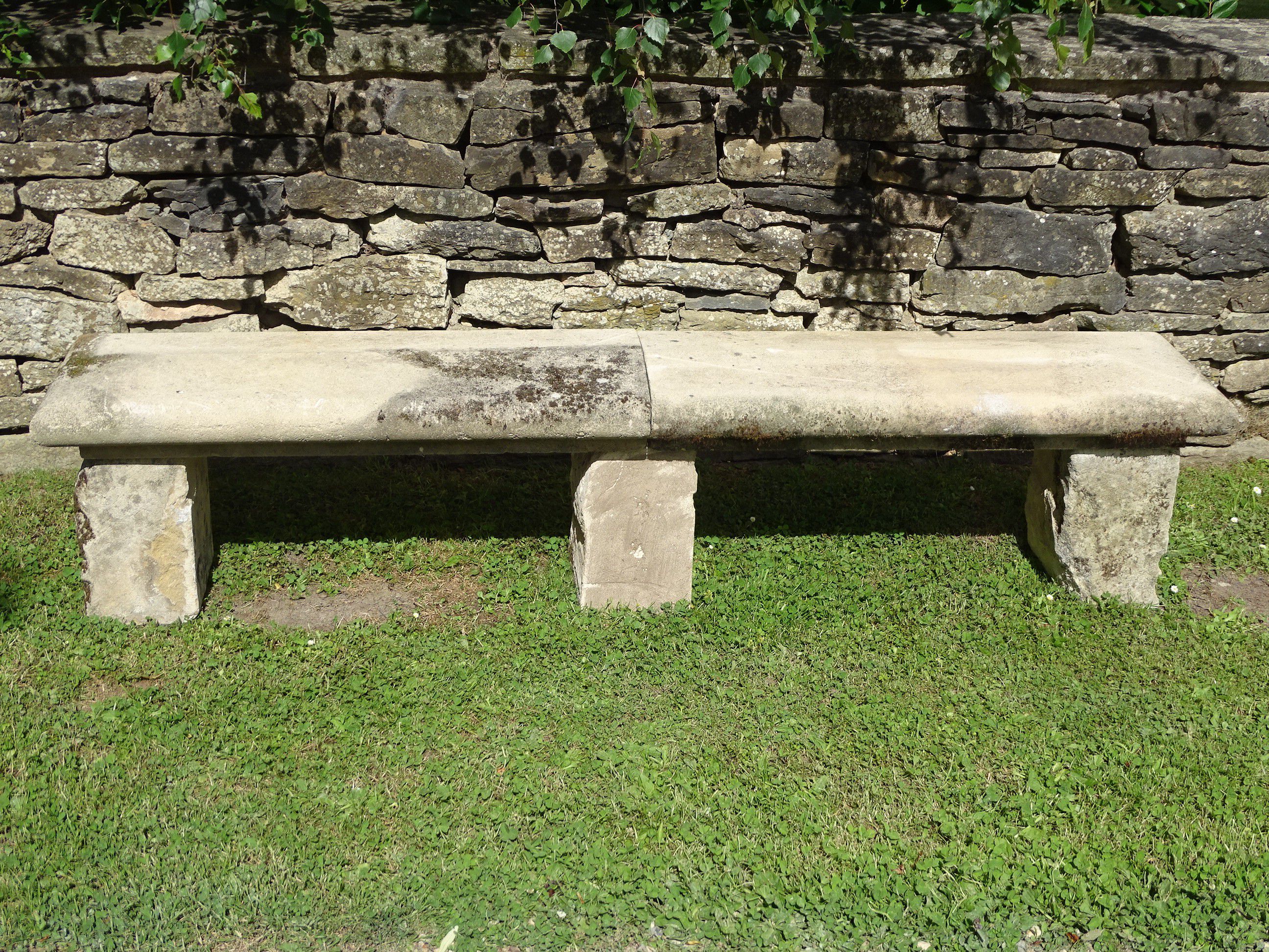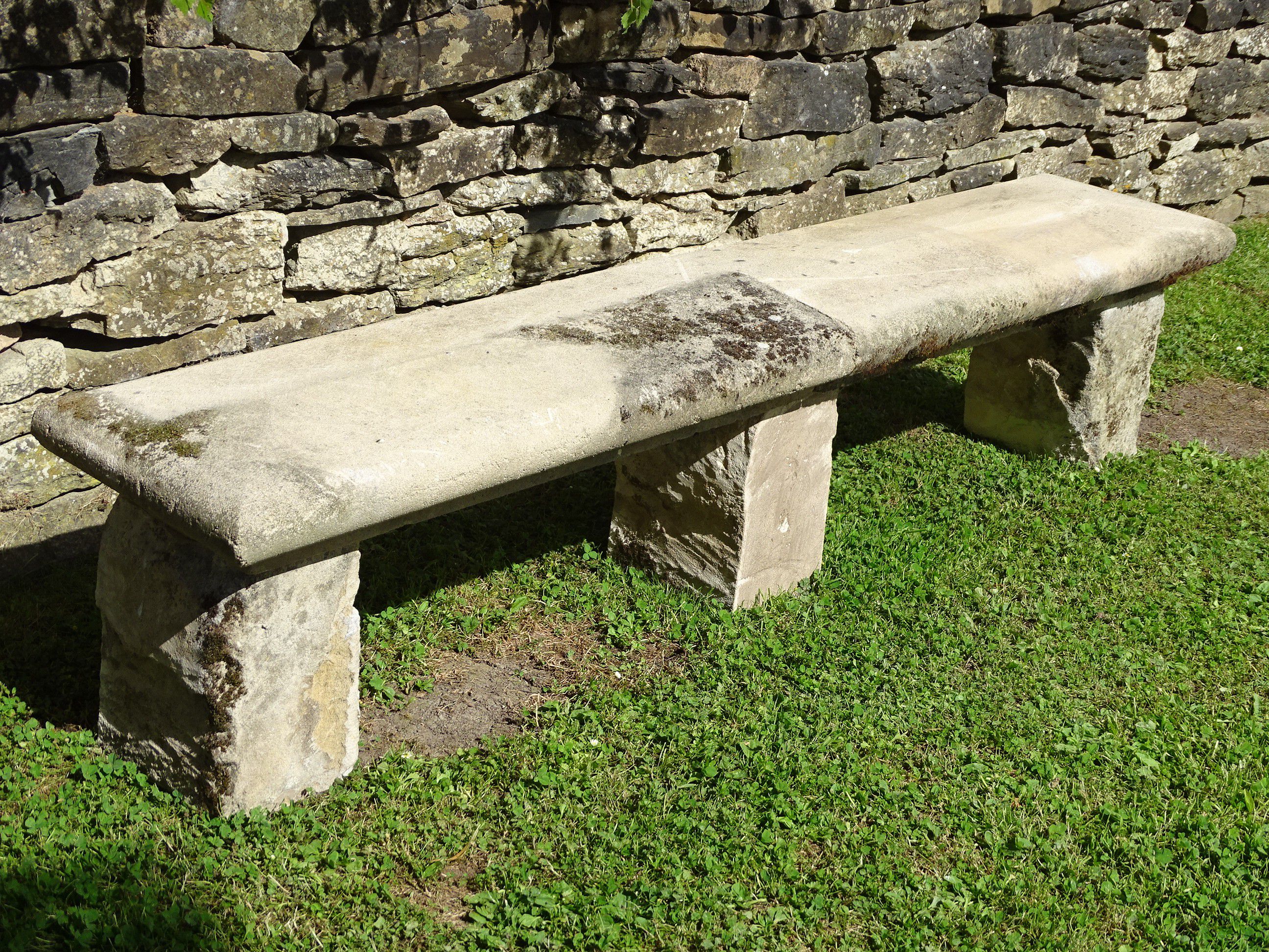 An unusual salvaged composition stone bench comprising two end coping stone sections supported on three salvaged limestone blocks.