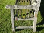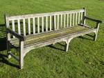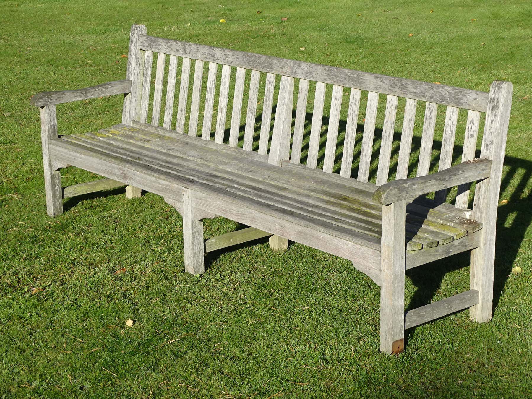 A weathered teak park bench, eight feet long with a Lister maker's label on one end.