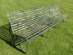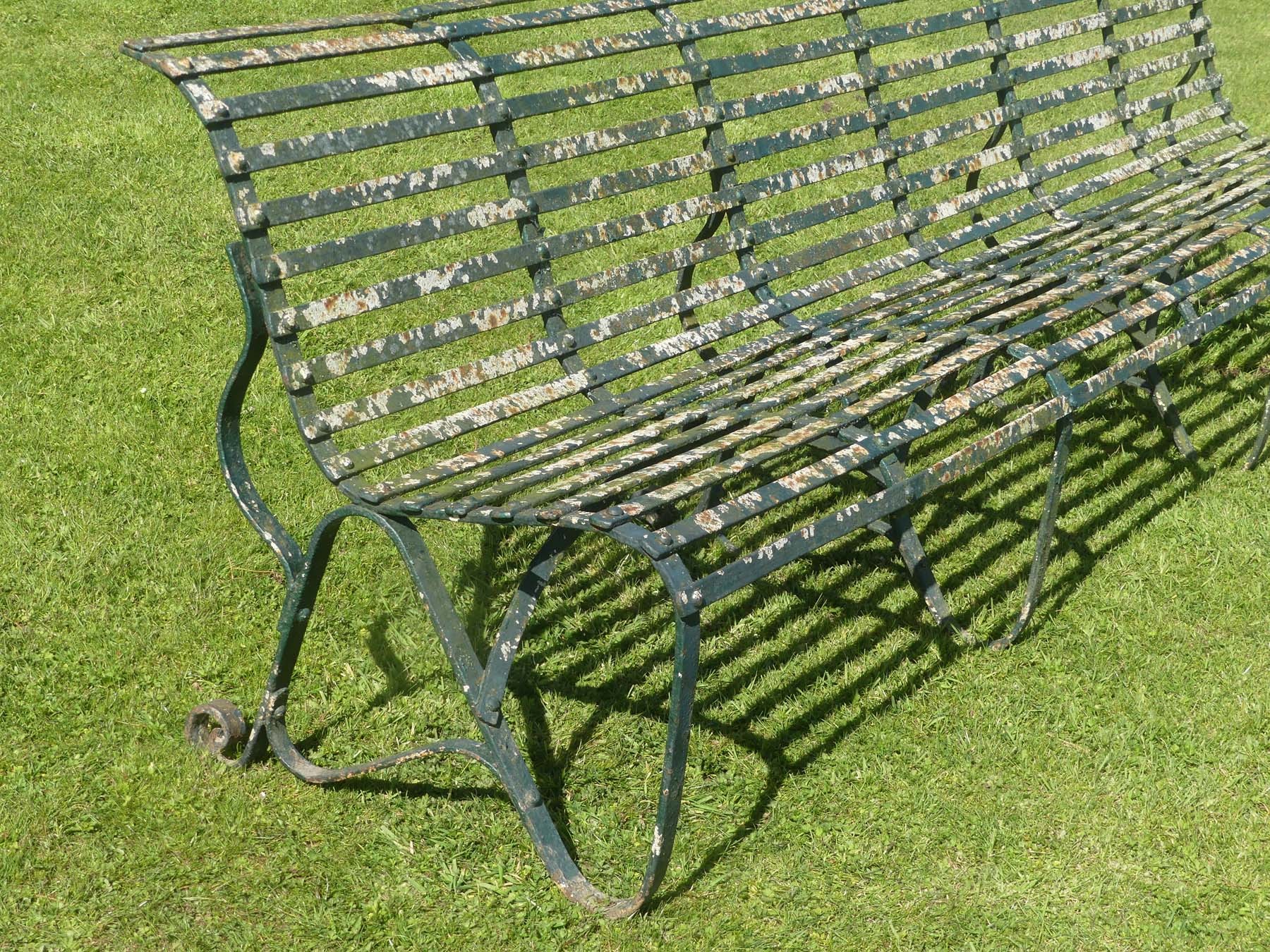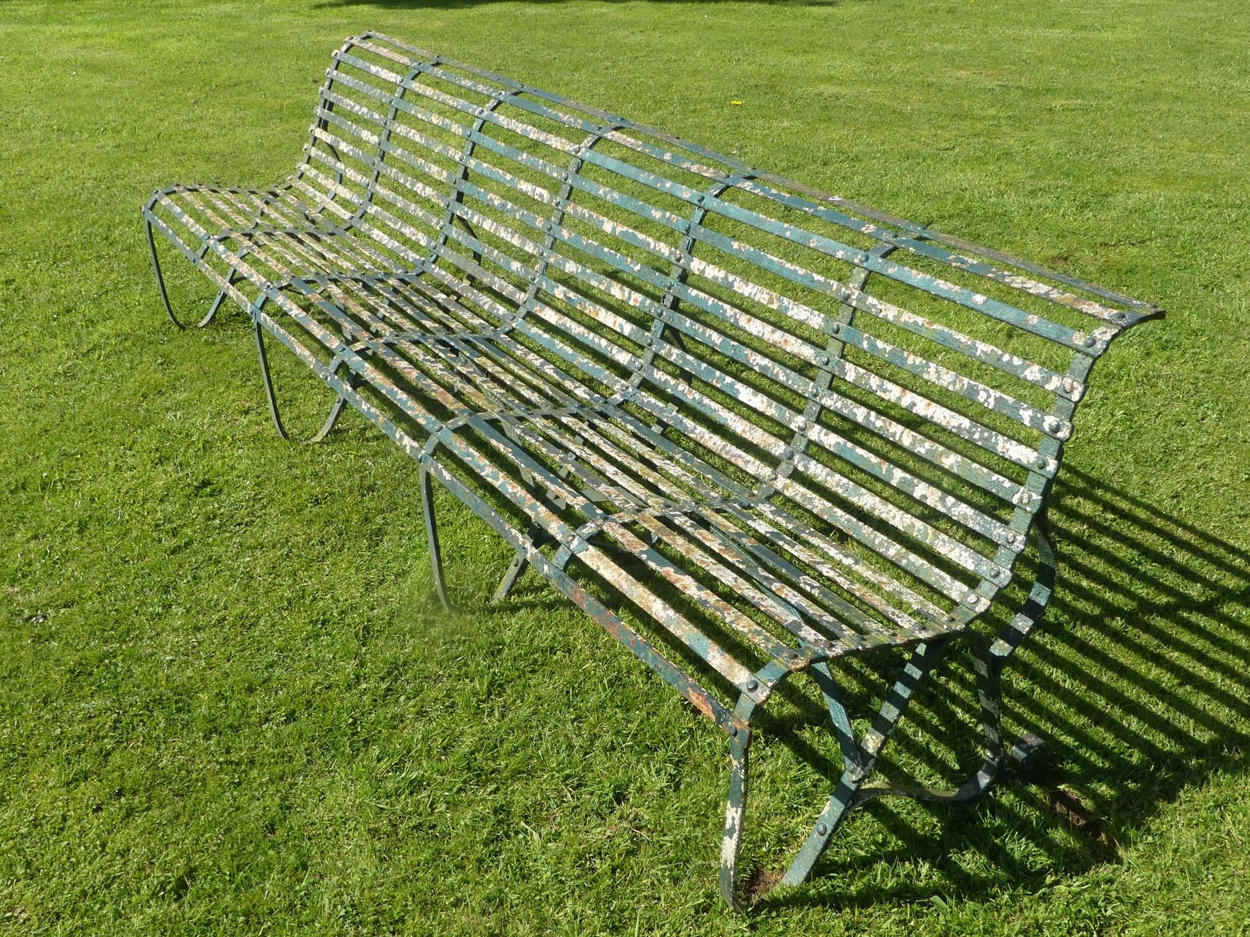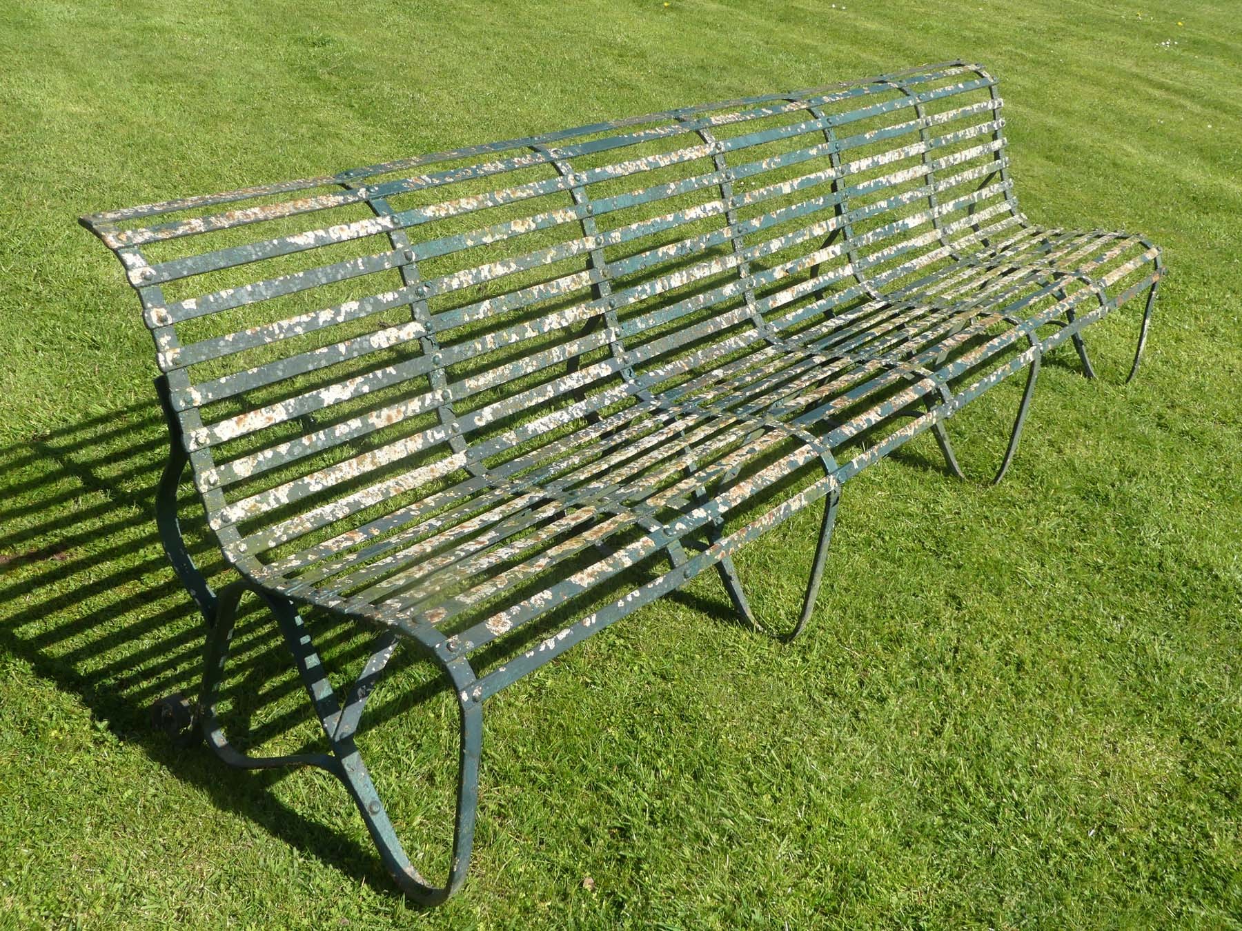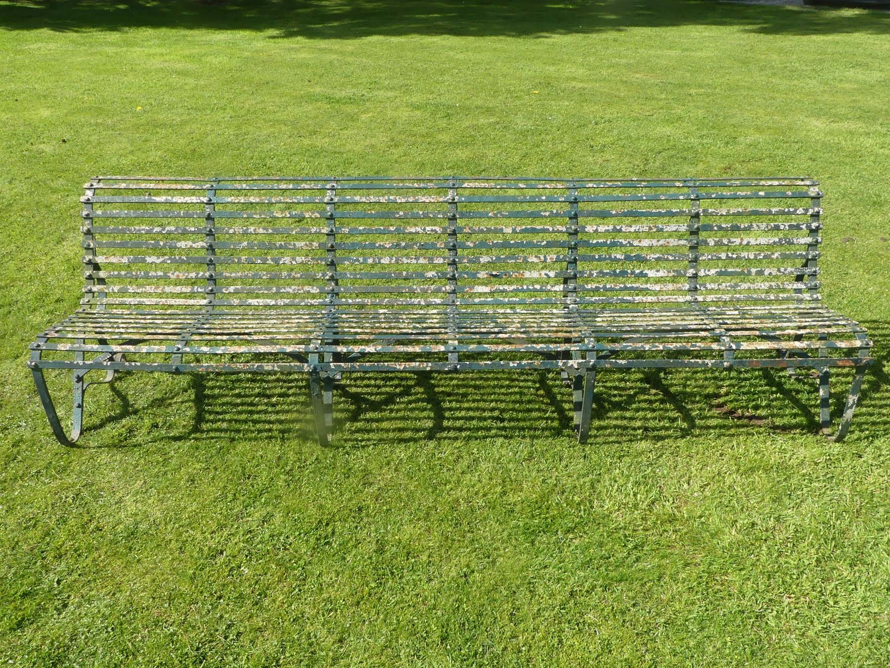 An unusually long antique garden bench made from riveted wrought iron, the seat and back rails on four shaped supports. This bench is structurally sound but is in ex garden condition with distressed paintwork throughout. It would make an excellent games seat for spectators alongside a tennis court or croquet lawn.