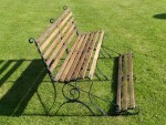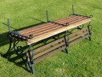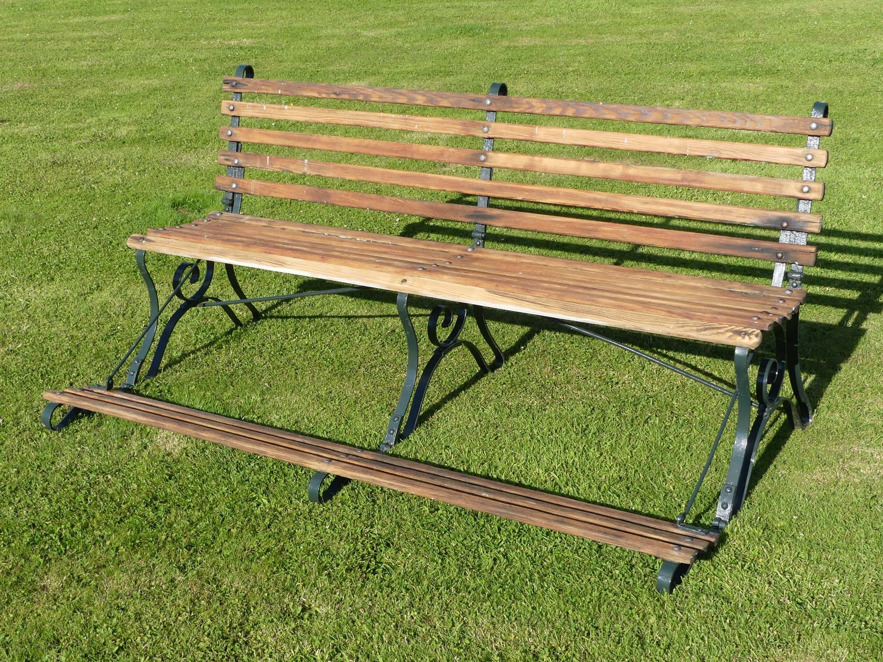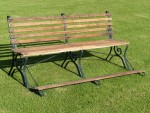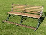 A vintage folding garden bench with wooden rails, probably cedar, on three wrought iron supports. This bench has an unusual but very effective folding mechanism to allow it to be more easily moved and stored. Antique and vintages benches with foot rests were often referred to as 'games seats' and were designed for the benefit of spectators watching social sports such as croquet and tennis.