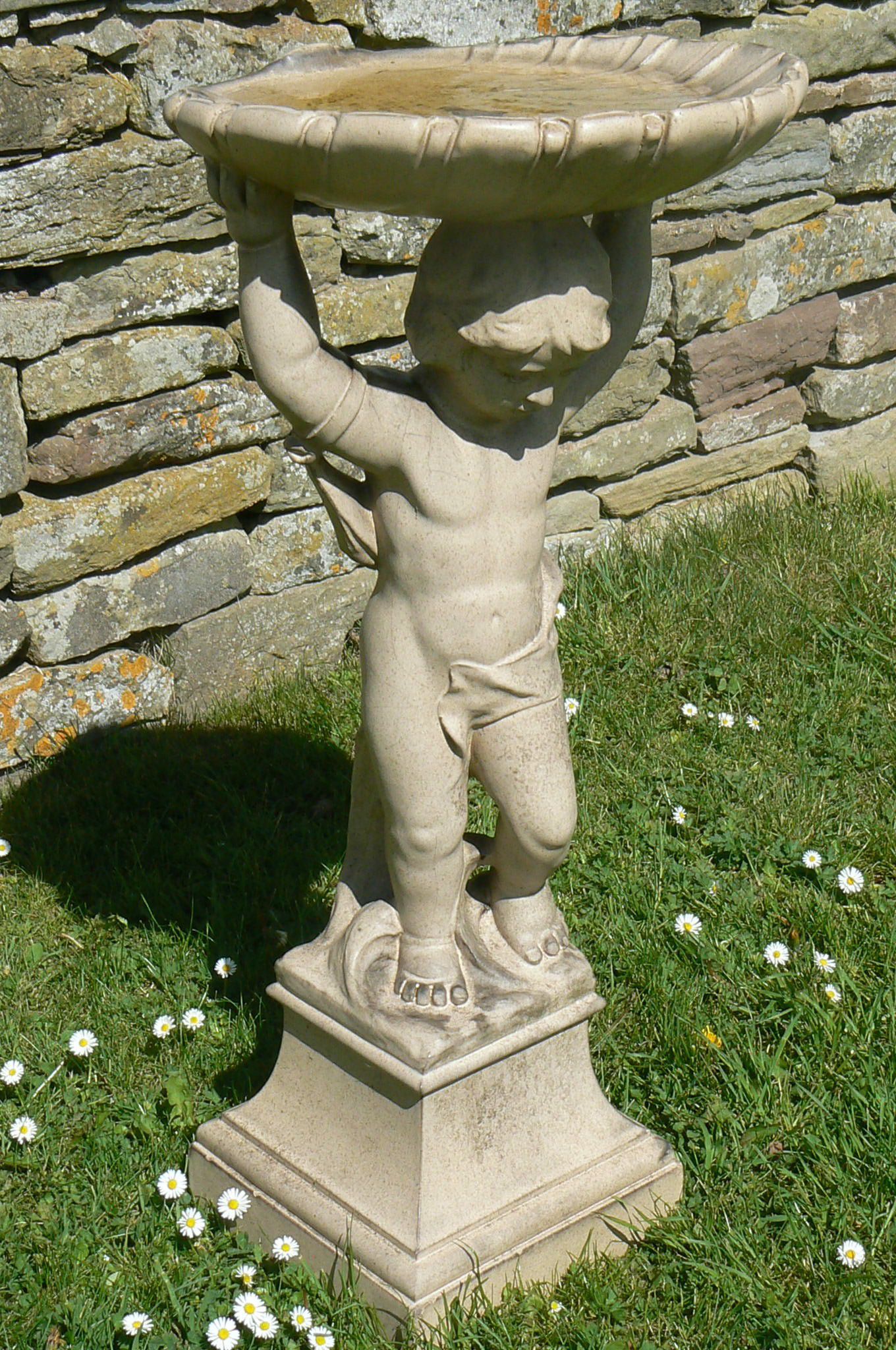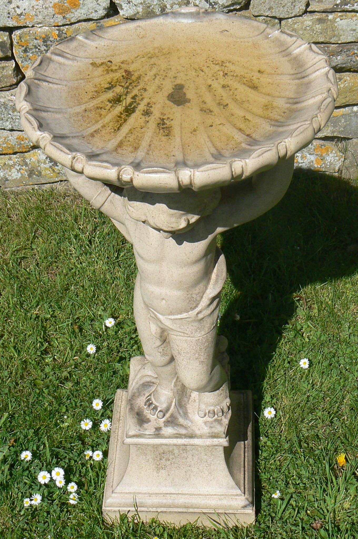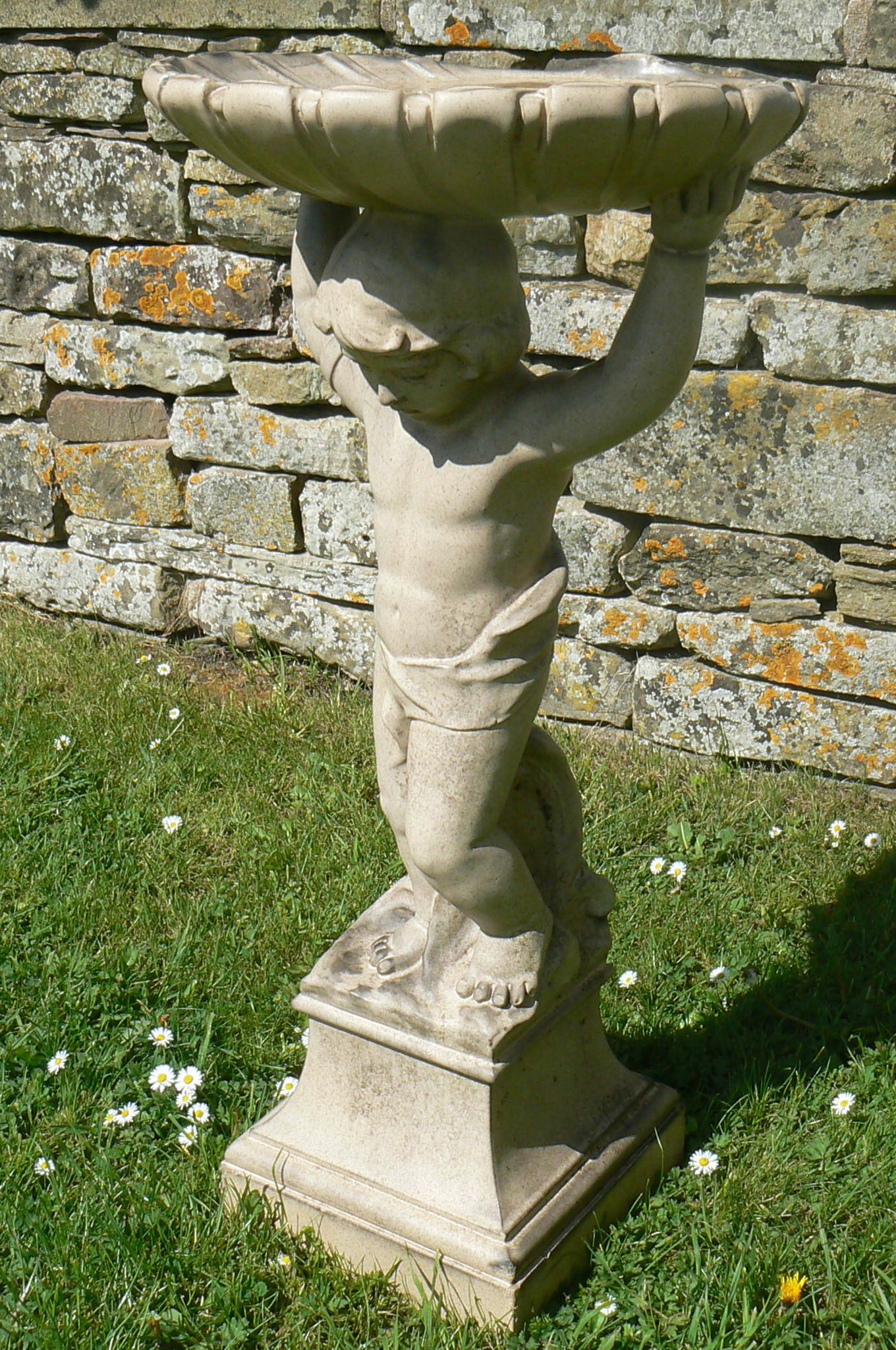 A vintage Lefcoware birdbath formed as a putto standing on a square plinth holding up a scallop shaped bowl. This birdbath was one of the most successful designs produced by the Leeds Fireclay Company and this is a particularly good example with crisp detail and very little damage apart from a chip within the bowl.