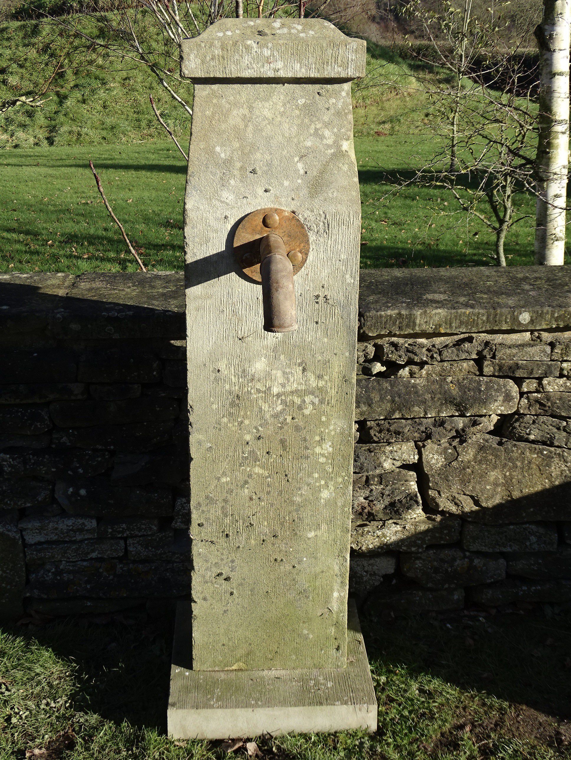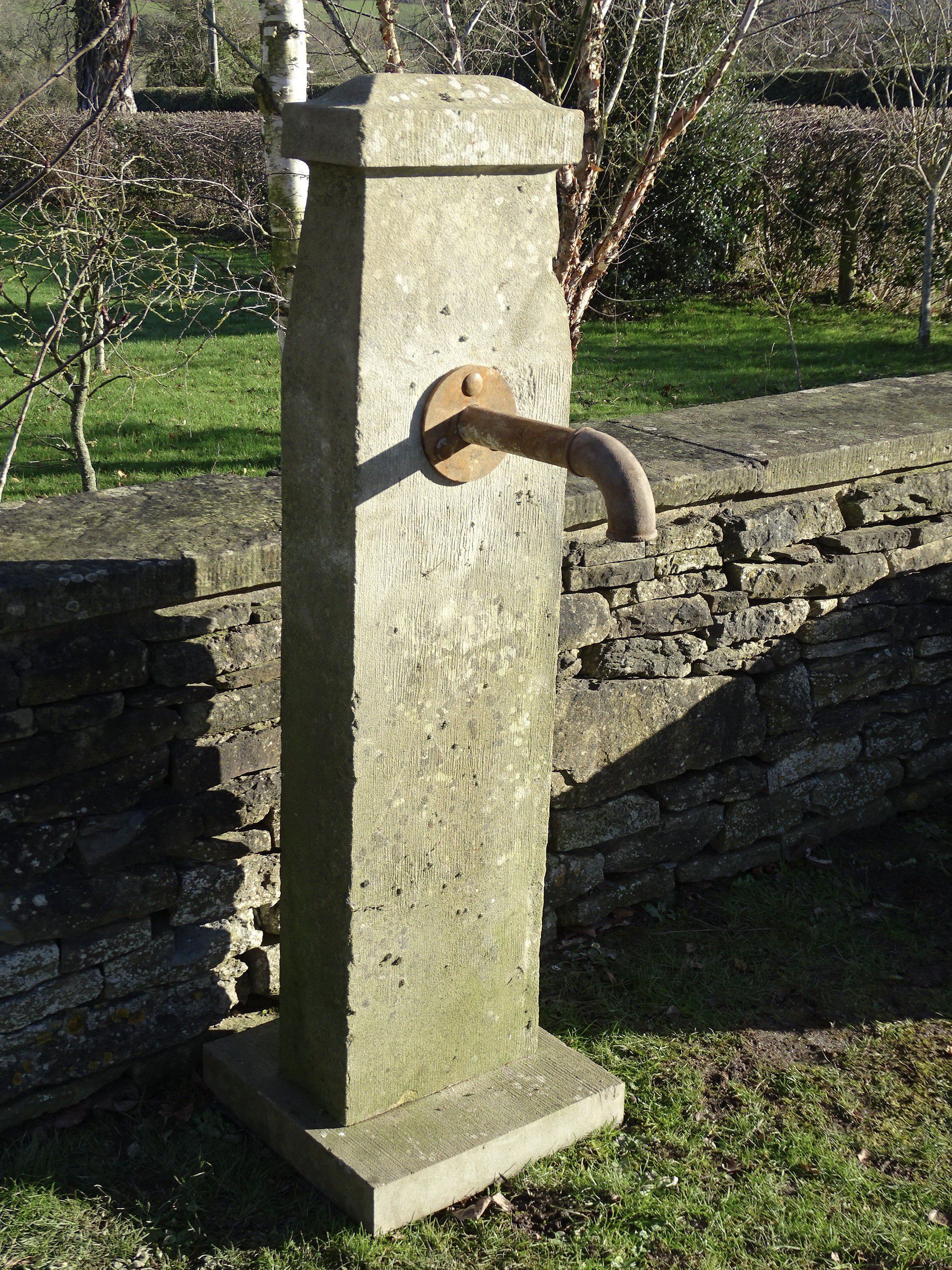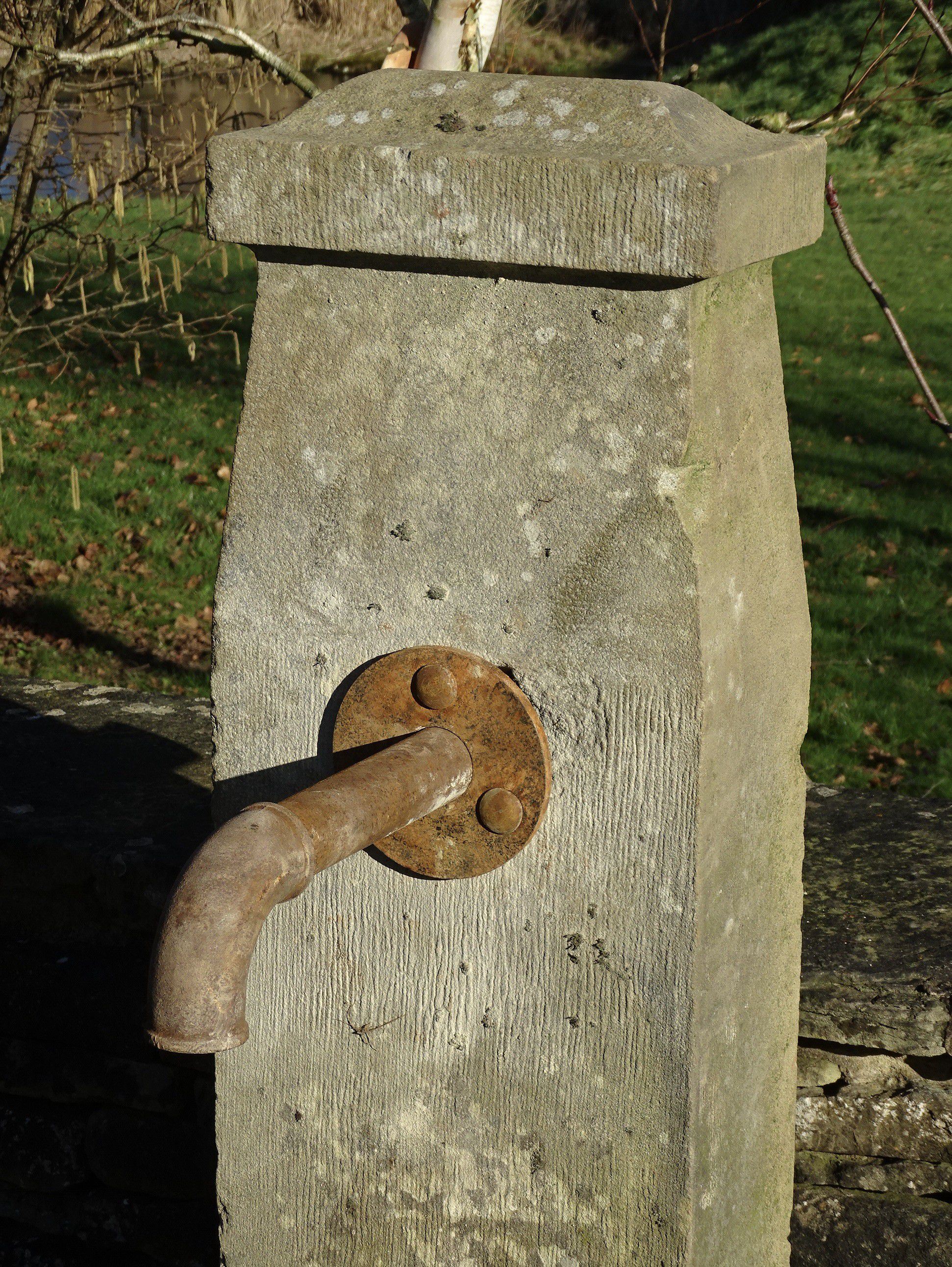 A salvaged sandstone fountainhead adapted from an old Derbyshire gatepost, the cast iron spout projecting forwards and downwards so that it is ideal for setting up with a large stone trough. It works very well for size and colour with the large Gloucestershire bow fronted stone trough, our reference 3056.