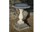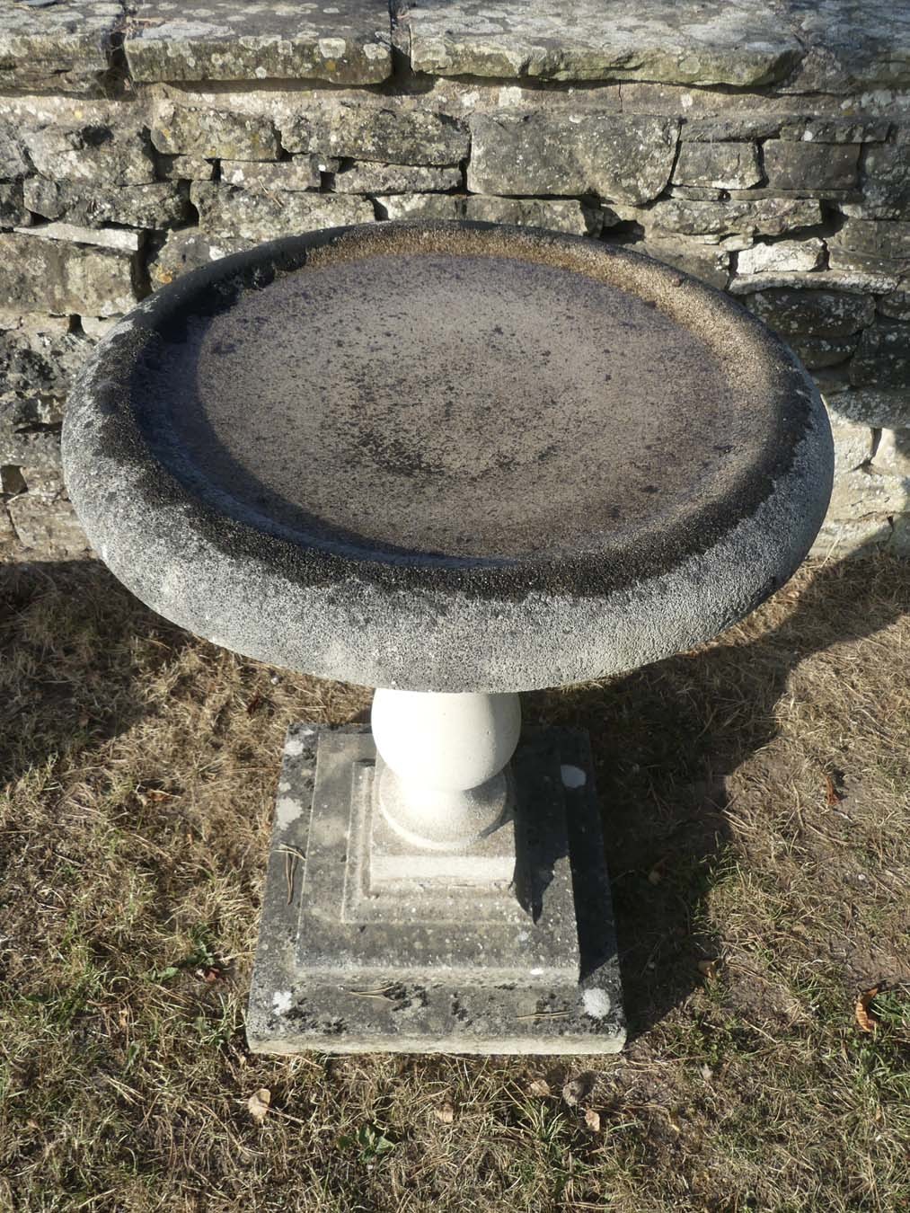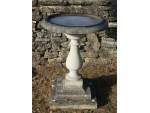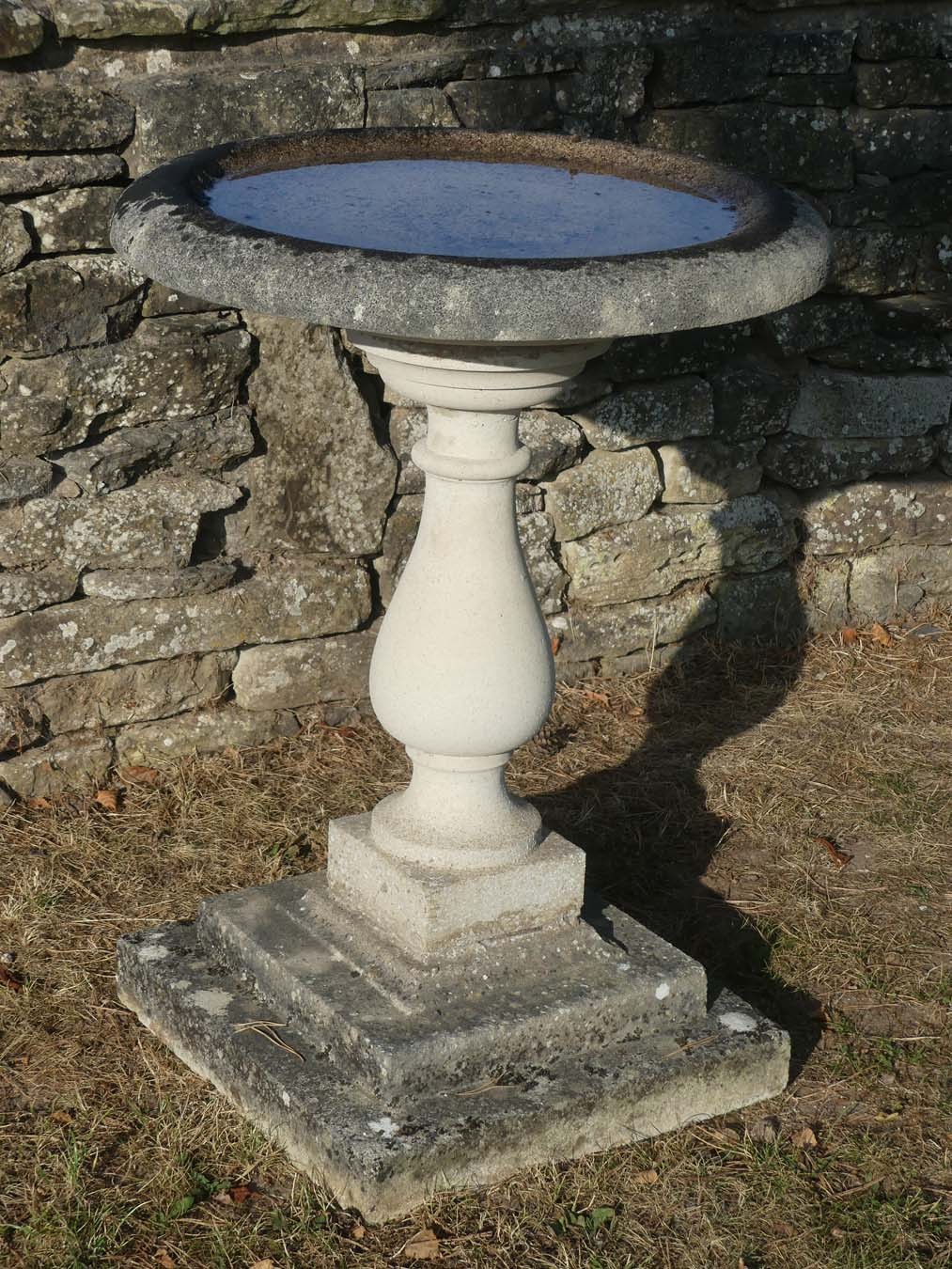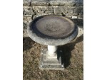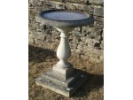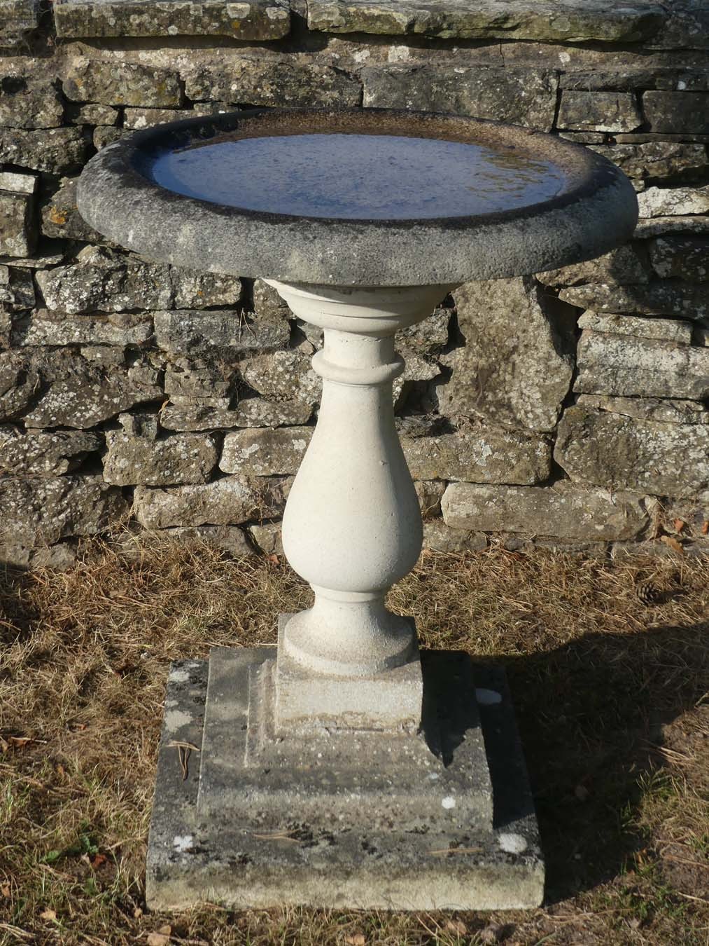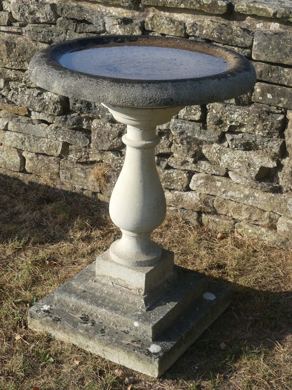 A weathered composition stone garden birdbath, the round bath on a baluster column and stepped base. This is a good sized birdbath which holds plenty of water. There is a crack through the top of the baluster column (visible in our photos) but it doesn't prevent this being a fully functional birdbath.