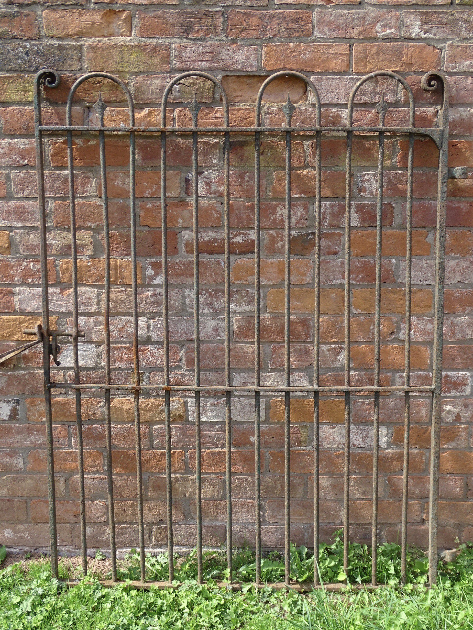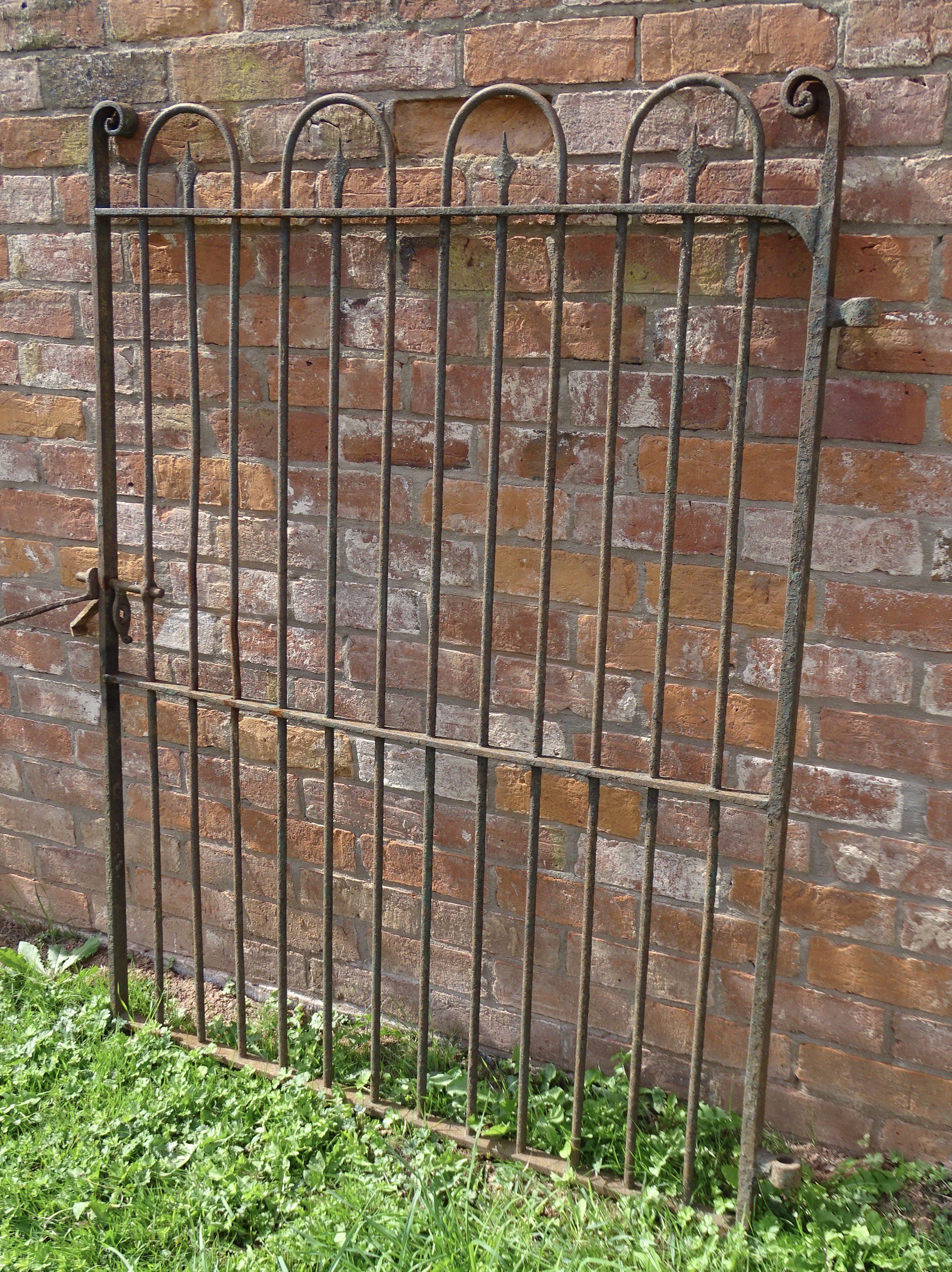 An antique wrought iron garden gate, handmade throughout with scrolled end terminals and original hinges and latch.