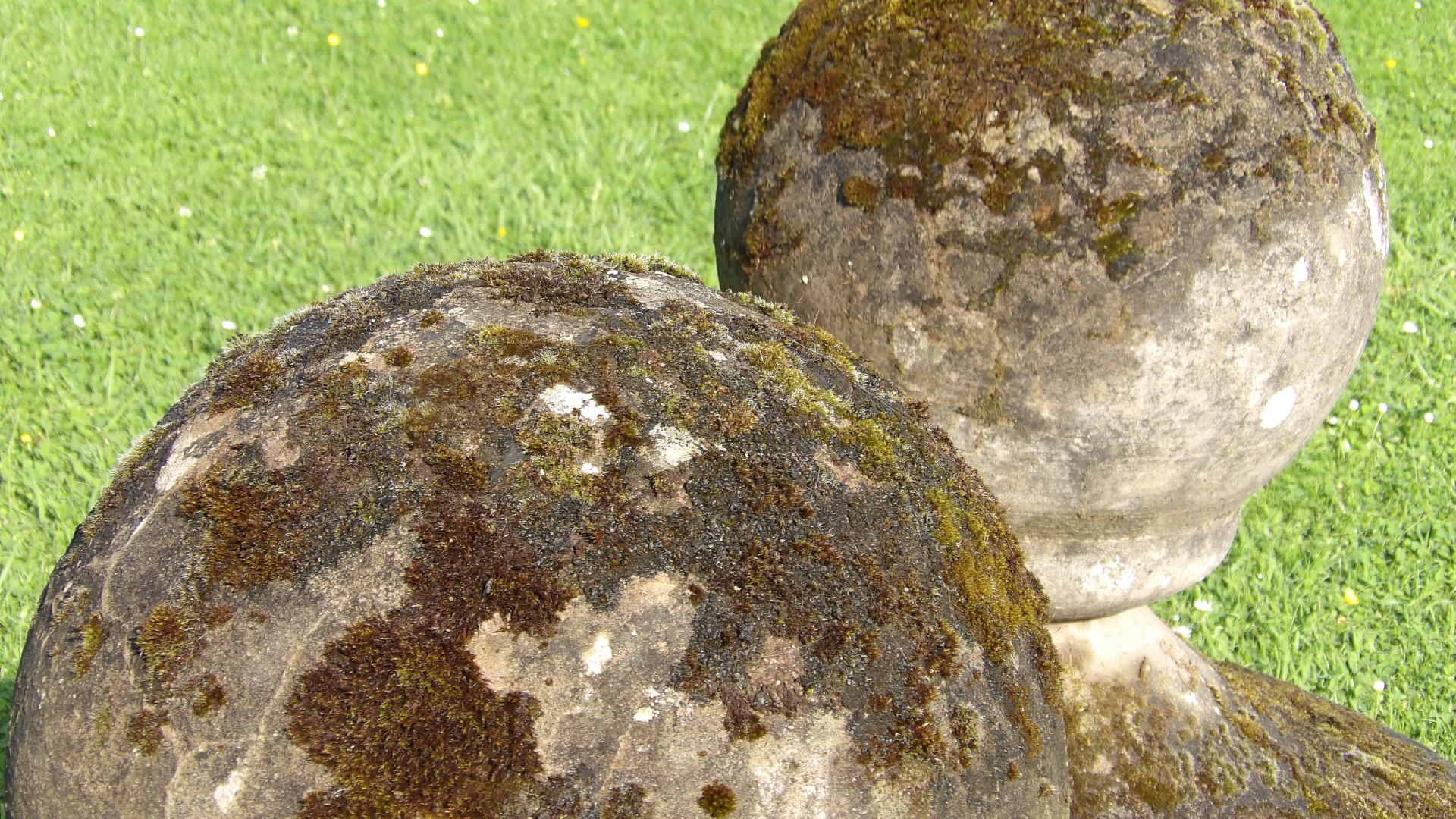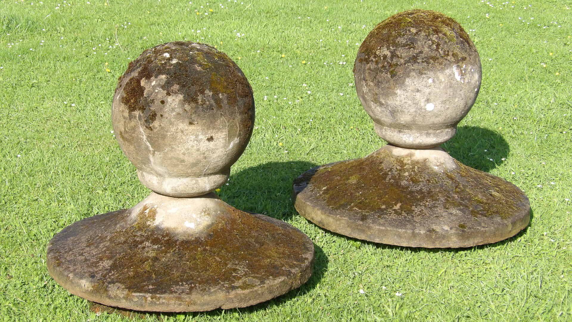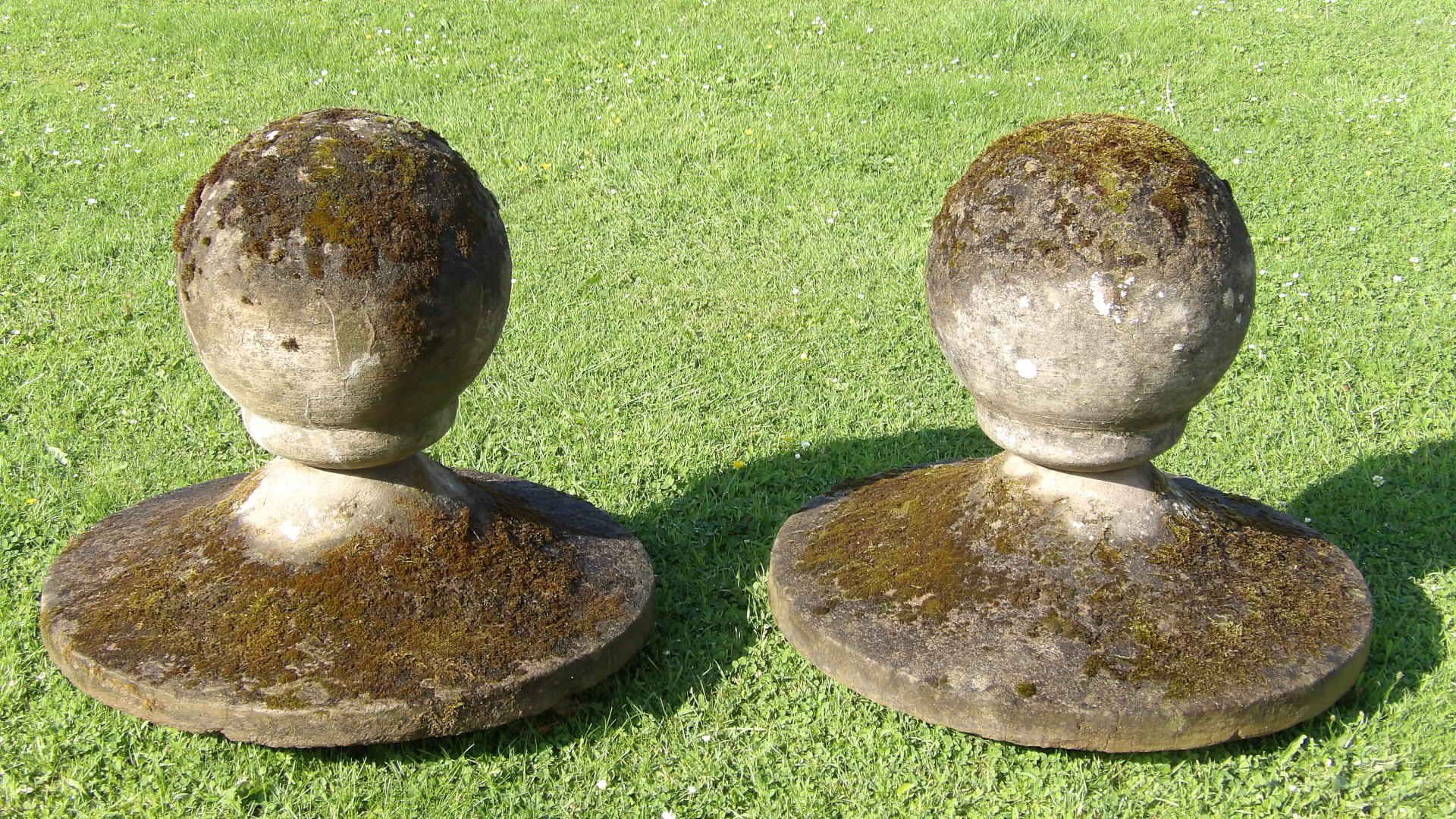 A pair of old composition stone finials with a very well developed mossy patination, the round balls permanently fixed to large round bases. These finials were once in the grounds of a large house on the western side of the Malvern Hills which was damaged by fire.
