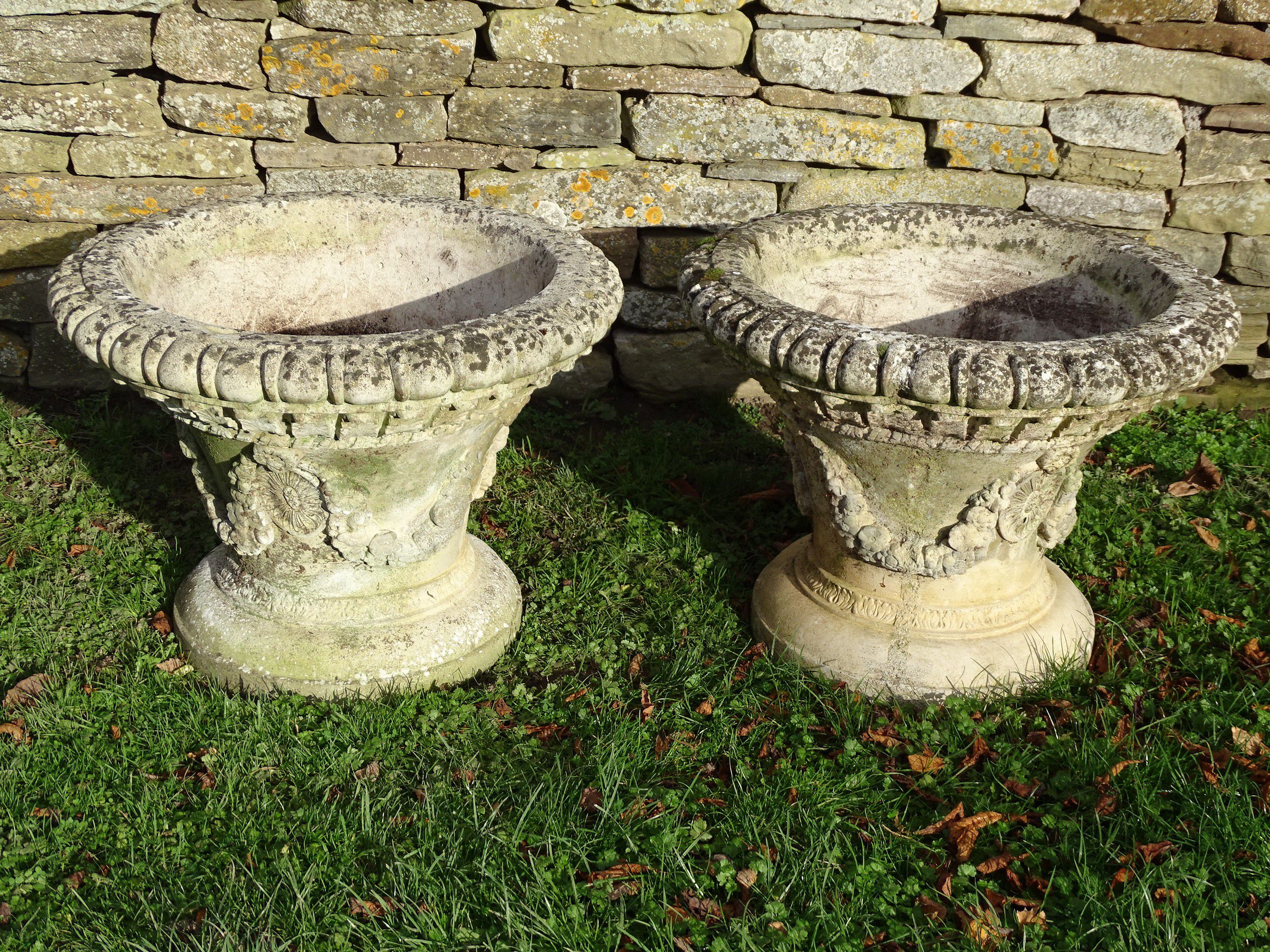 A pair of weathered composition stone garden planters, each cast in one piece with boldly lobed rims and decorated with classical swags. This is an unusual and attractive design which allows versatile planting.