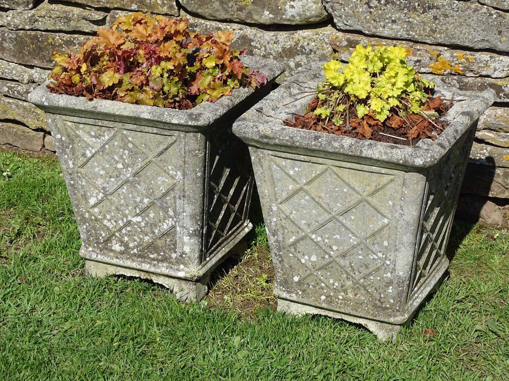 A pair of well weathered composition stone square planters with tapered latticed sides.