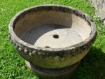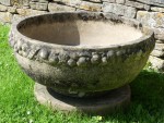 A round composition stone bowl on a two part stepped round sandstone plinth. Decorated around the rim with a band of fruit and flowers, this makes a large and unusual feature planter with good internal planting capacity.