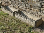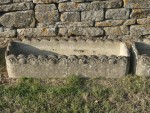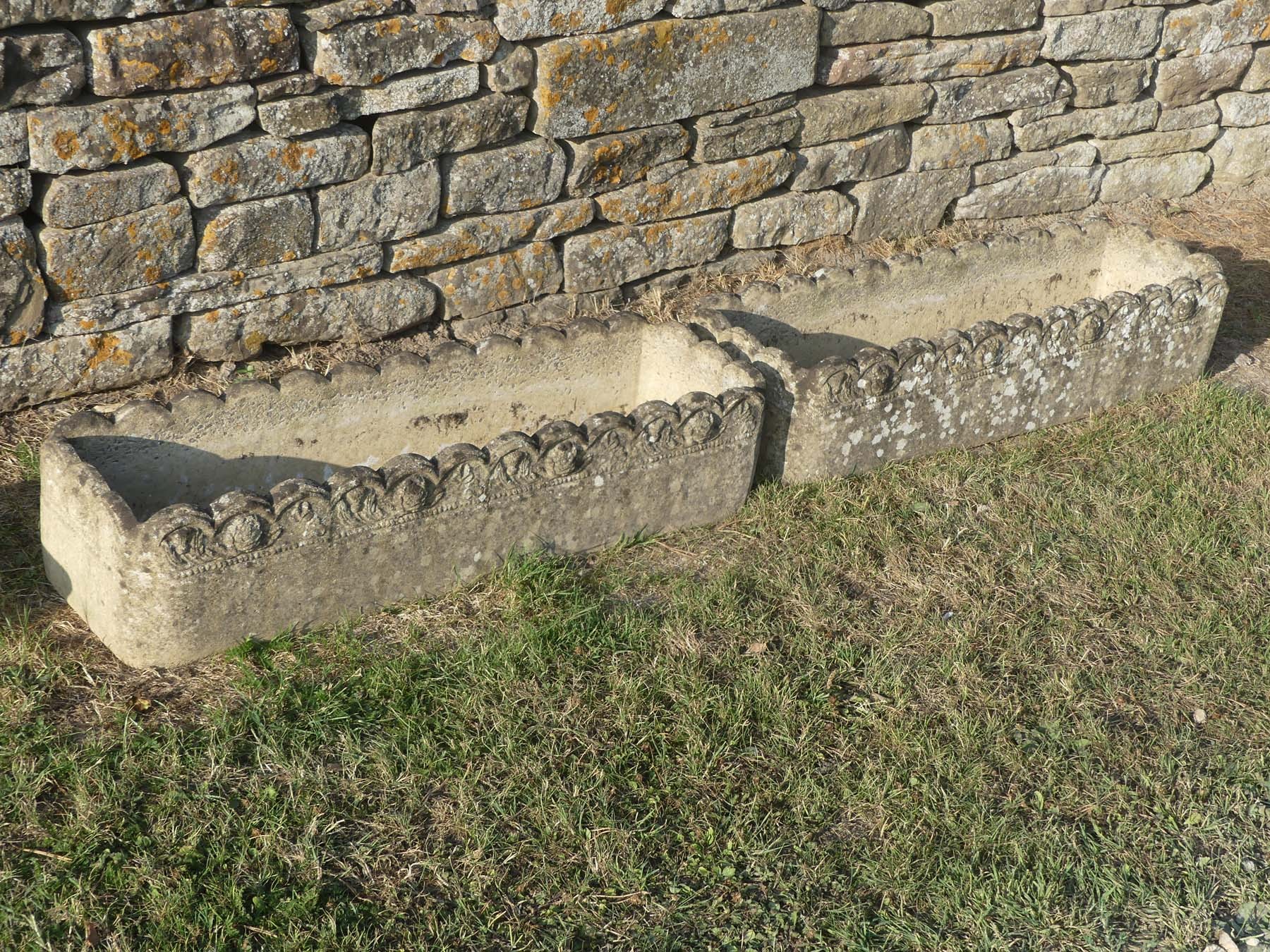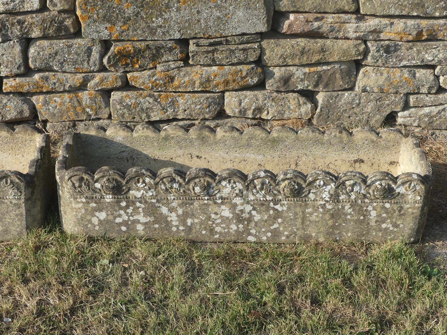 A pair of rectangular garden planters made from composition stone, the sides decorated with flowers within a hooped rim and with drainage through the base.