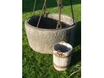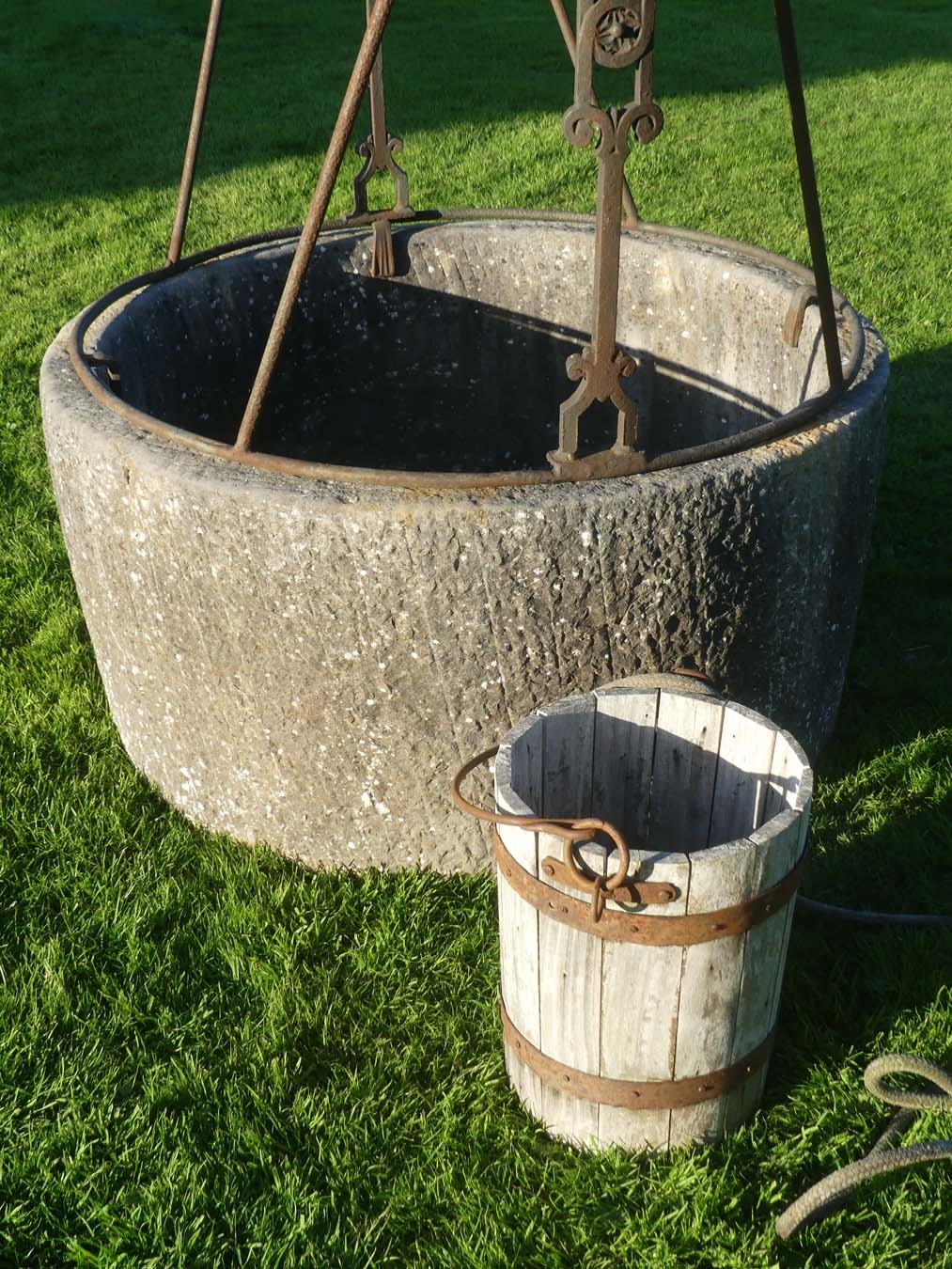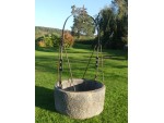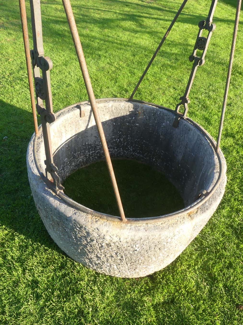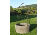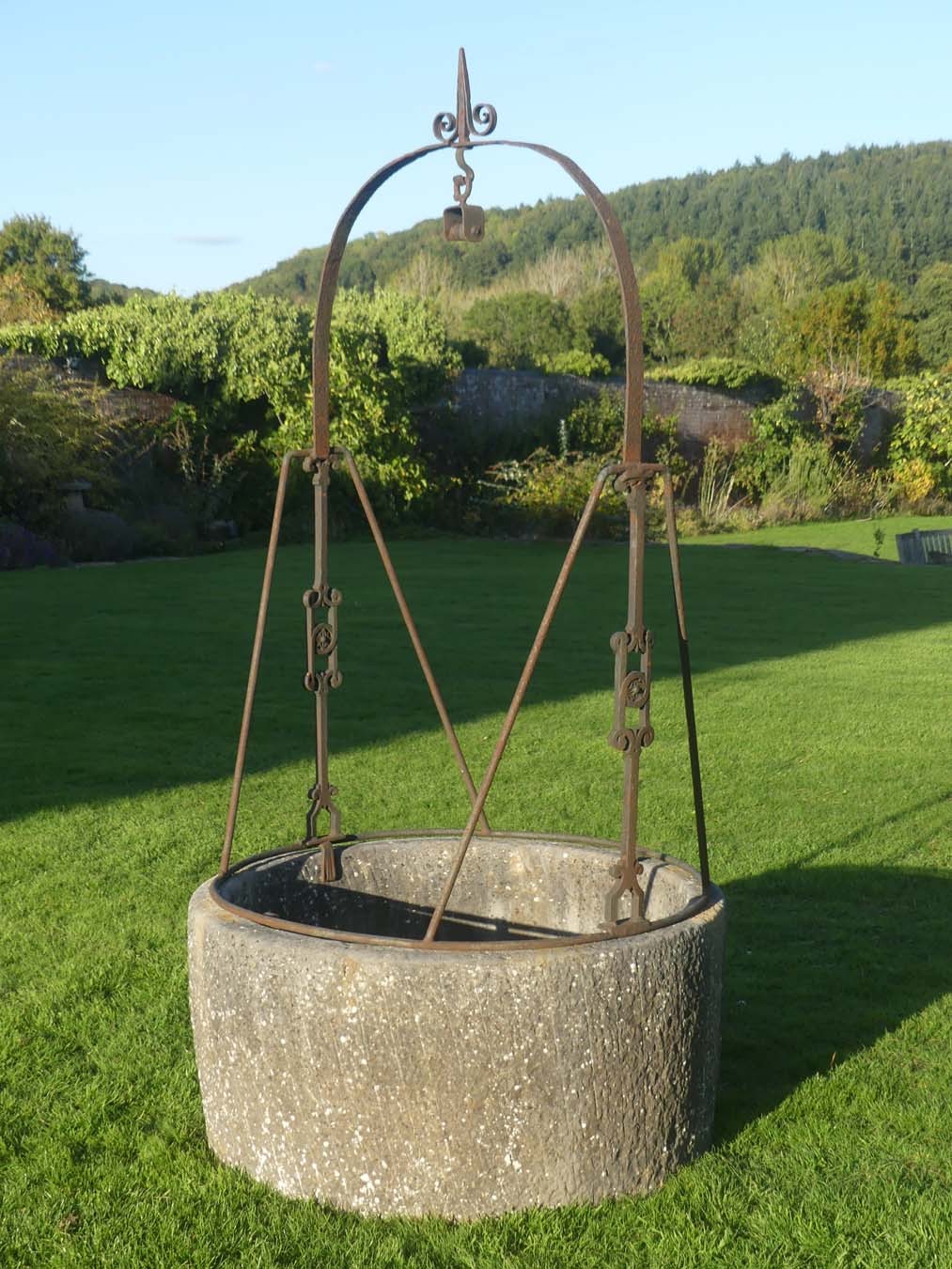 A carved stone circular wellhead, open to the ground and with a later wrought iron overthrow which fits within the stone circle. This is a decorative item which was not a functional wellhead but it makes an attractive and unusual garden feature.