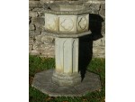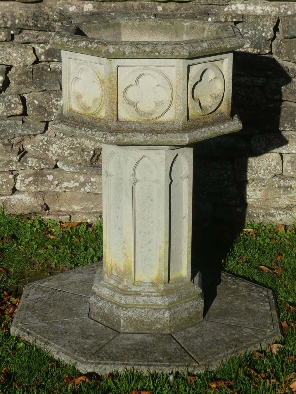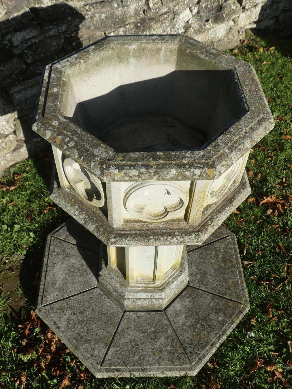 A weathered garden planter modelled as an octagonal font with Gothic decoration standing on an octagonal base. This is an attractive planter with good weathering and plenty of planting space. There is a maker's stamp inside the bowl reading 'Fosstone York'.