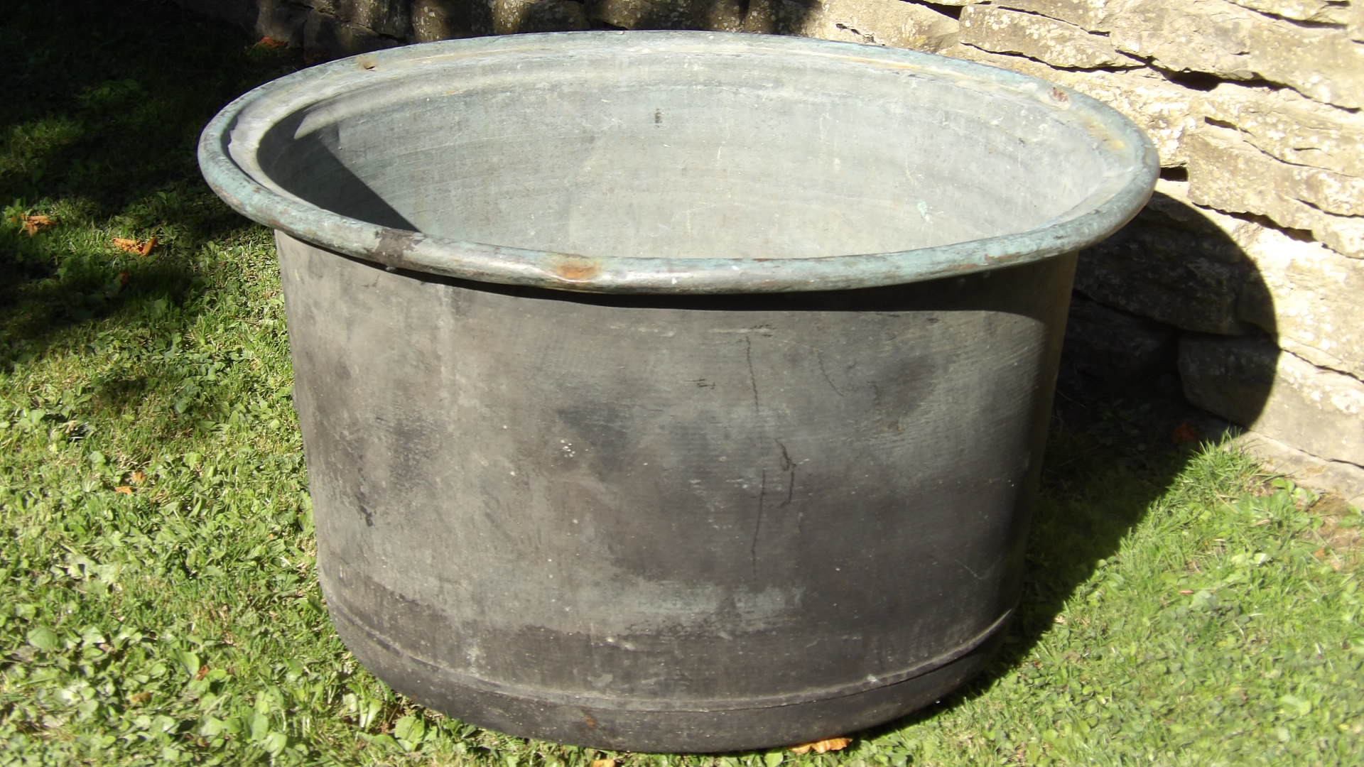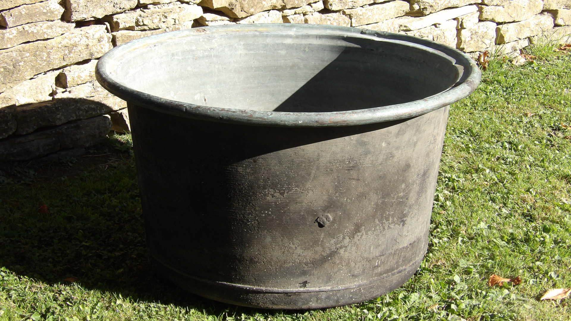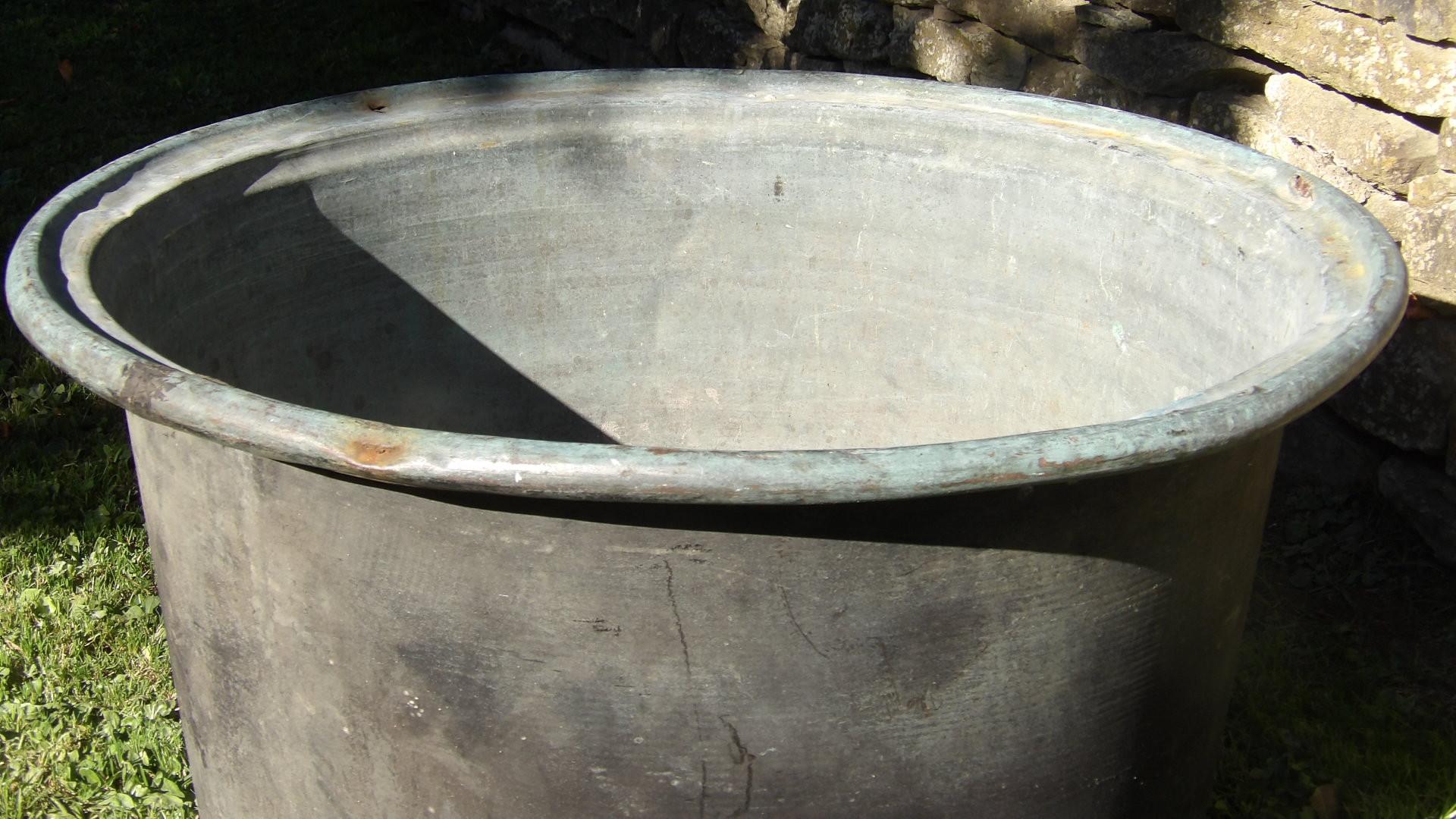 An antique copper planter formed as a plain round bowl with a rolled rim and drainage through the base. It has the great benefit of being larger than most copper planters and also has an attractive blue green verdigris patination.