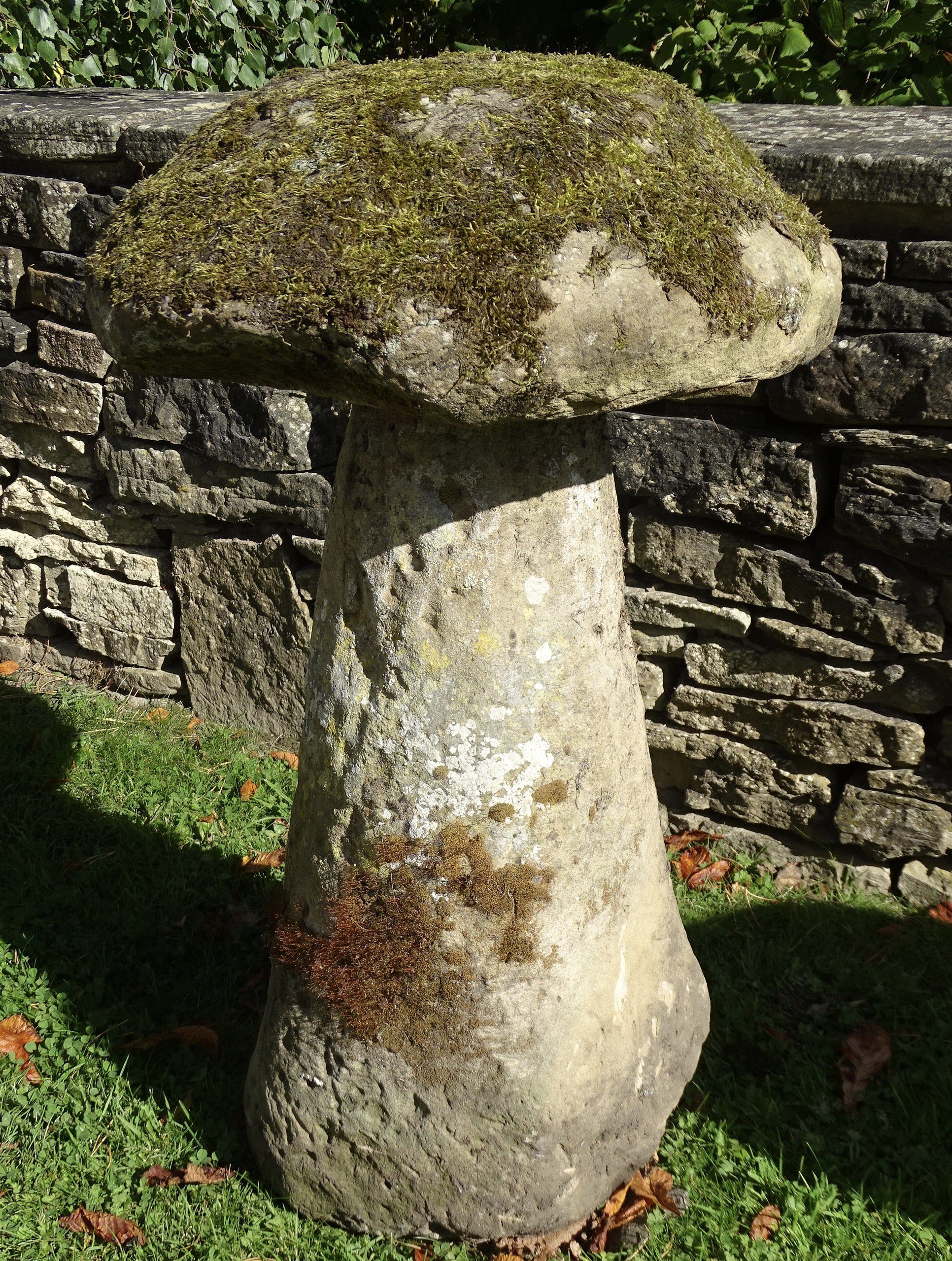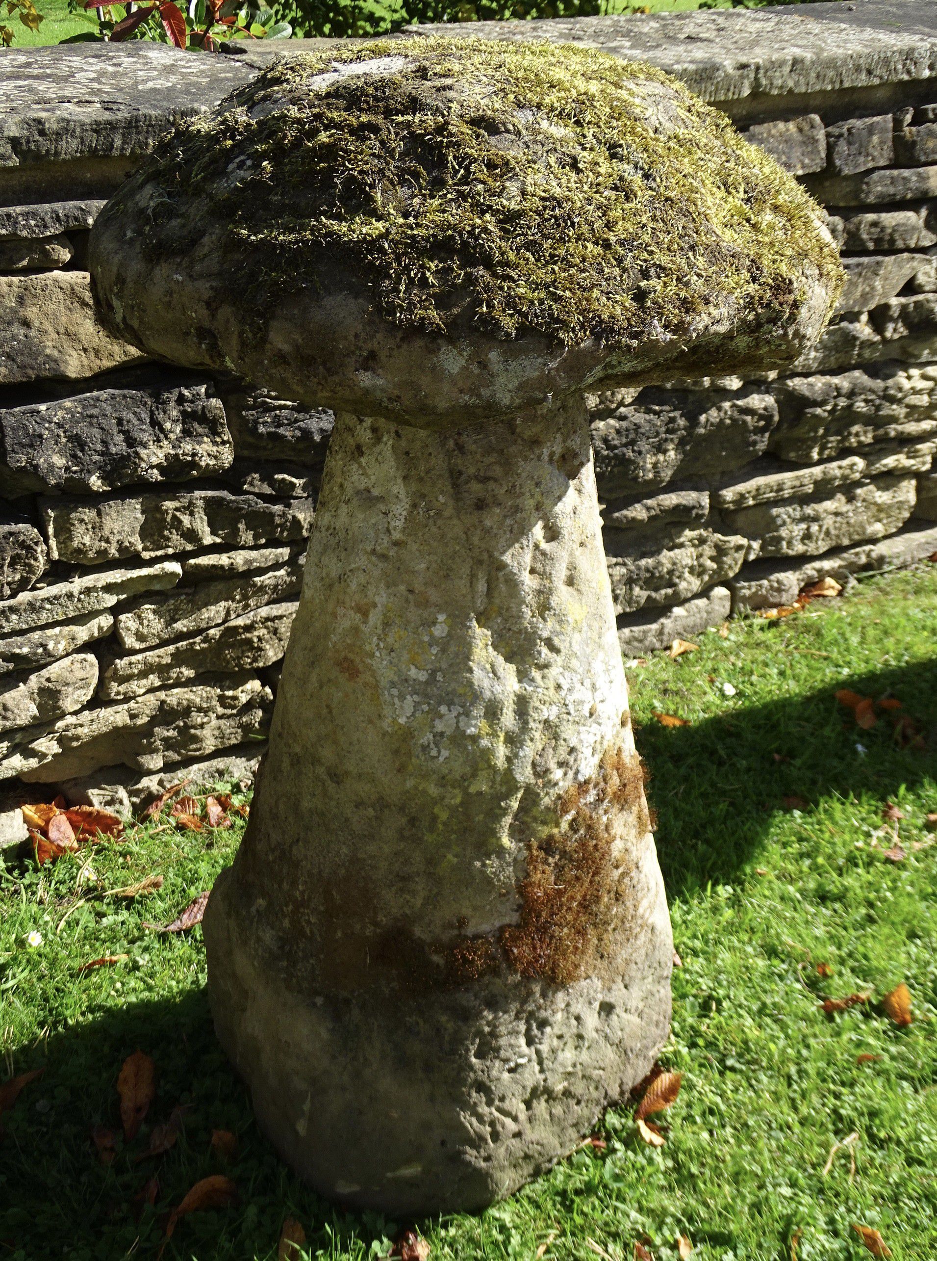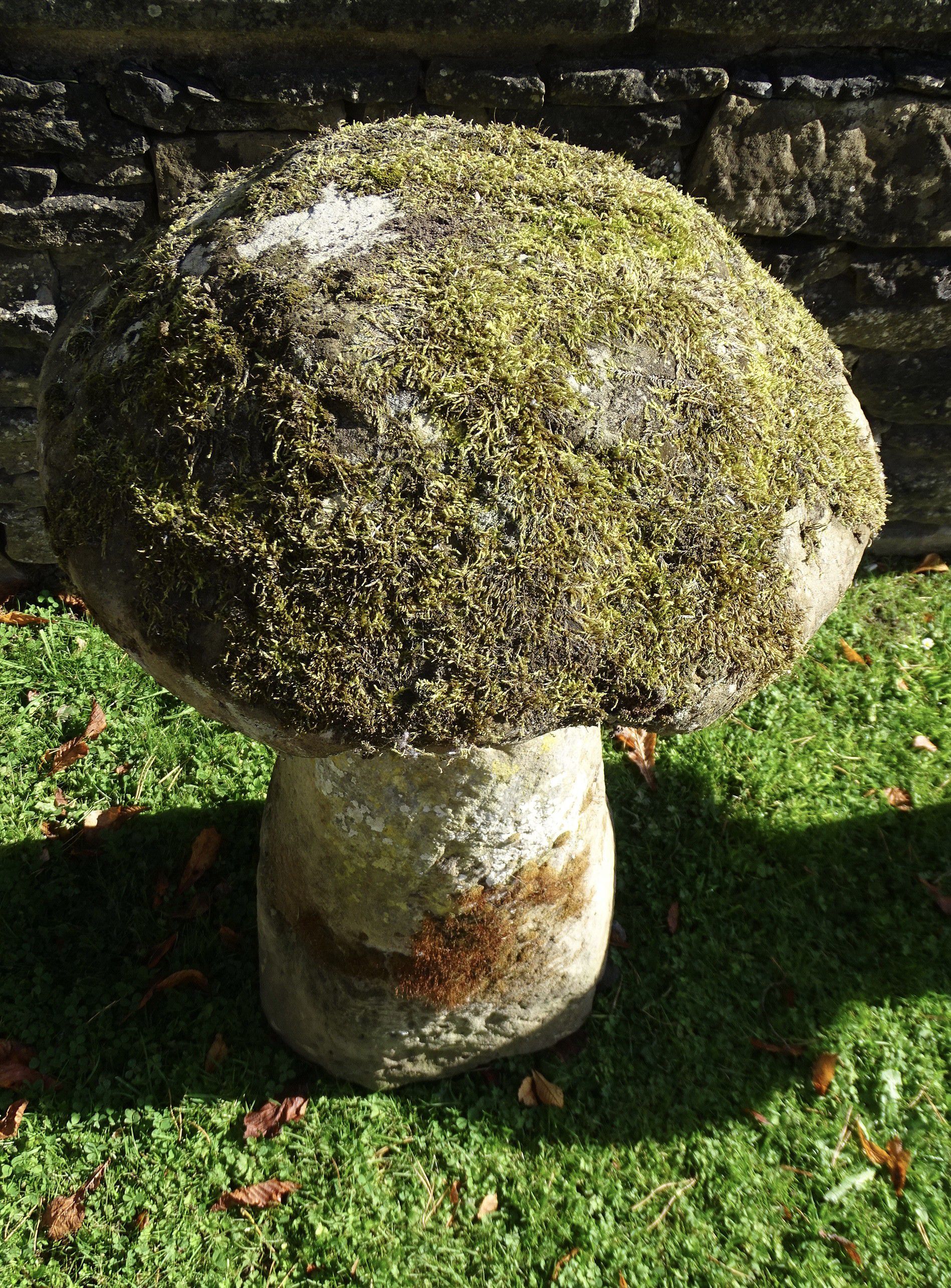 An antique sandstone staddlestone from Warwickshire with lots of mossy charm, the round top permanently fixed to the tapered round base.