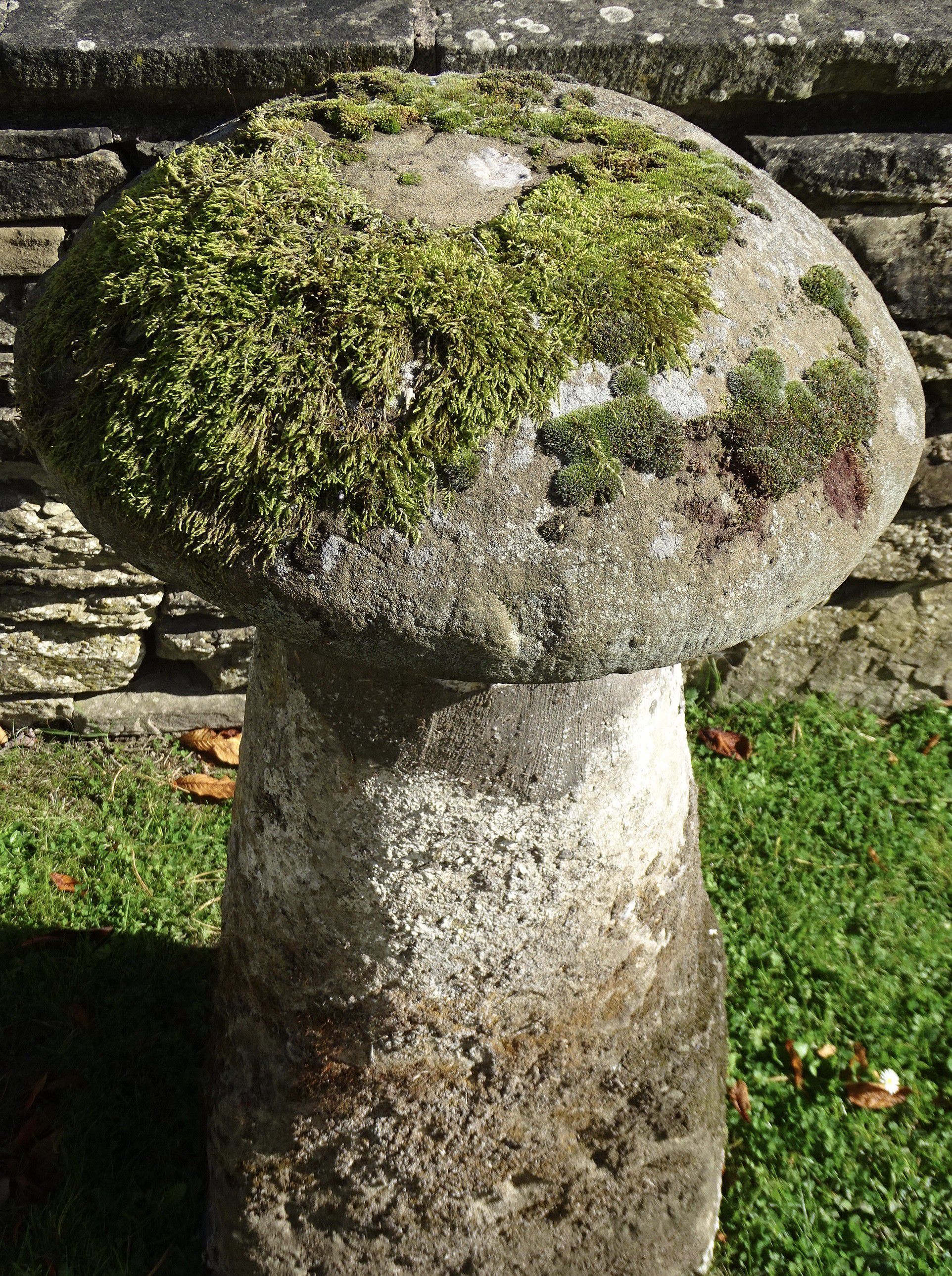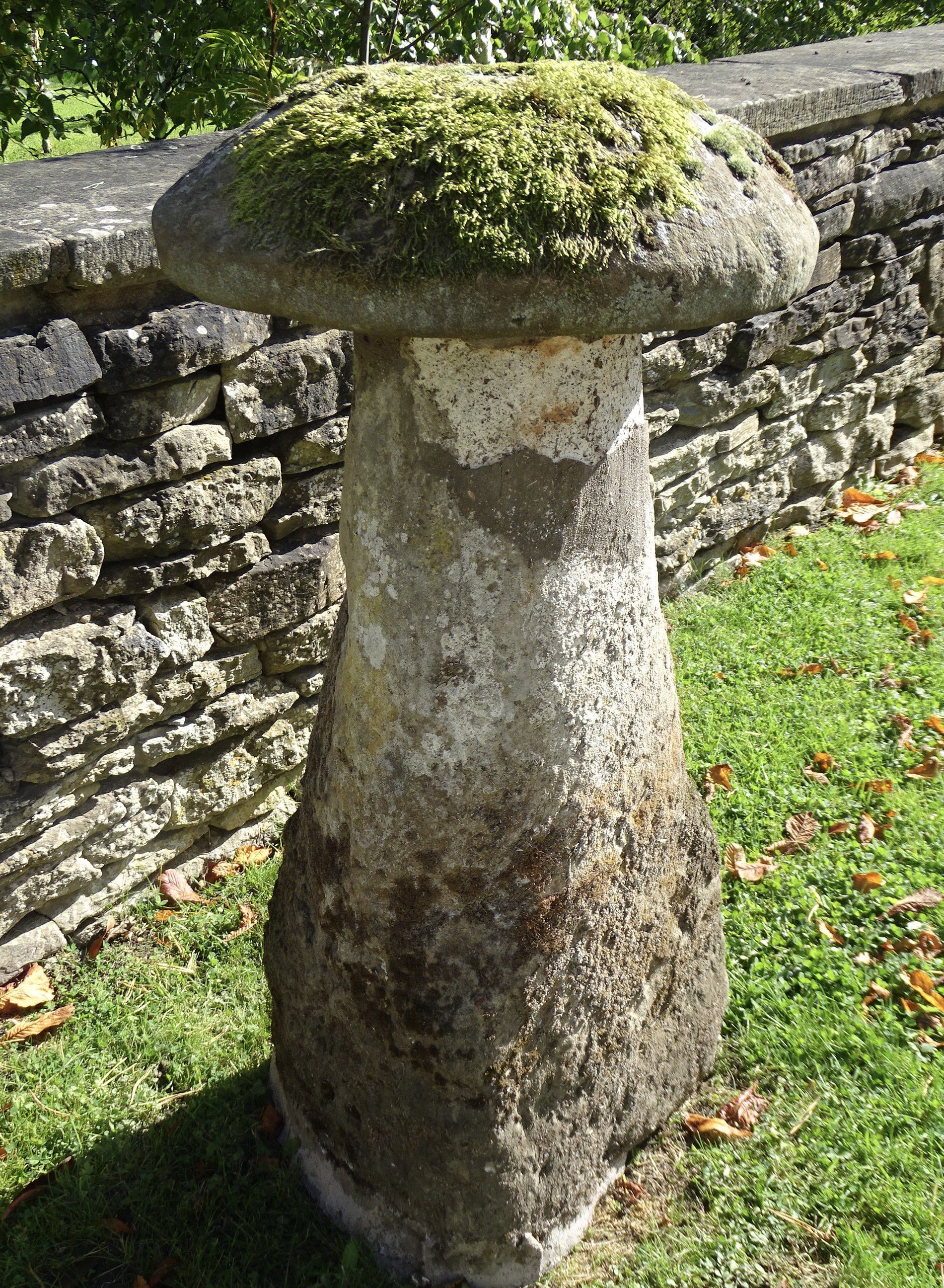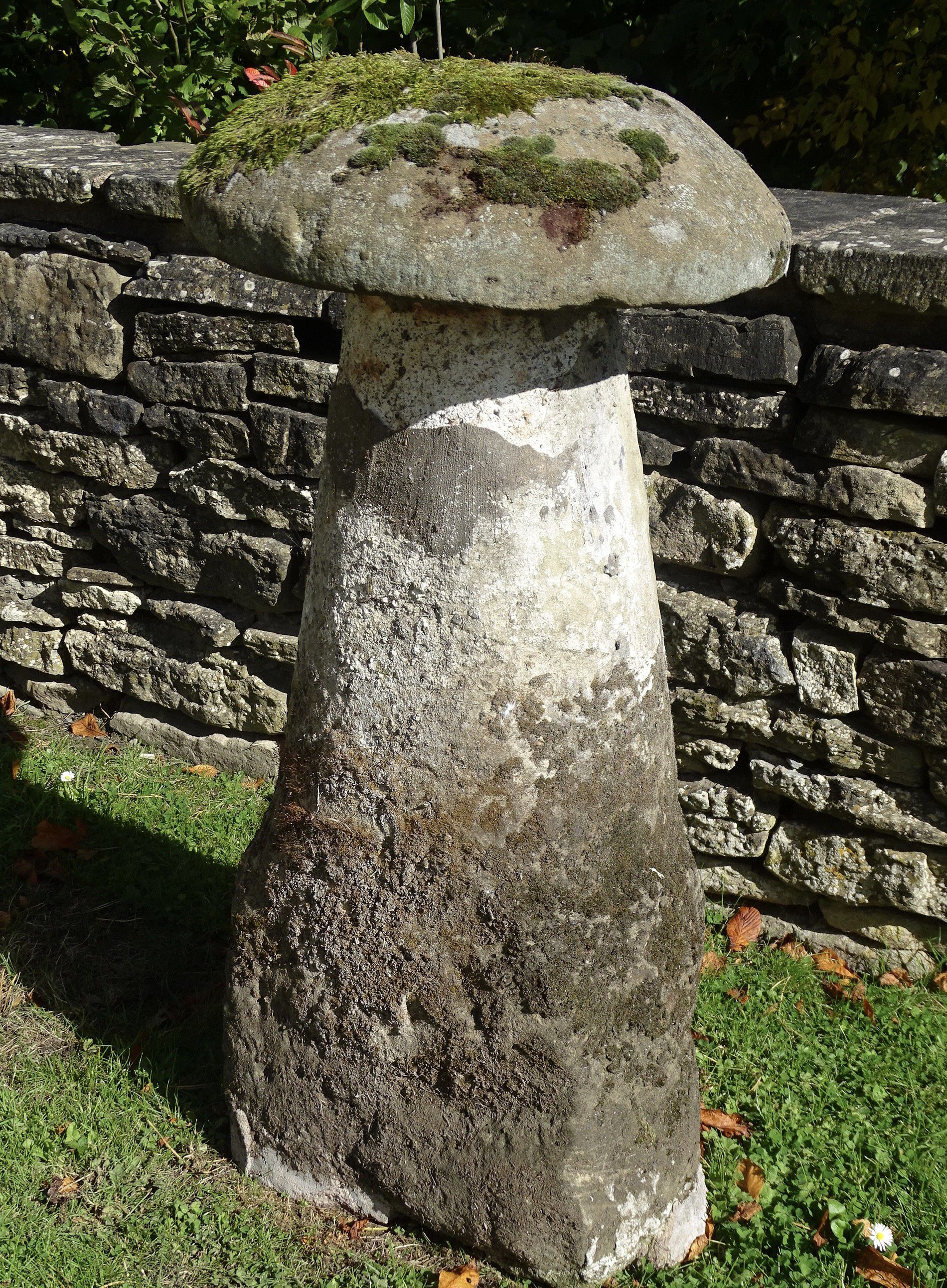 An antique sandstone staddlestone from Warwickshire with lots of character, the round top raised on a rough hewn tall column. The top has been permanently fixed to the base making it unusually secure.