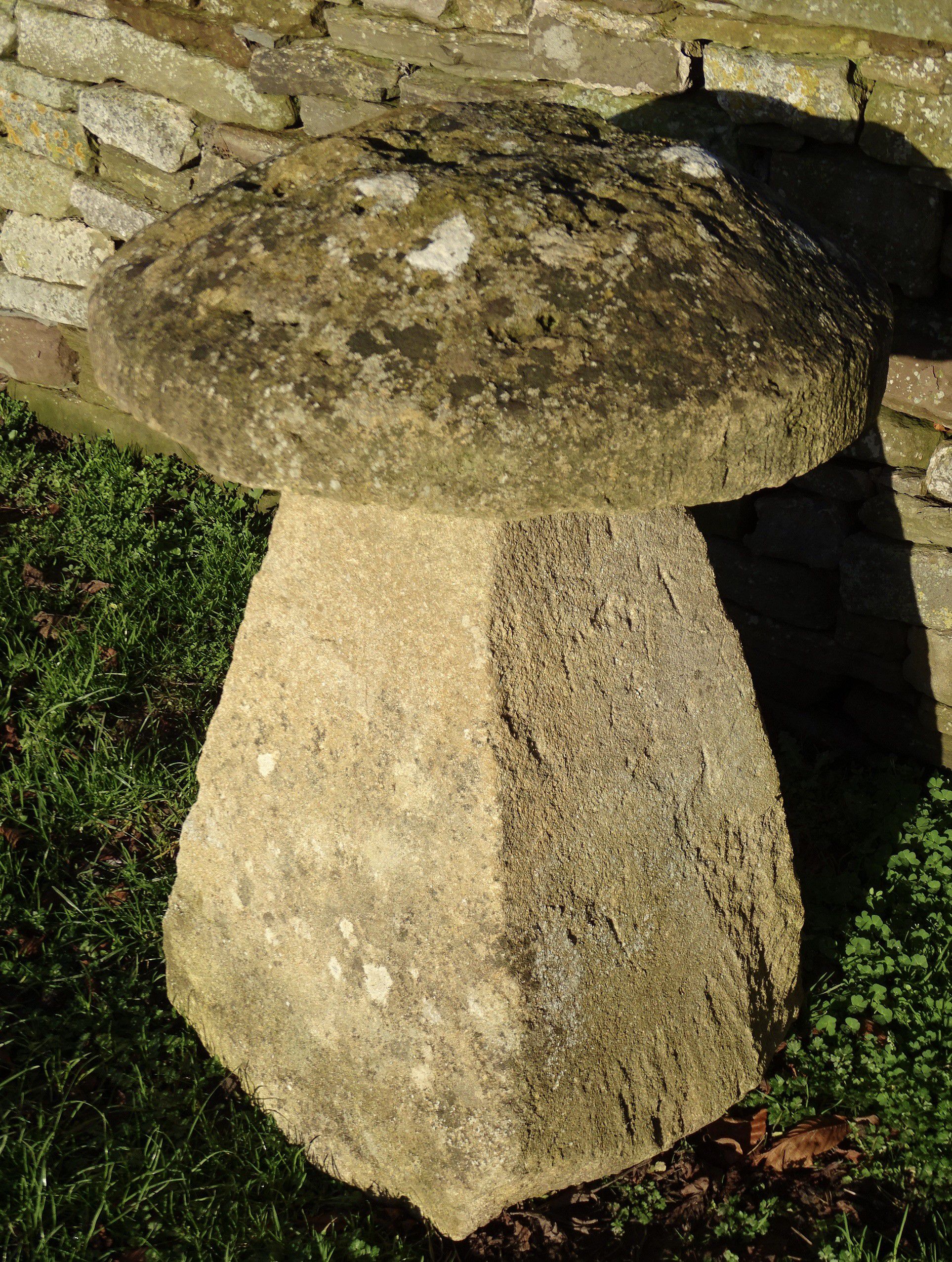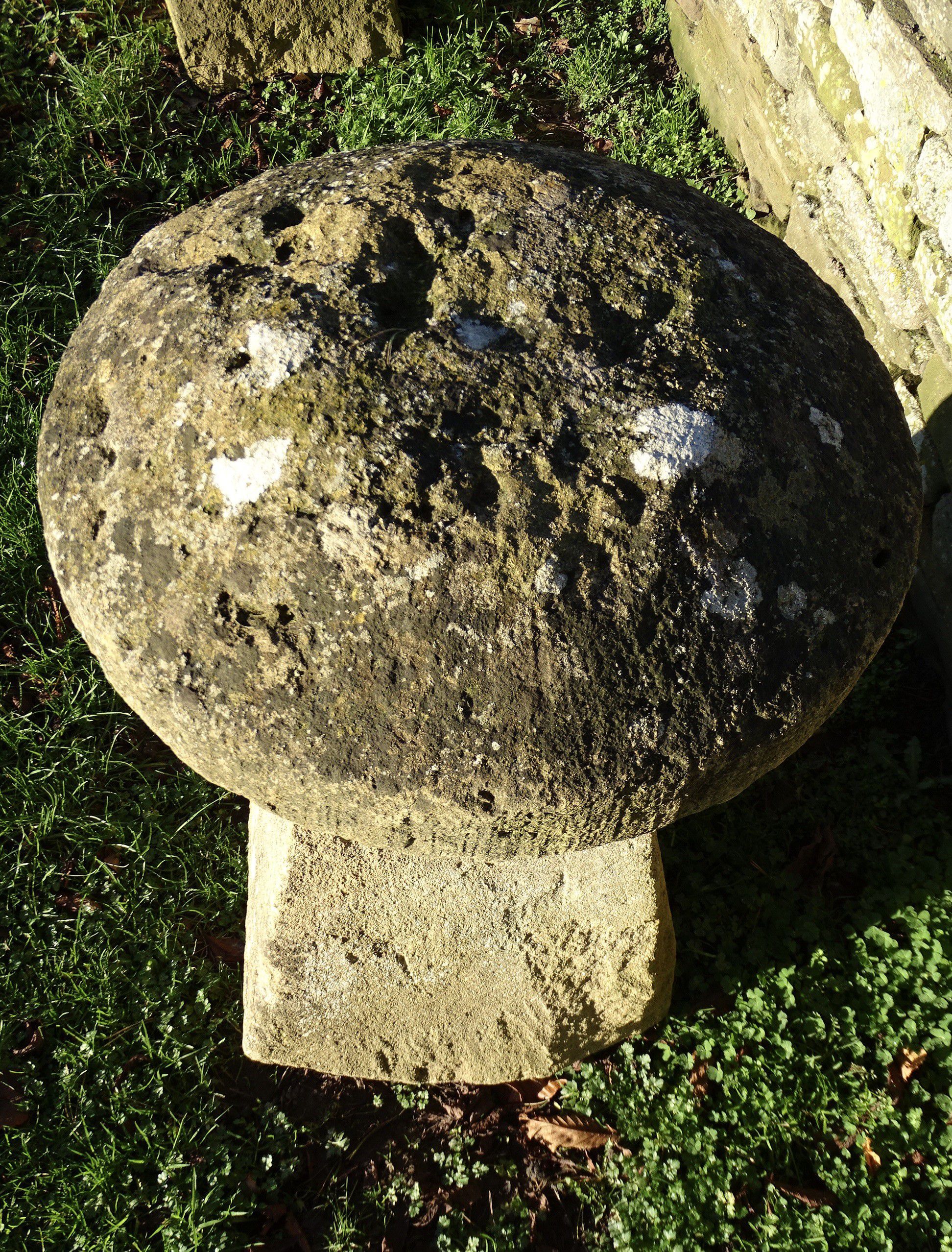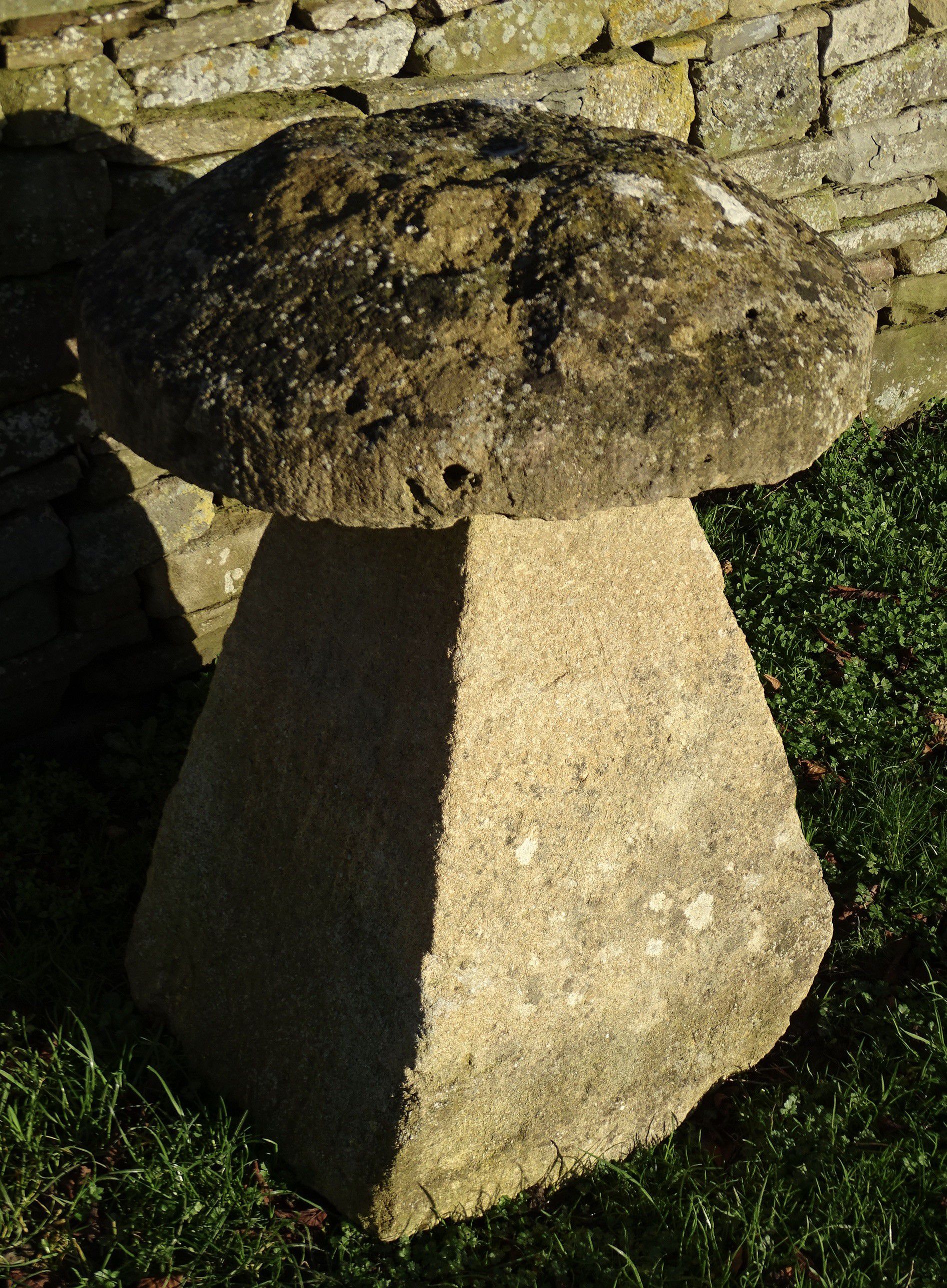 An antique limestone staddlestone from Gloucestershire of larger than usual proportions, the well weathered round top supported on a separate tapered square base.