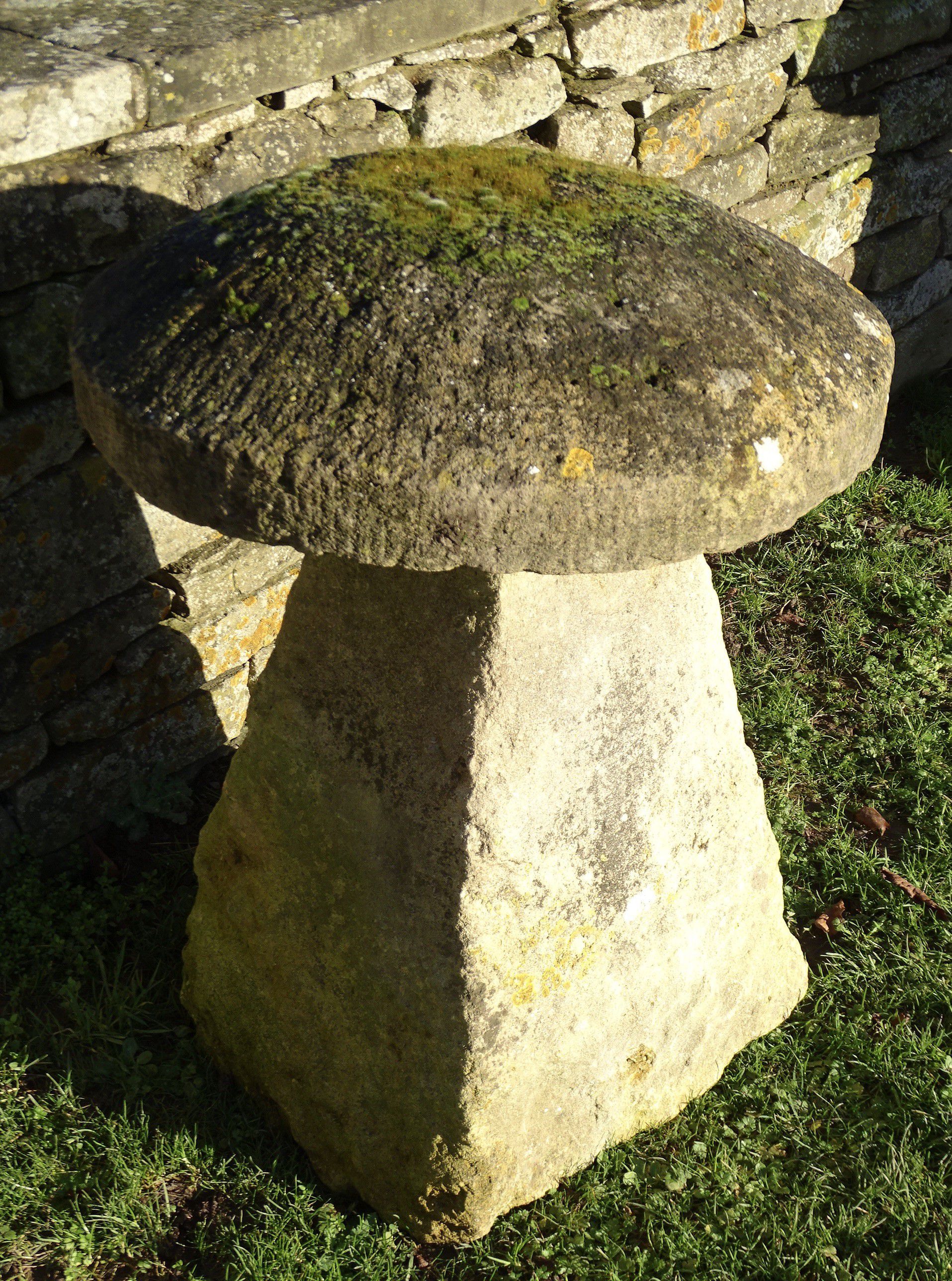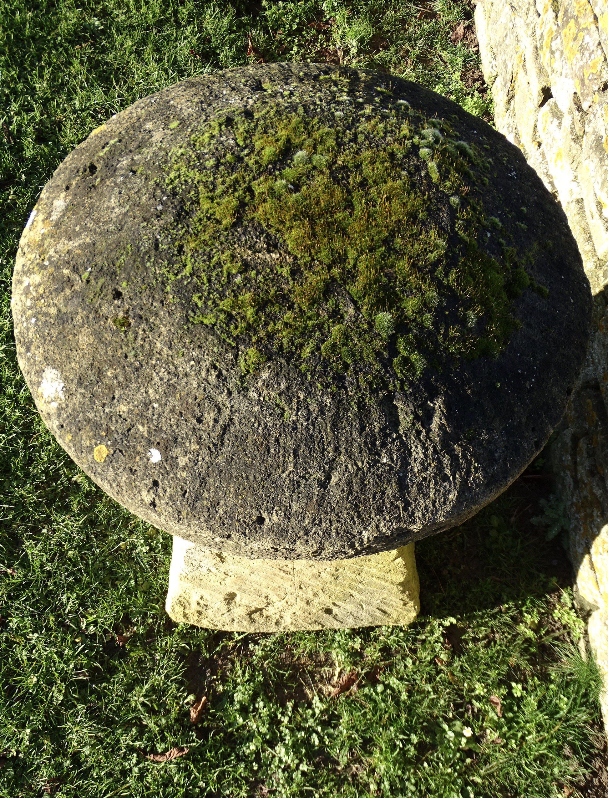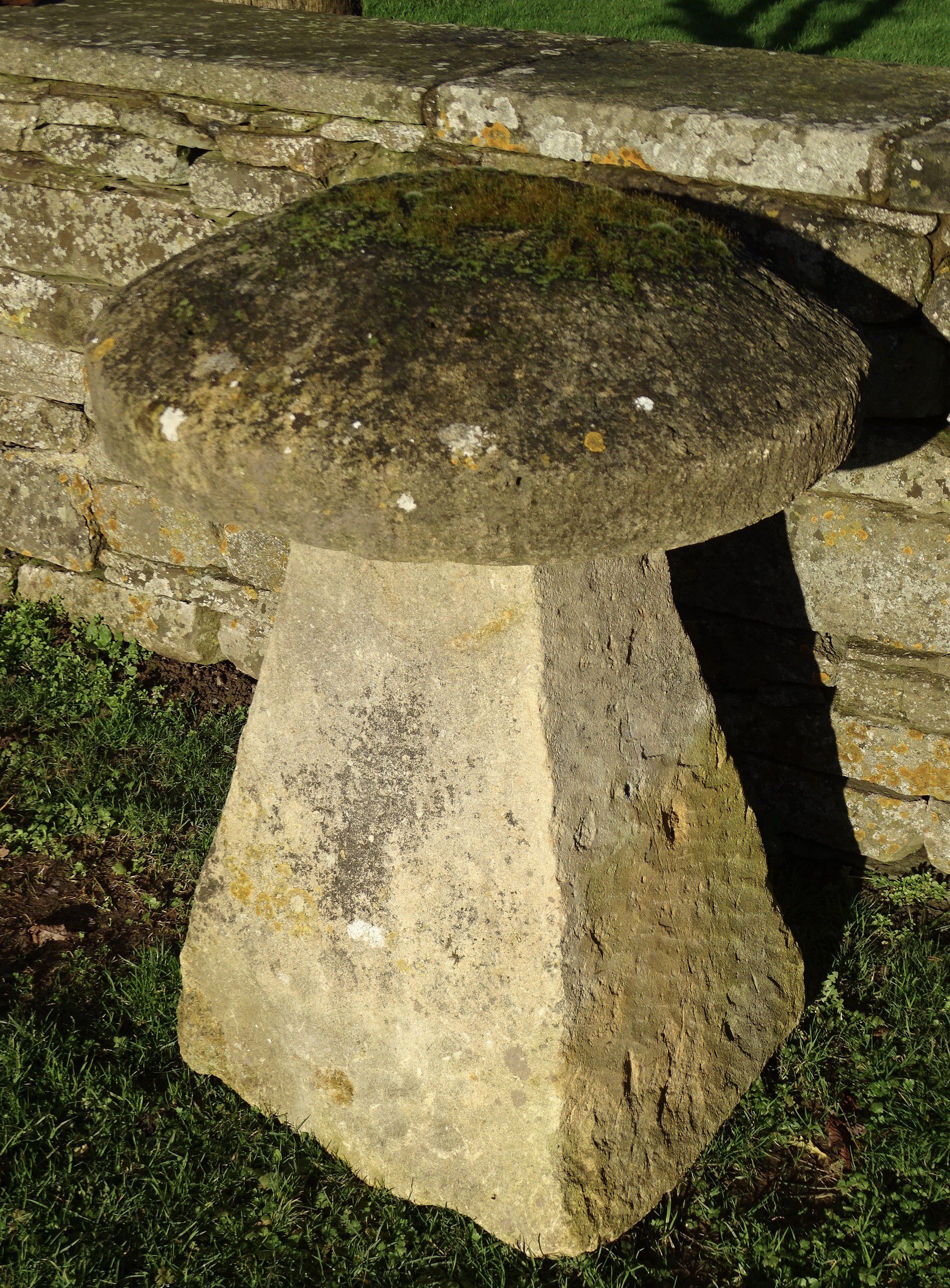 An antique limestone staddlestone from Gloucestershire, the large well weathered round top on a separate square tapered base.