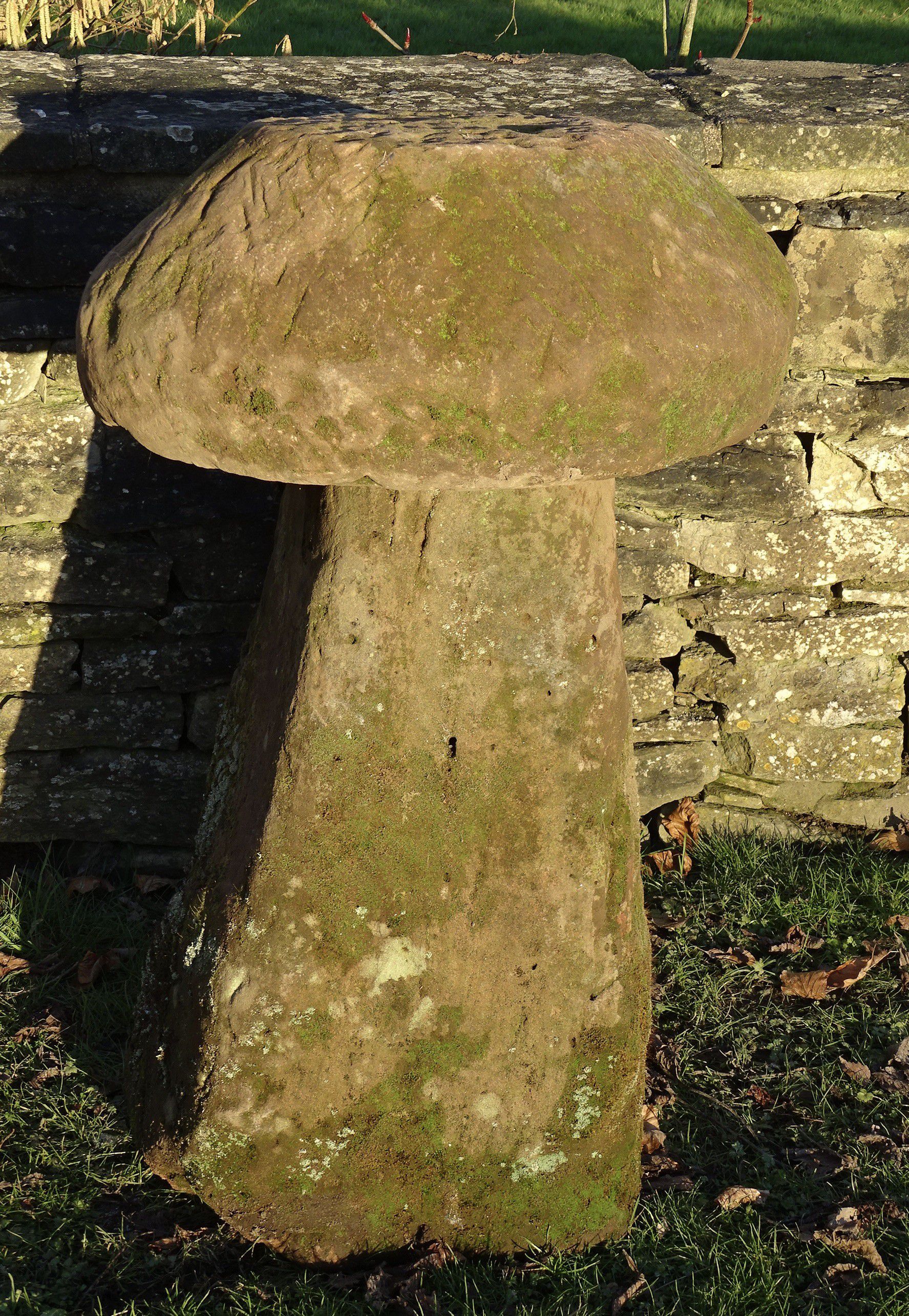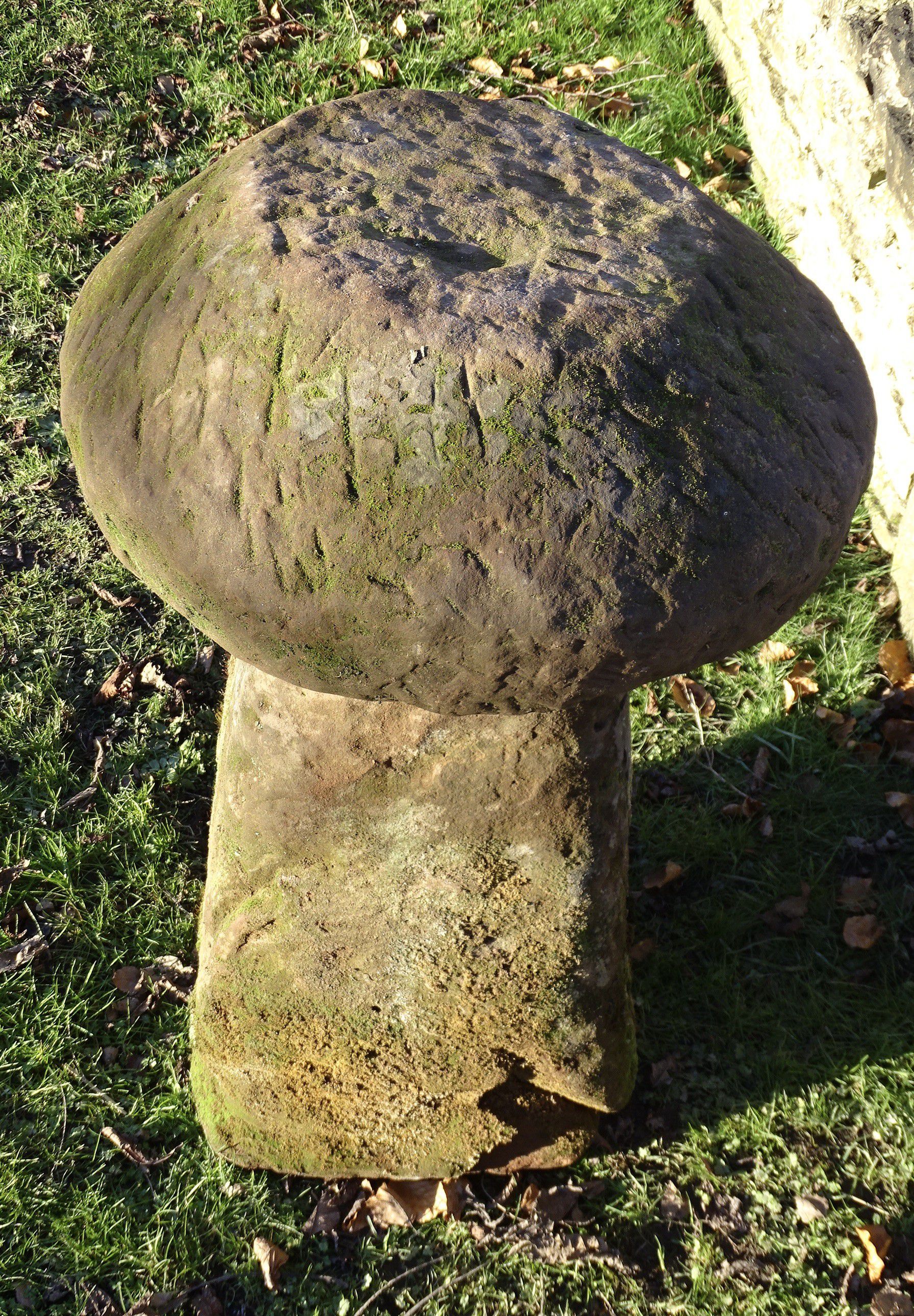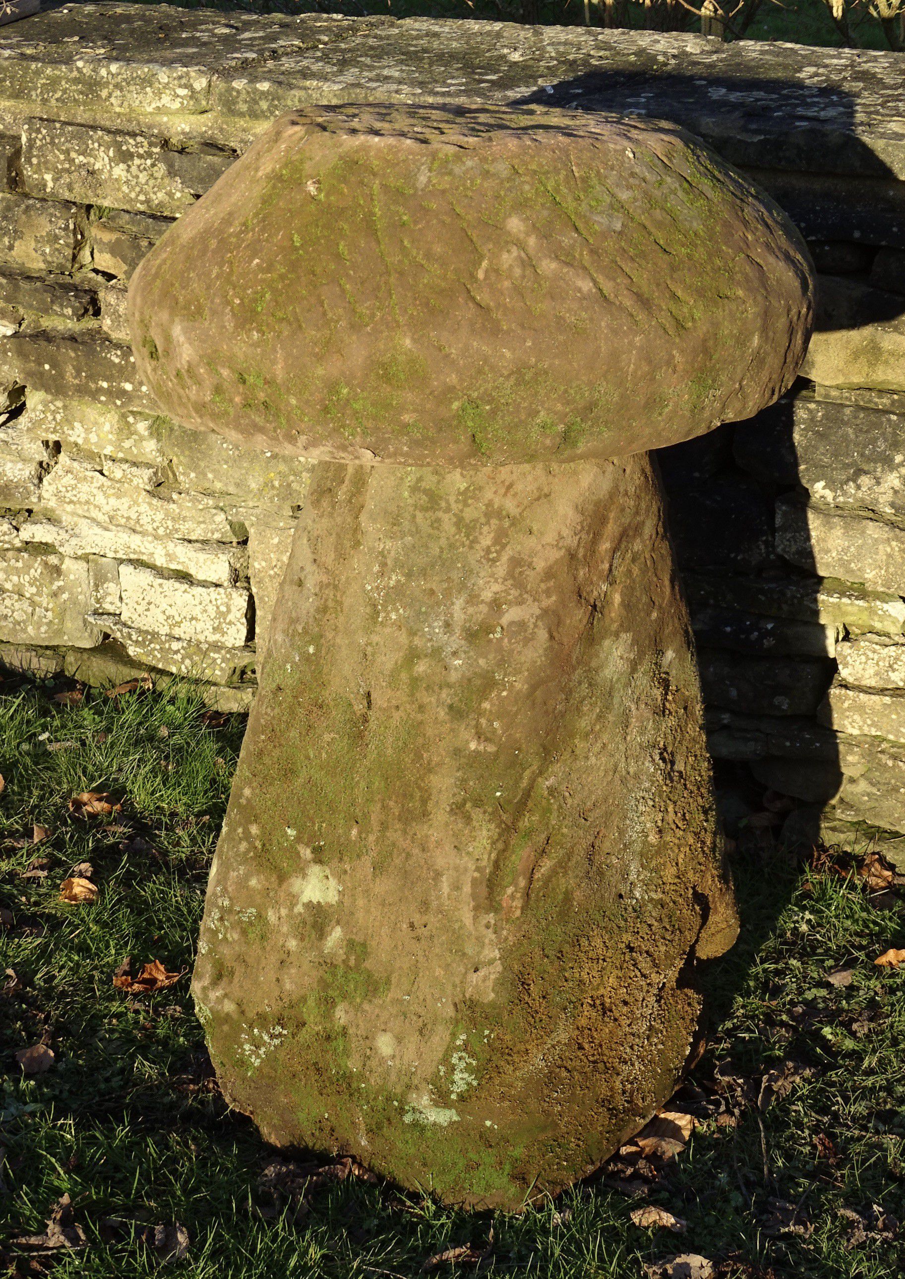 An antique sandstone staddlestone from near Ombersley, Worcestershire, the large round top on a separate tapered base. This is a large staddlestone carved from the old red sandstone found in North Worcestershire which usually rapidly attracts colonising moss. In this case the top was previously stored upside down under cover so is unusually bare but moss is already beginning to re-establish.