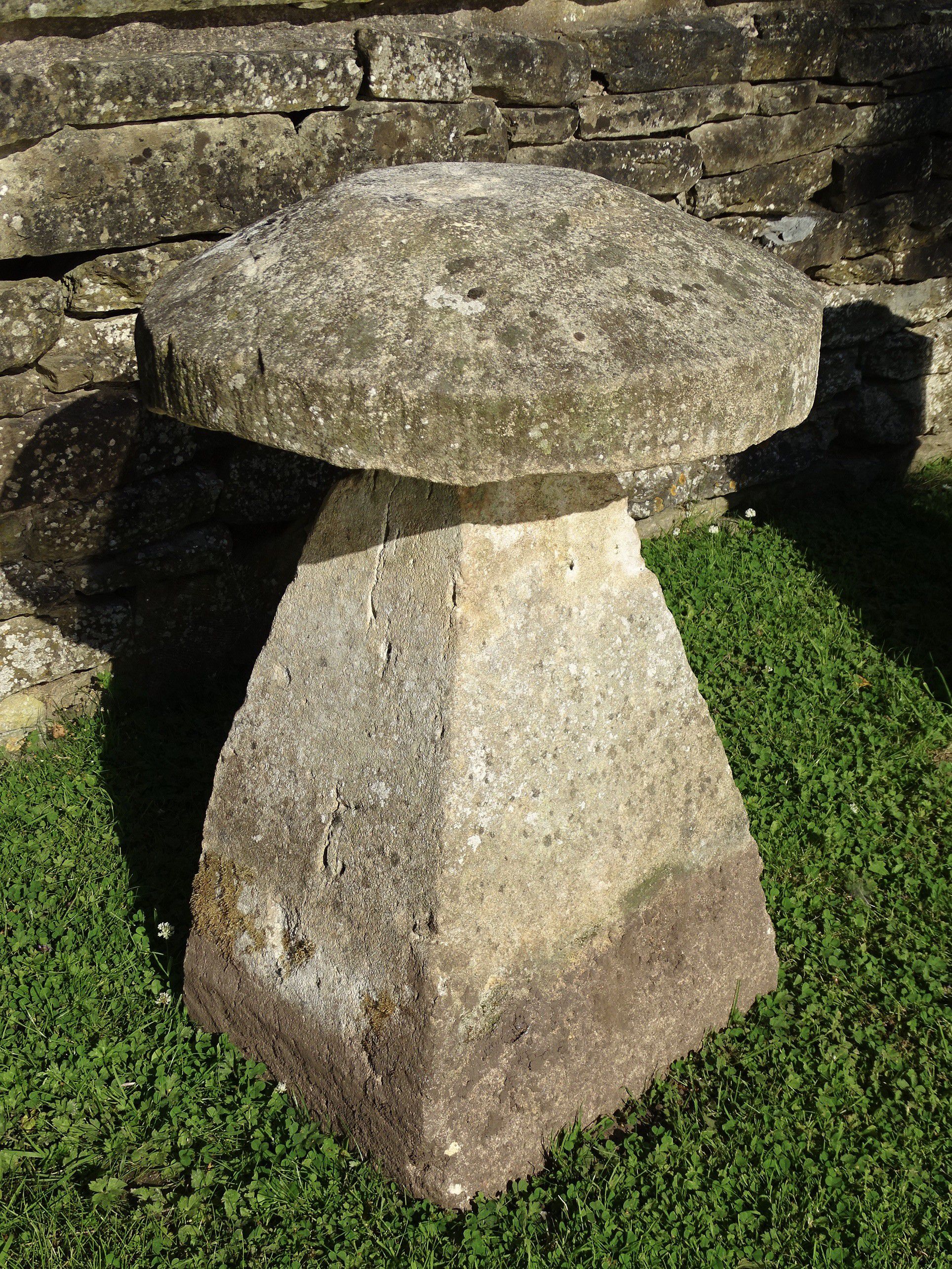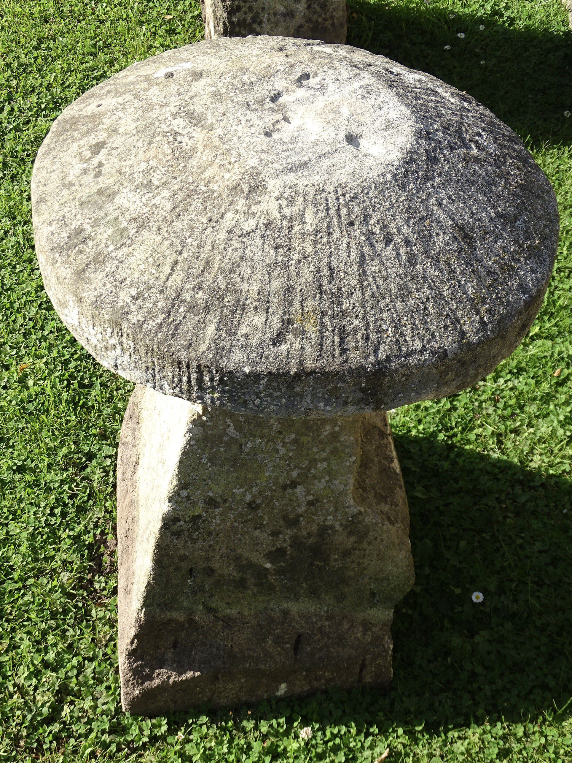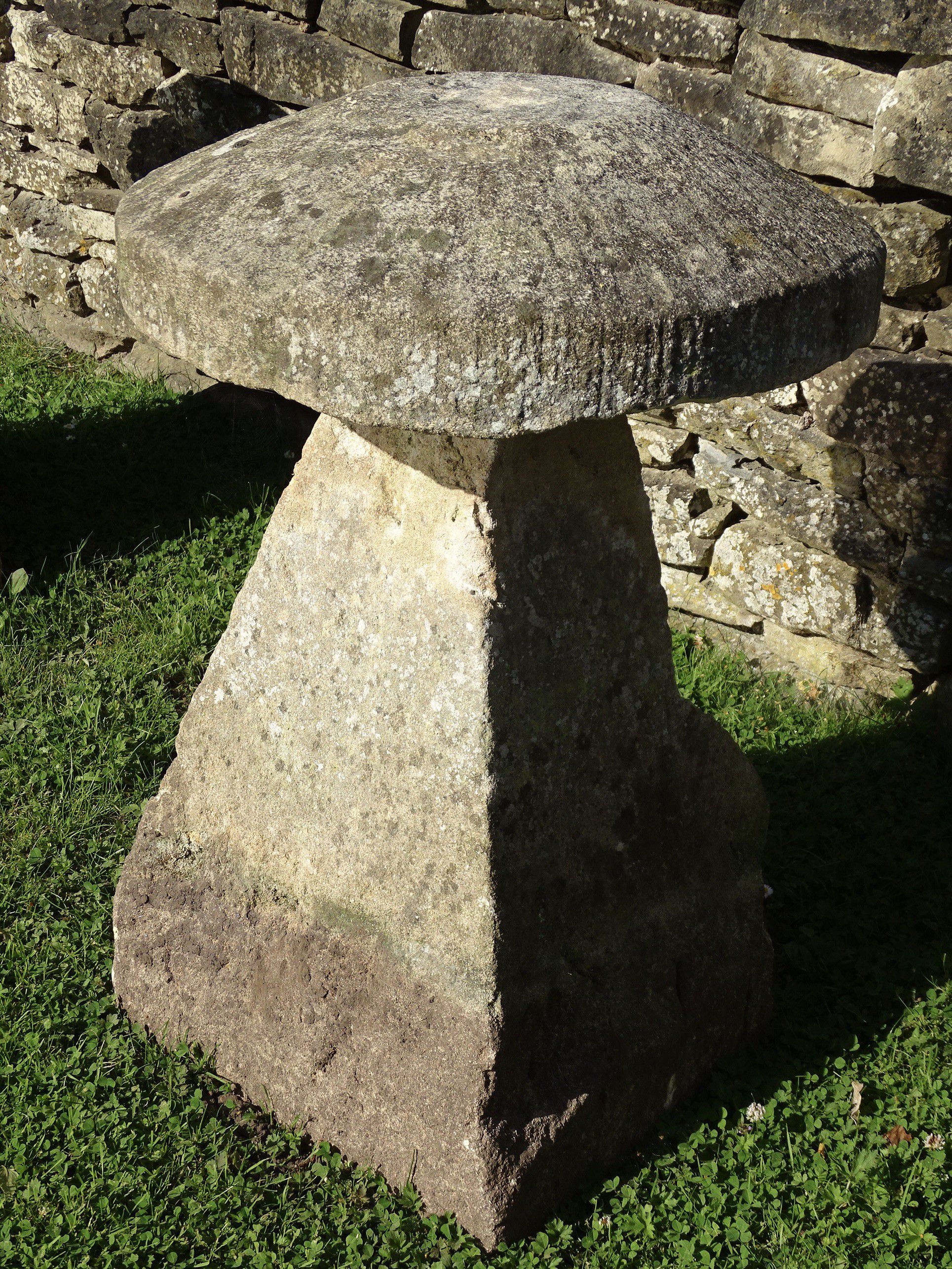 An antique limestone staddlestone, the weathered round cap stone supported on a square tapered base.