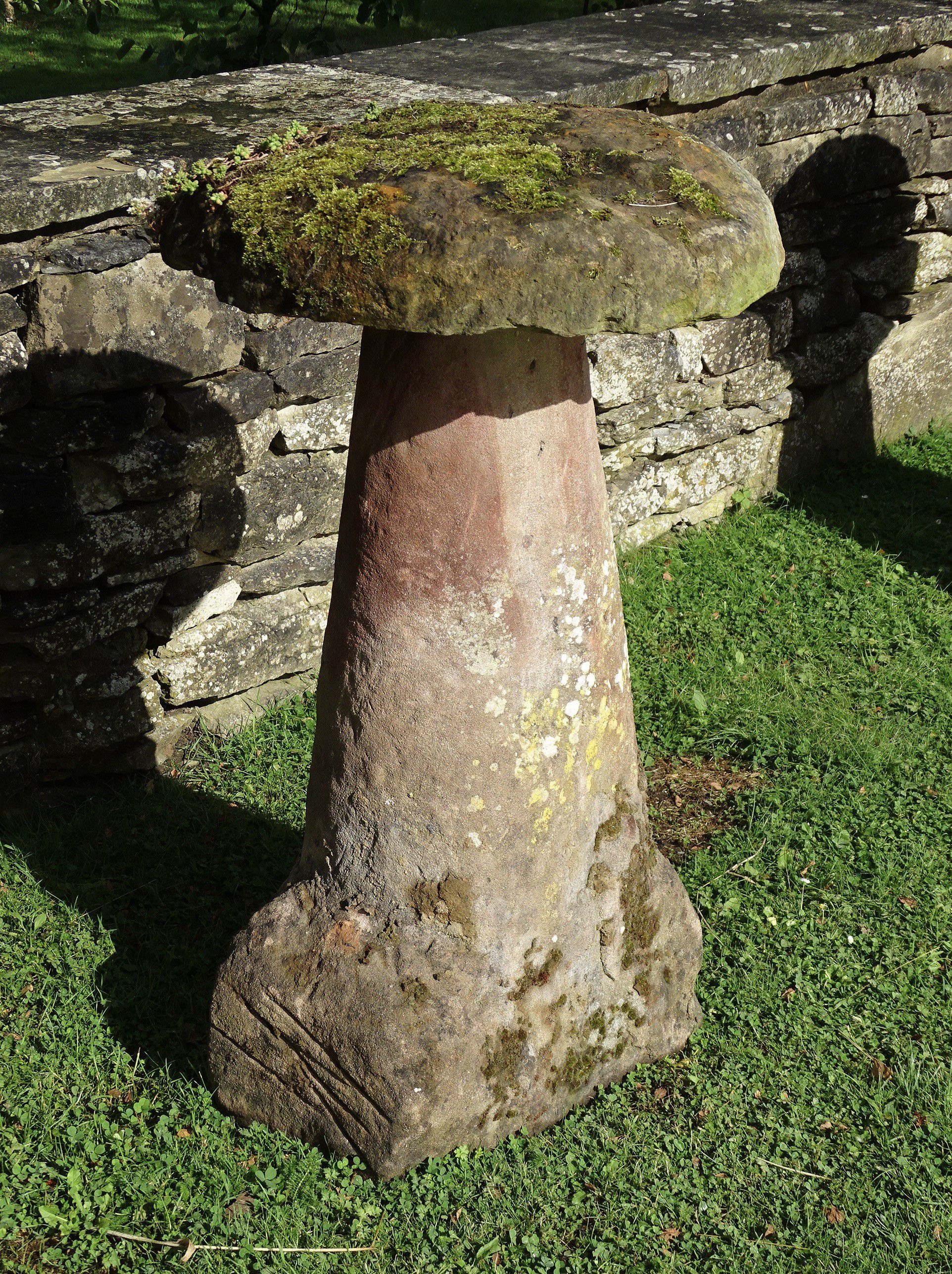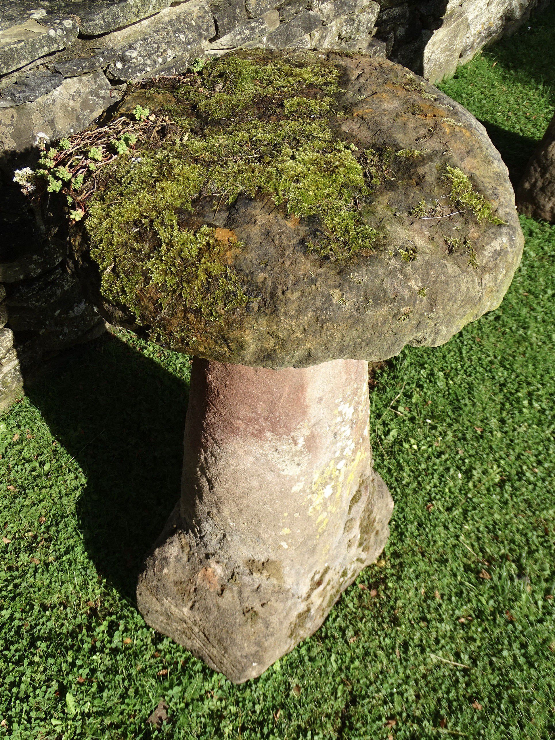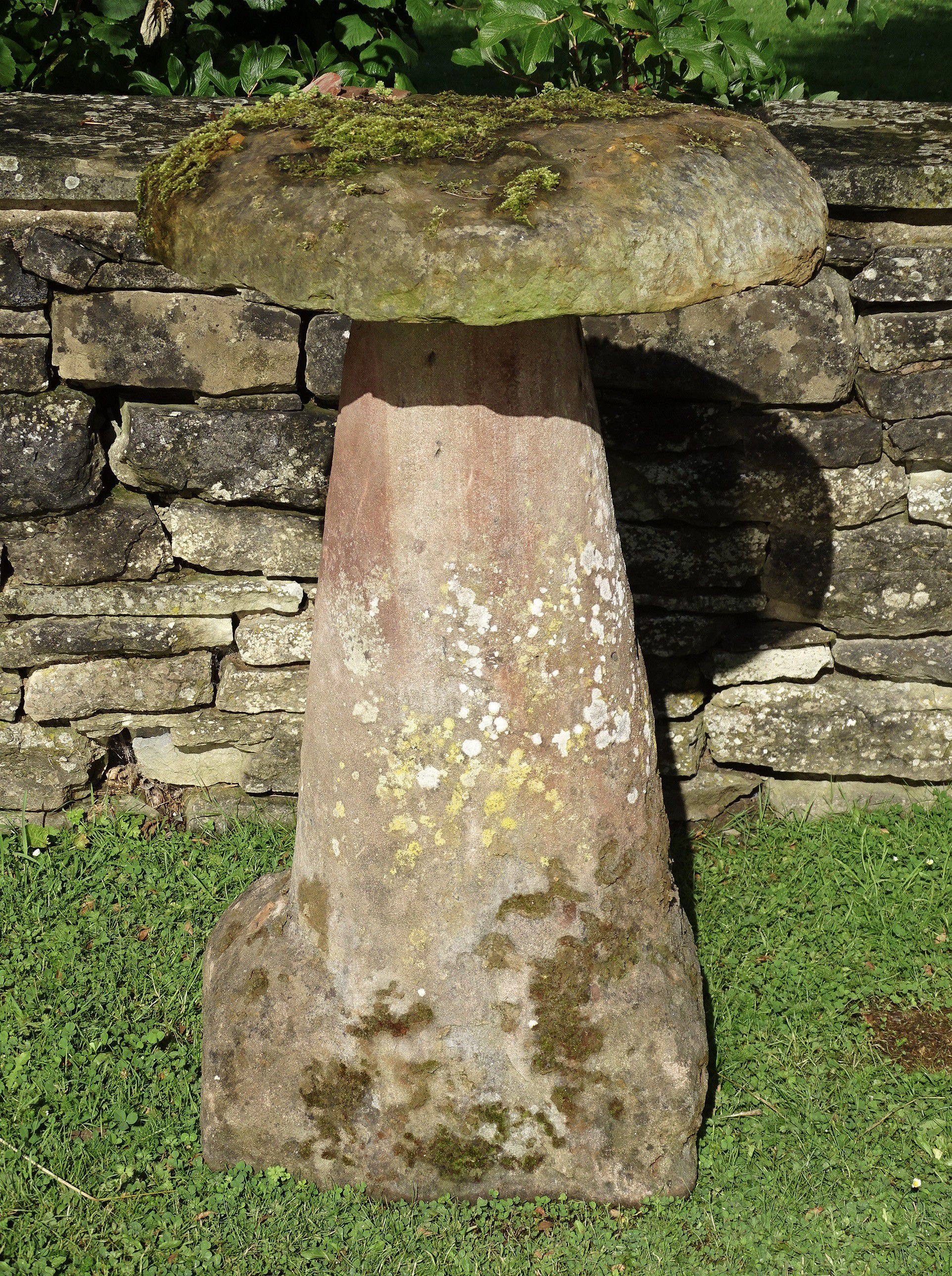 An unusually tall antique staddlestone from West Shropshire with lots of character, the mossy top raised on a separate tapered base. The top is a made from ironstone while the base is a pink sandstone. The use of different stones is not unusual with antique staddlestones, the heavy base was usually made from the local stone but the top was sometimes bought in from another area if the stone was considered to be more durable.