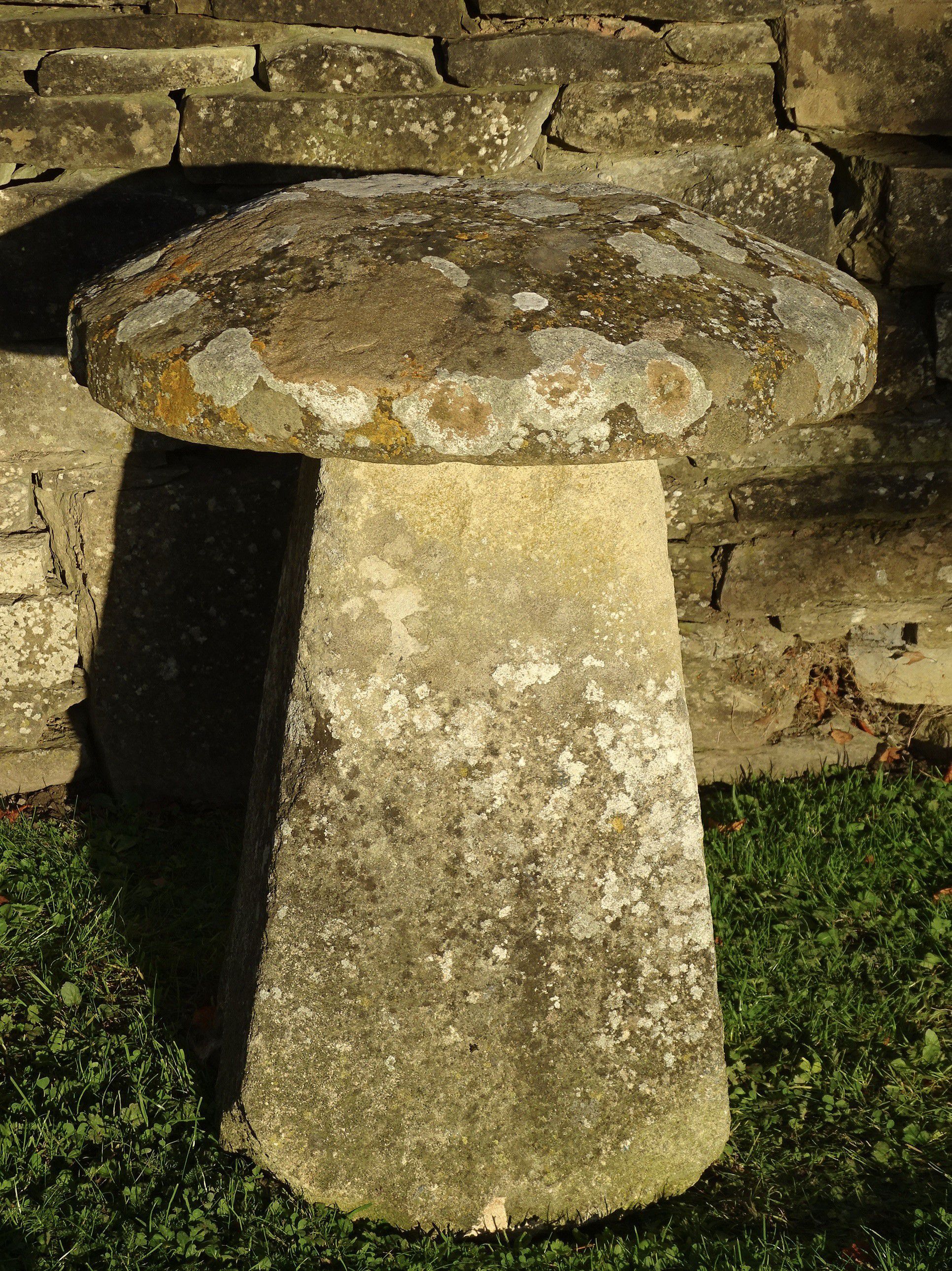 An antique limestone staddlestone, the round top on a separate tapered square base.