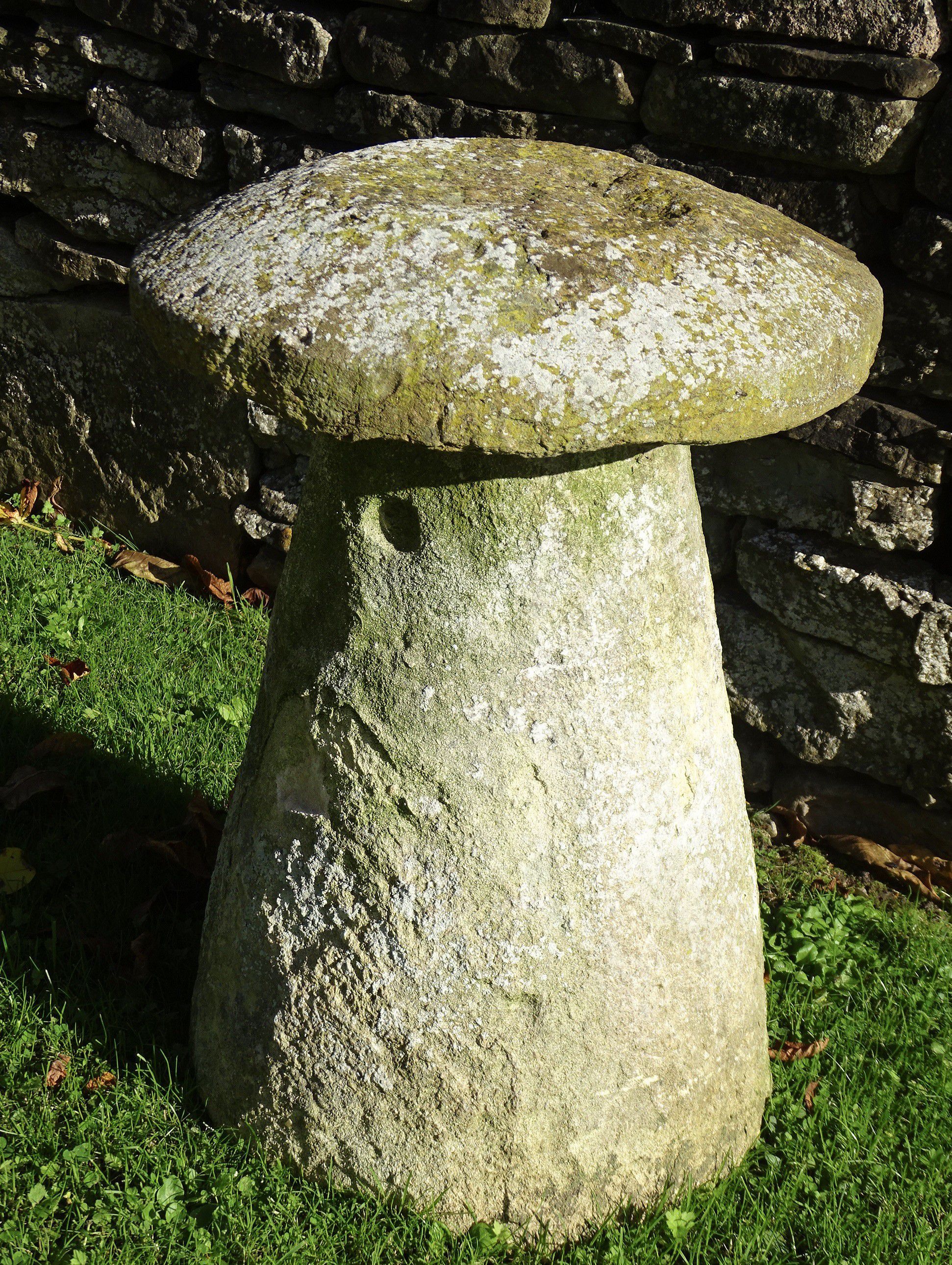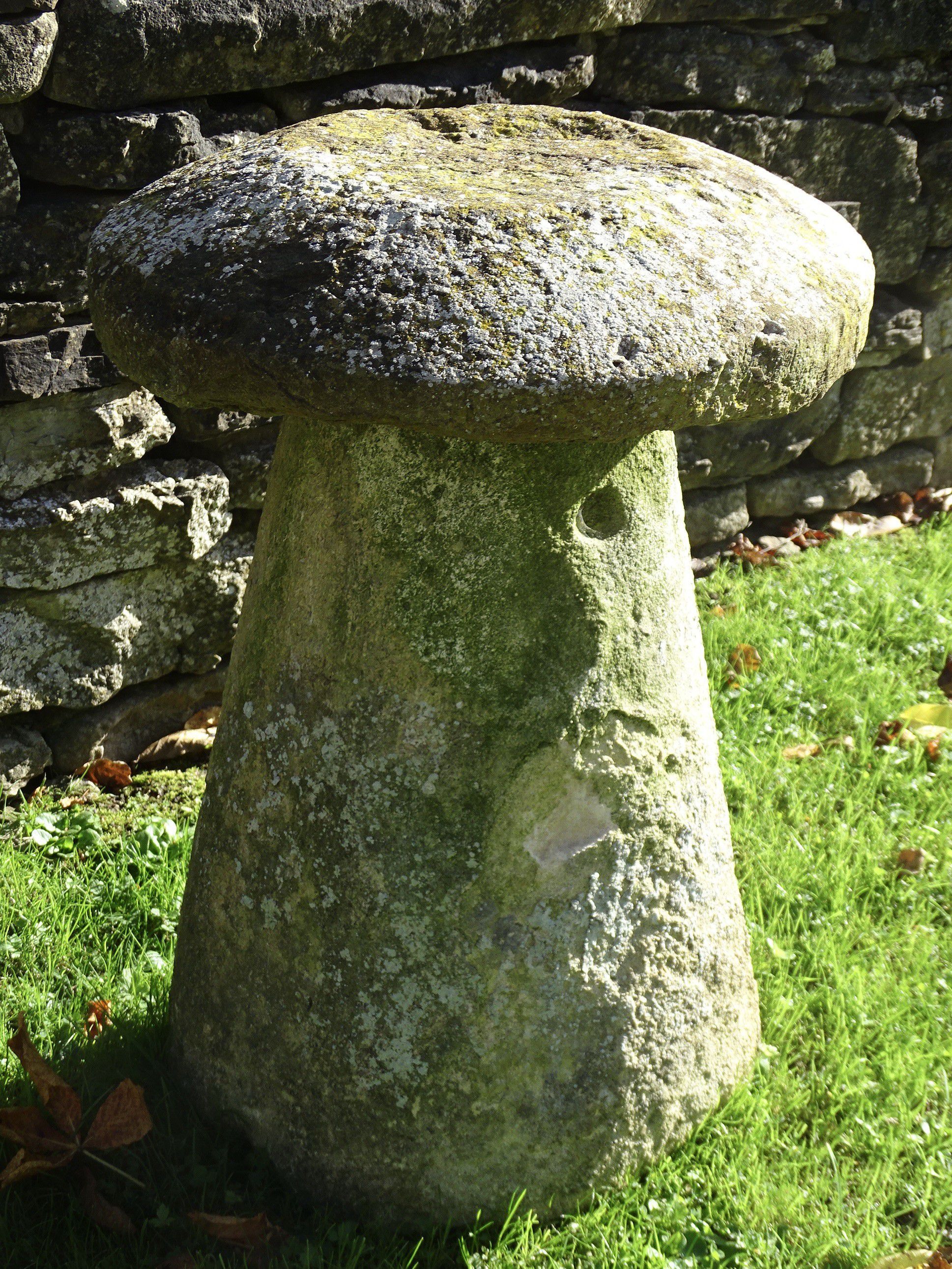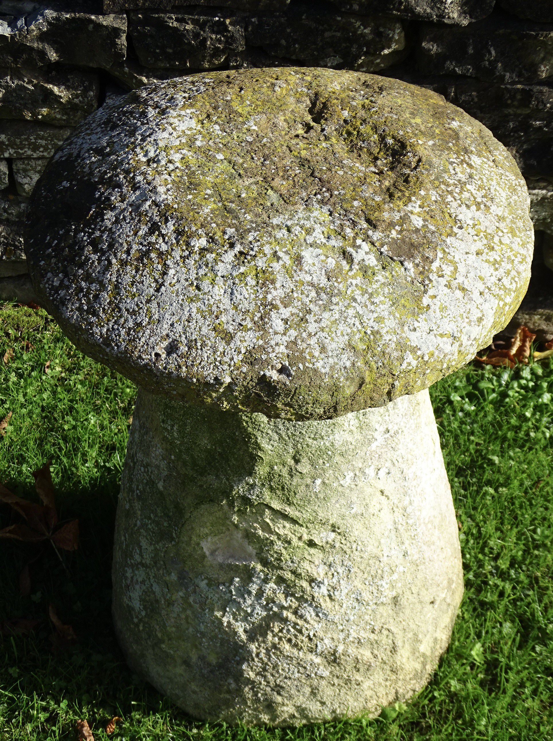 An antique limestone staddlestone from South Oxfordshire, the round top on a separate tapered round base.