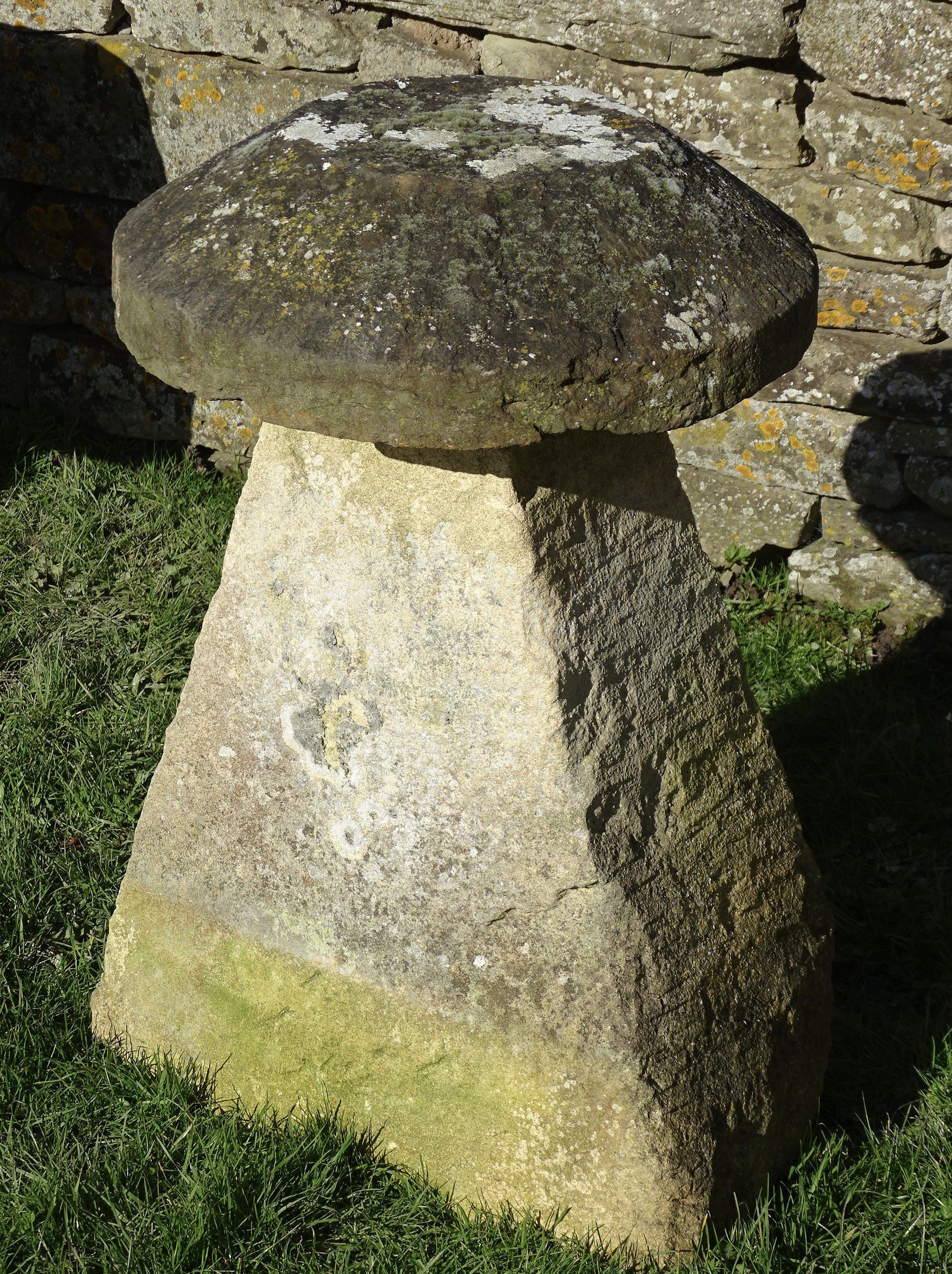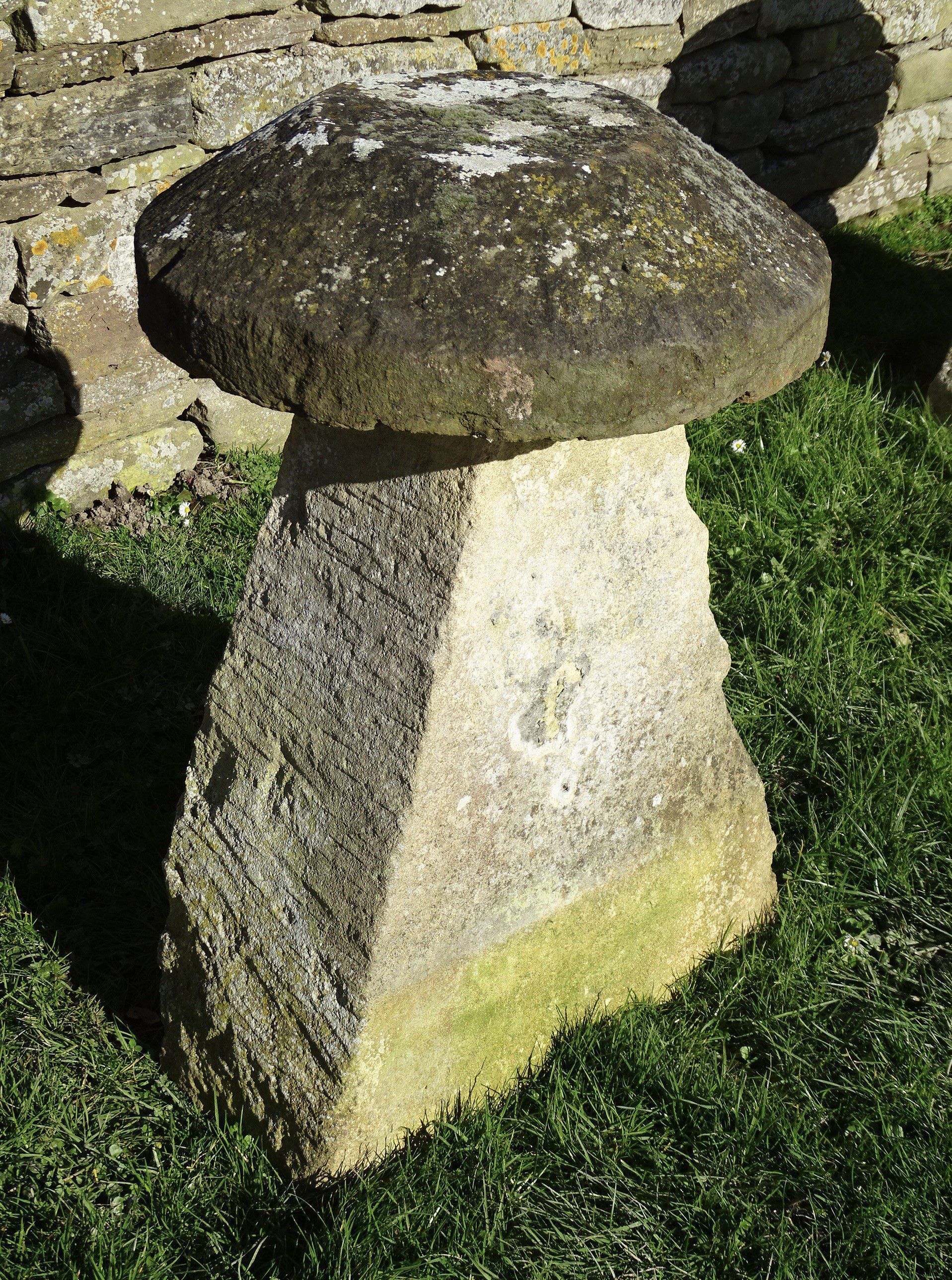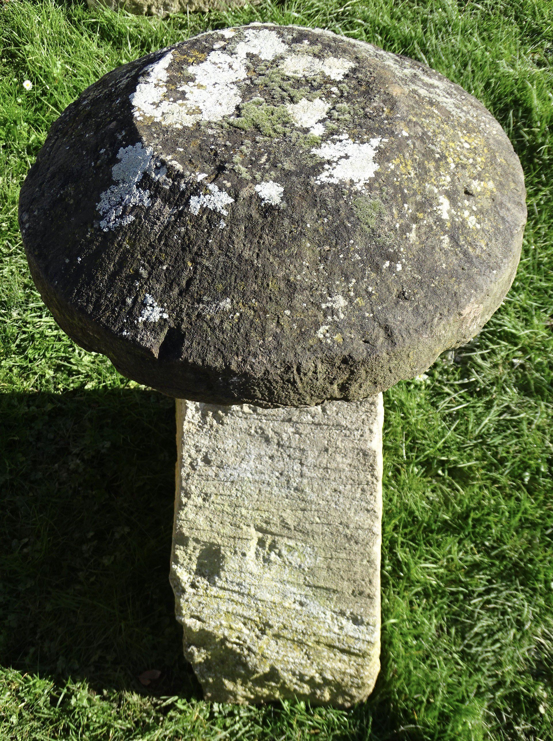 An antique limestone staddlestone from Gloucestershire, the separate round top on a tapered rectangular base.