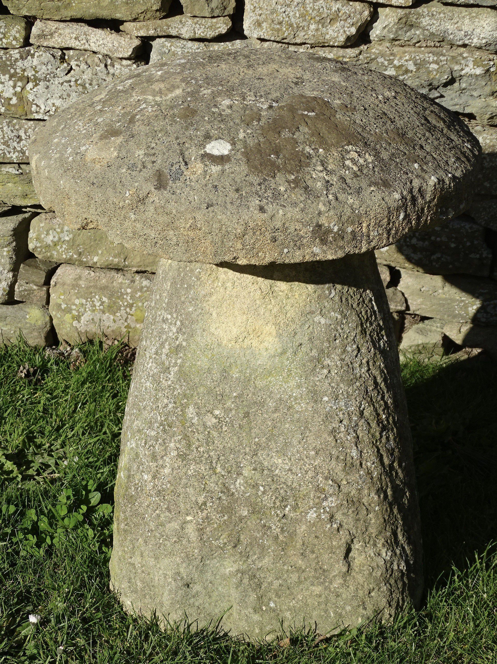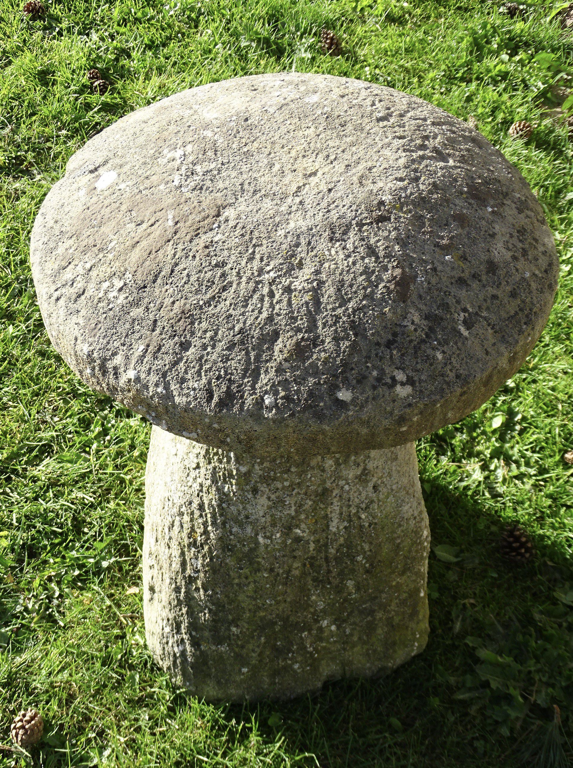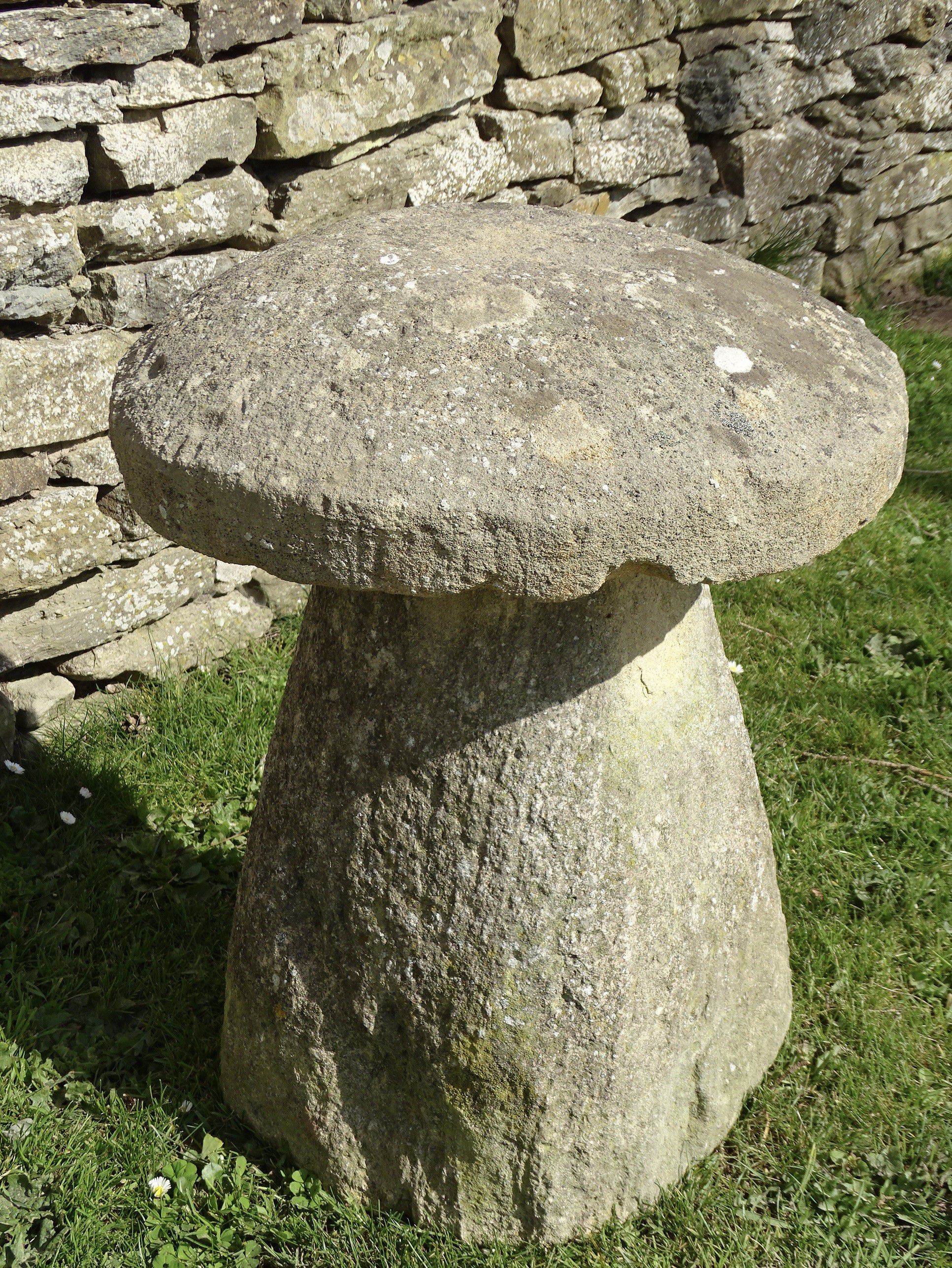 An antique limestone staddlestone from Oxfordshire, the round top on separate tapered round base.