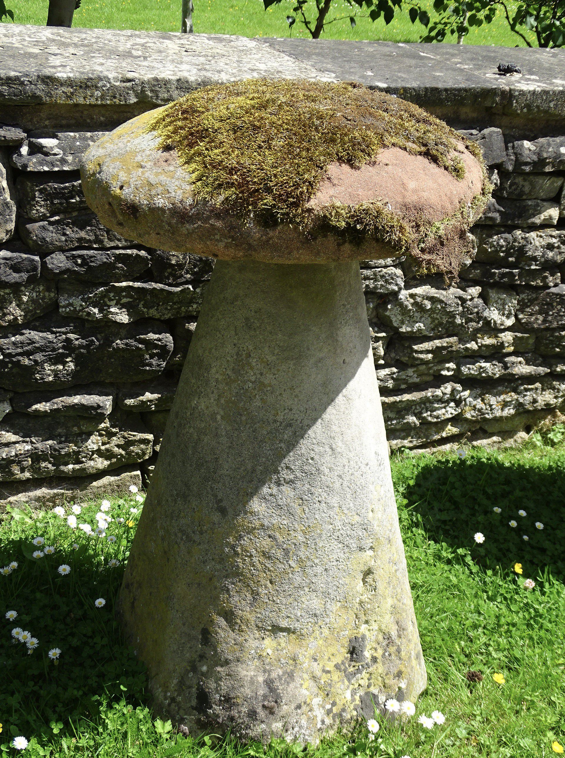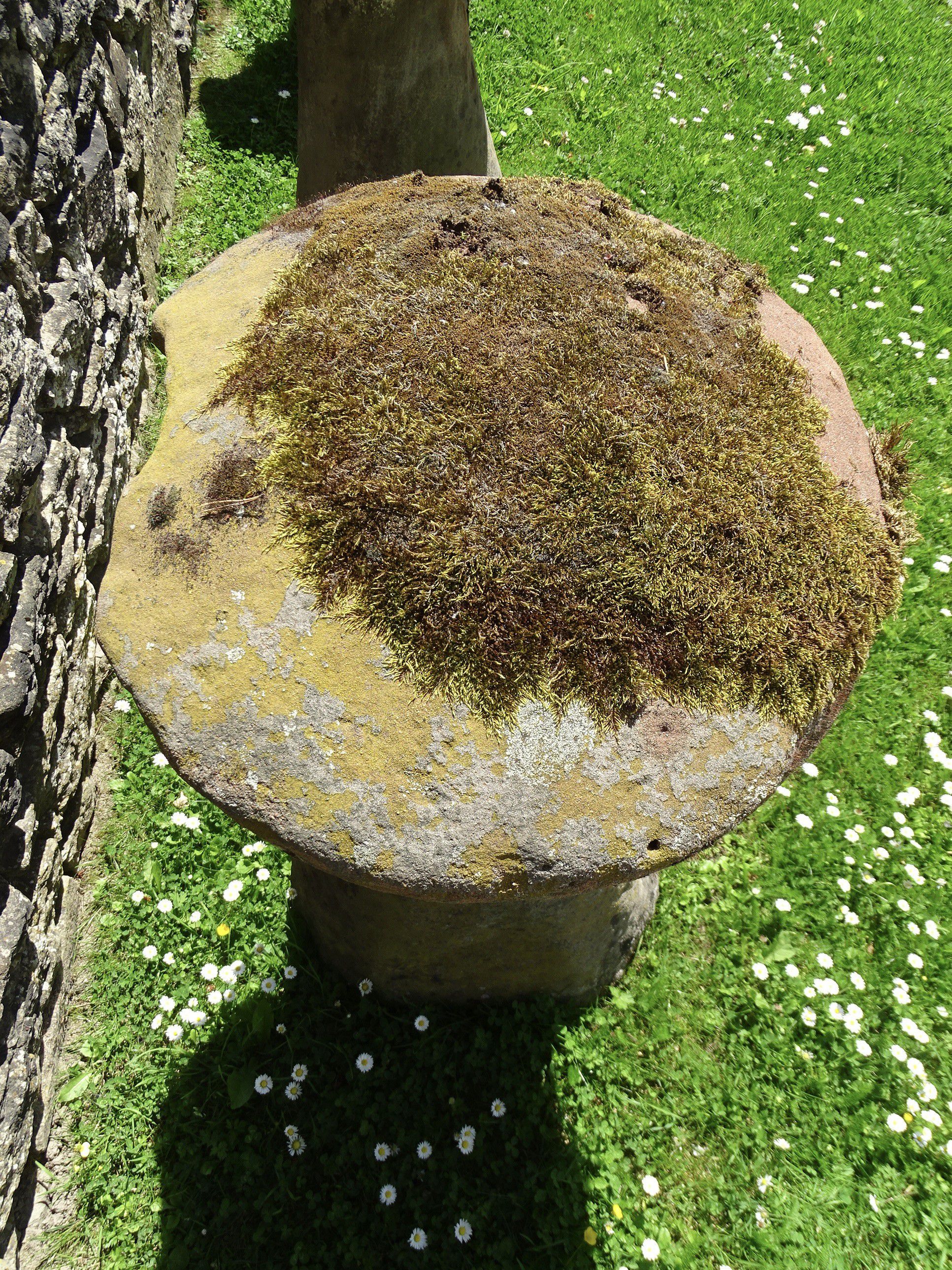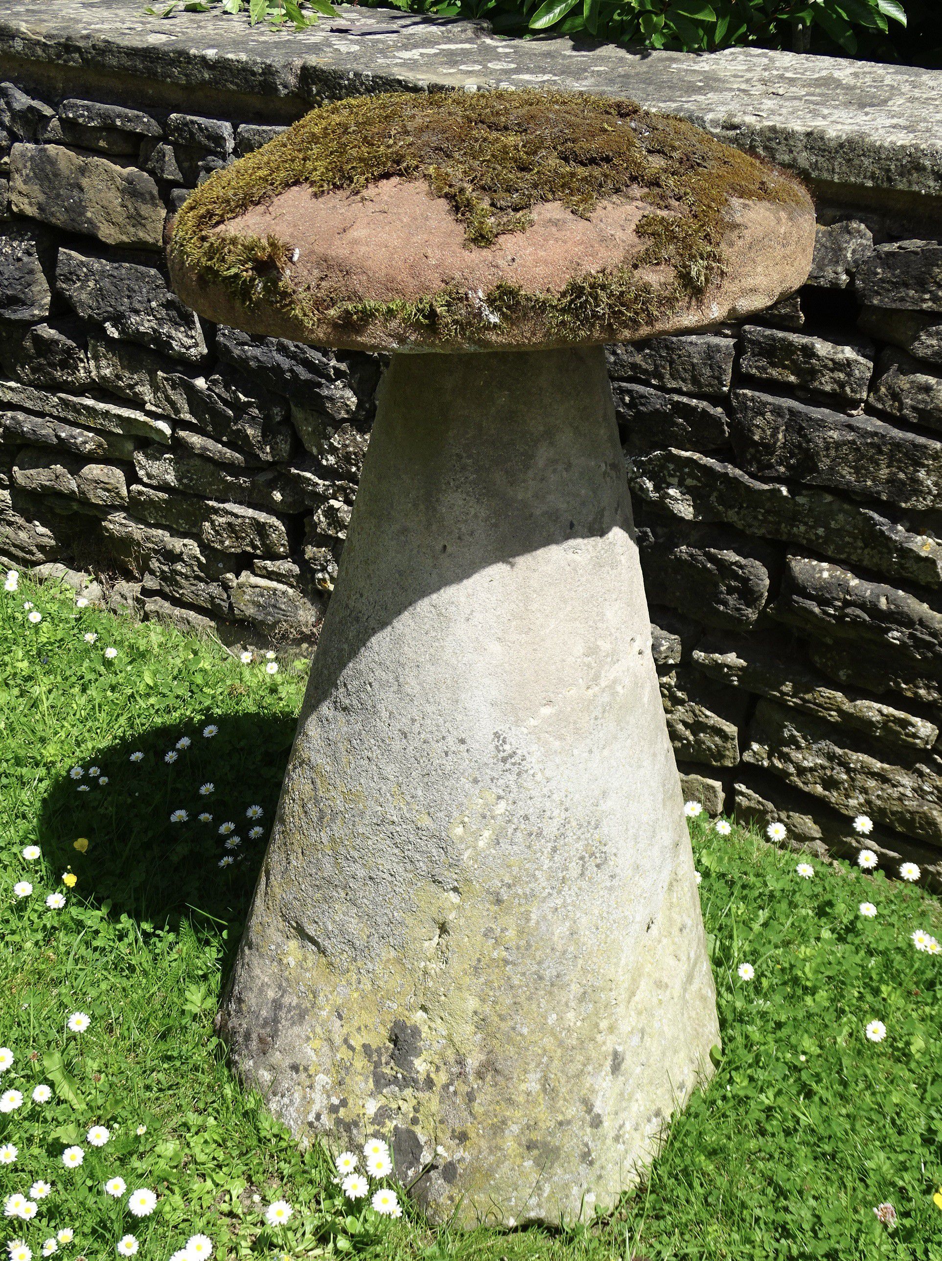 An antique sandstone staddlestone from North Warwickshire, the mossy round top supported on a tapered round base.