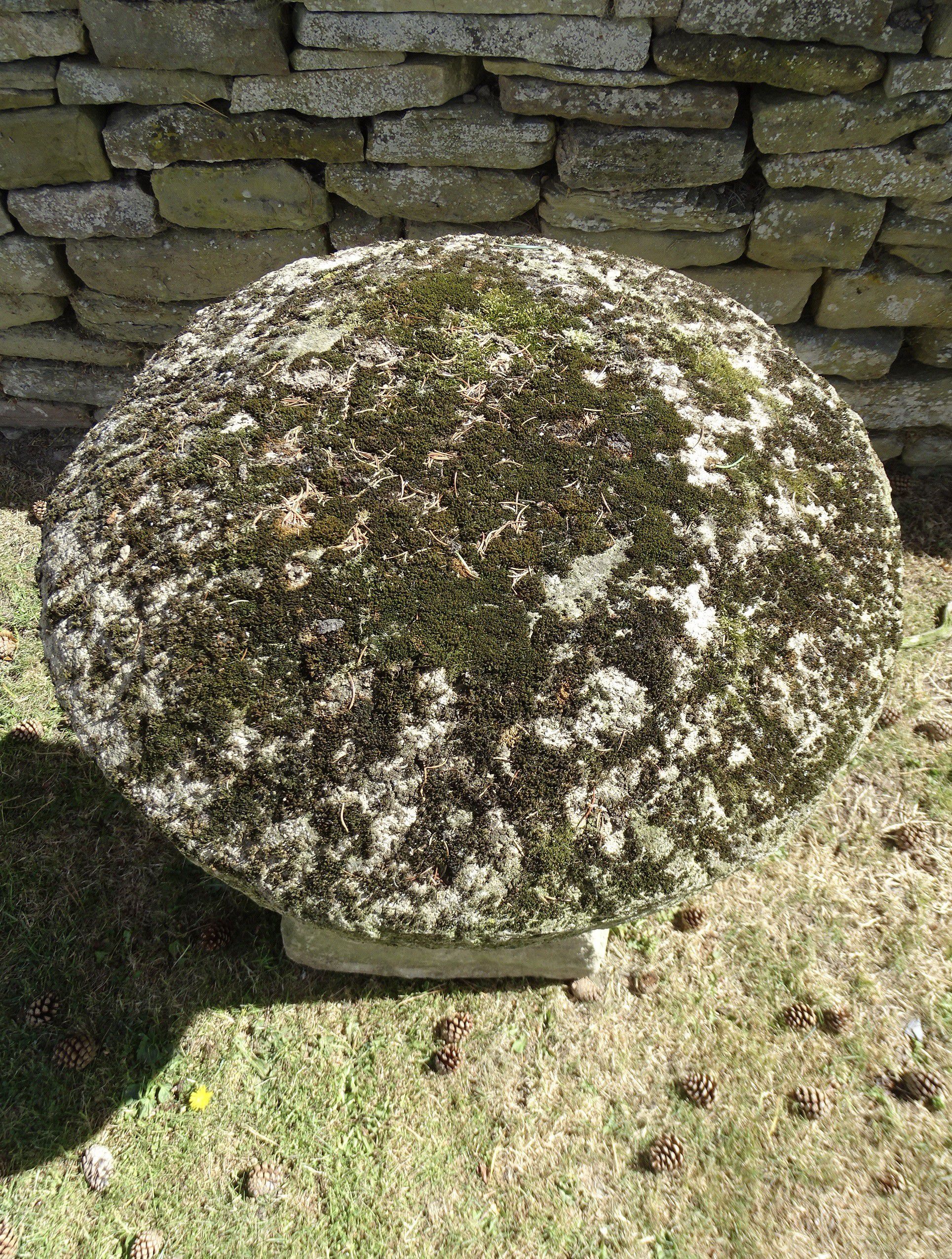 An antique Cotswold limestone staddlestone, large in scale with a well weathered round top on a tapered square base.
