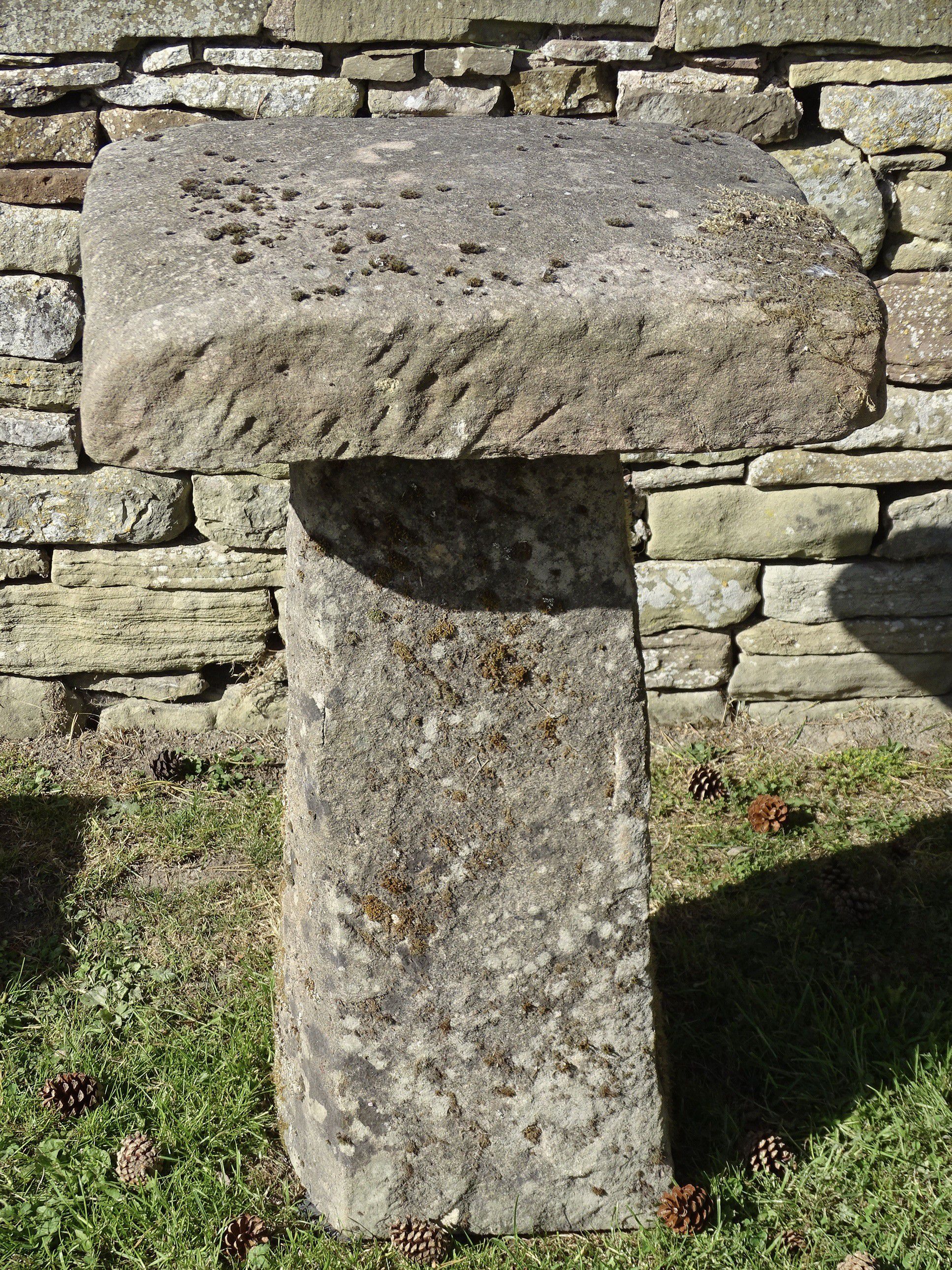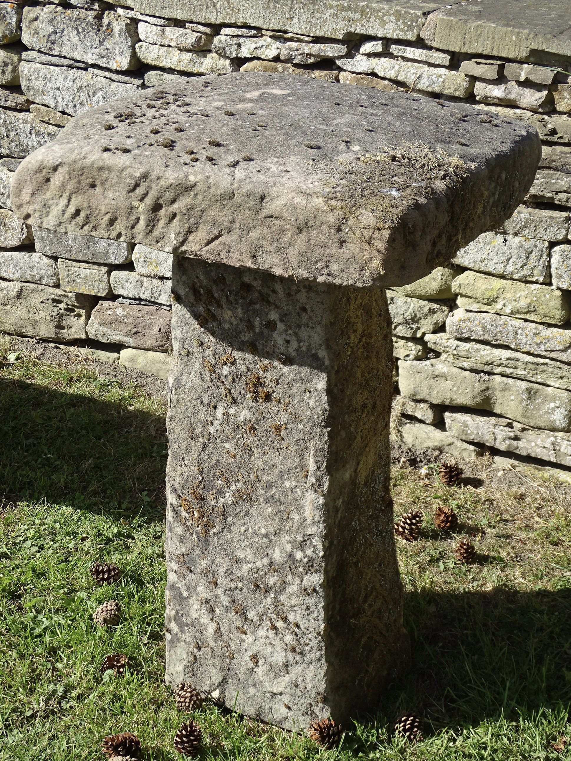 An antique sandstone satddlestone from Derbyshire, the large square top on a separate tapered base.