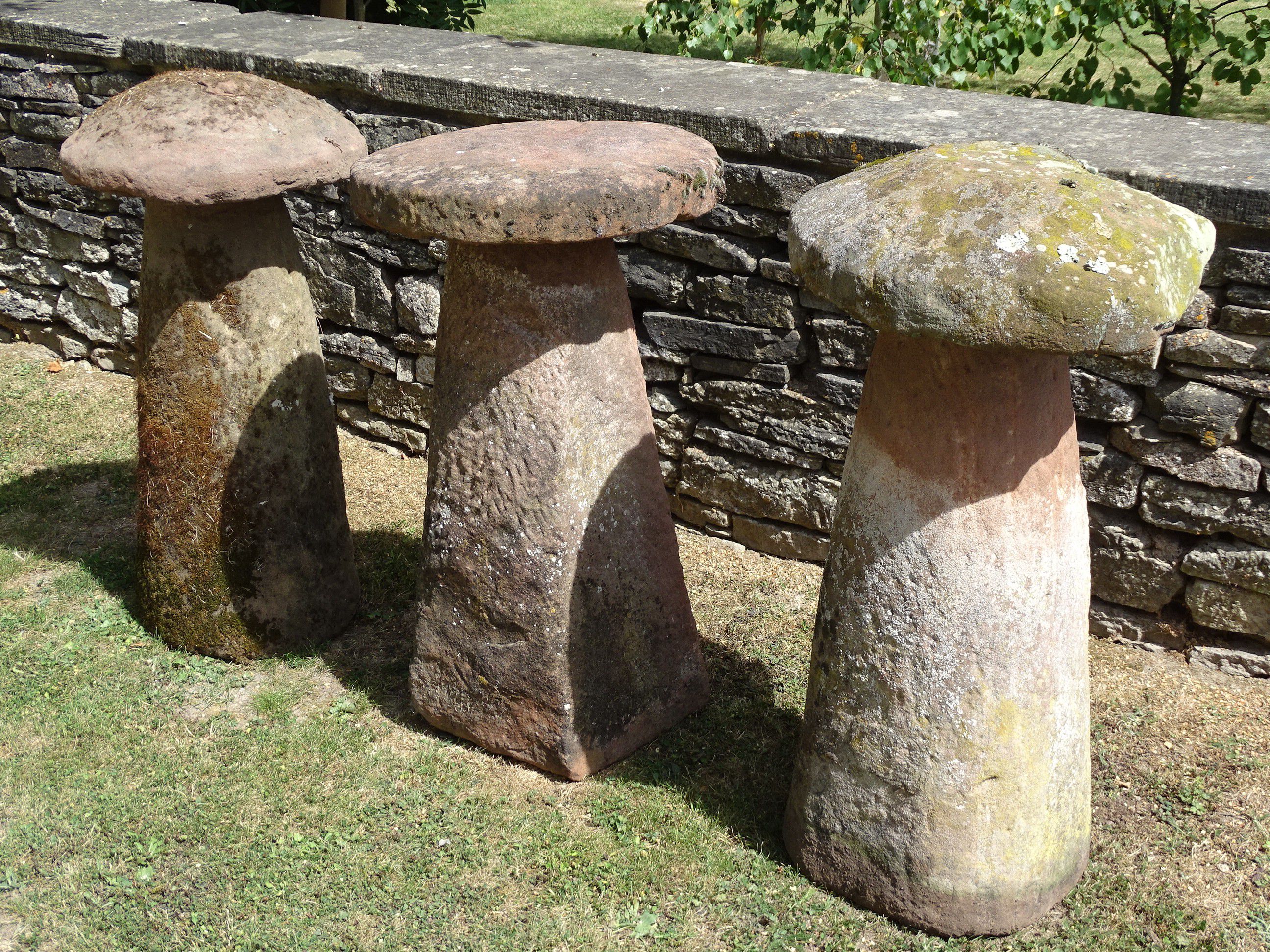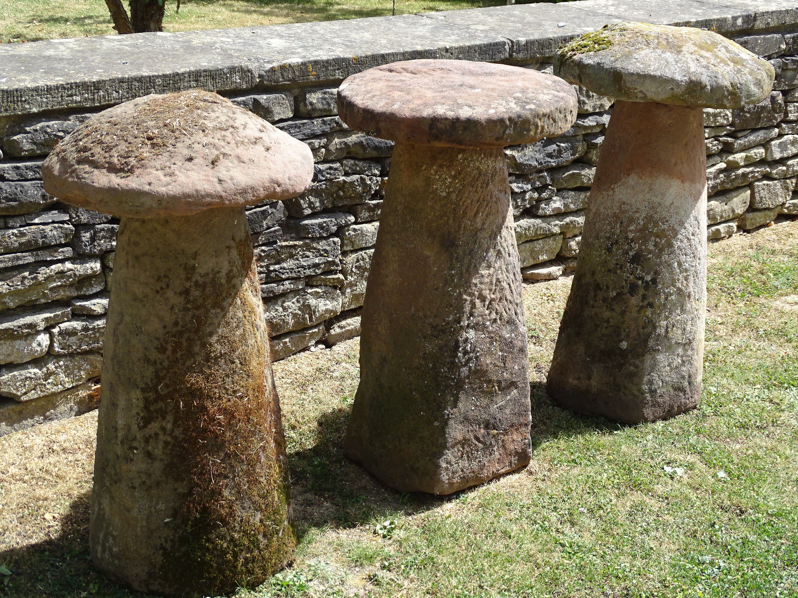Three similar antique sandstone staddlestones from Malvern, Worcestershire, each round top on a separate tapered base.