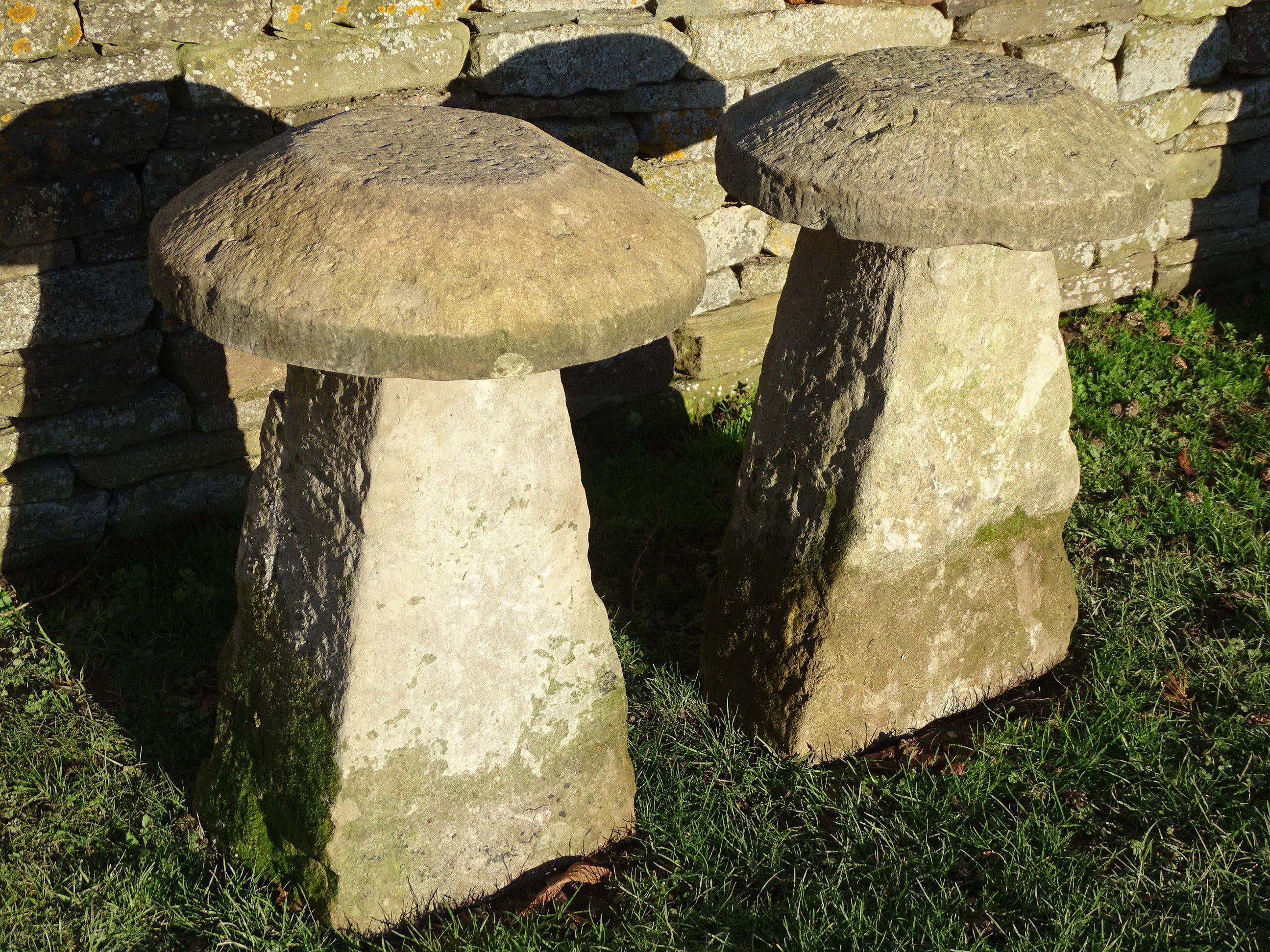 A good pair of antique staddlestones carved from a buff coloured sandstone, the round tops on tapered rectangular bases.