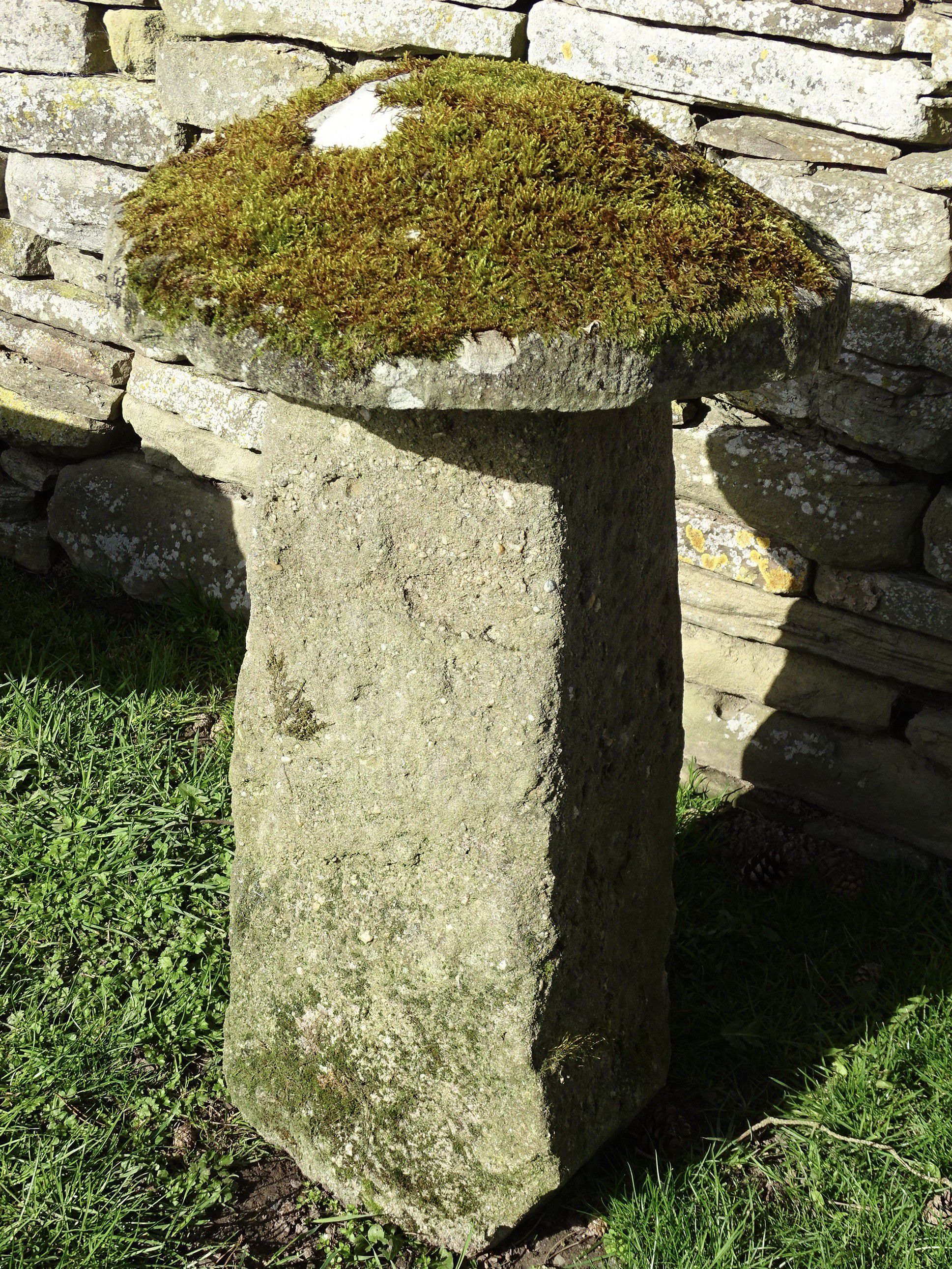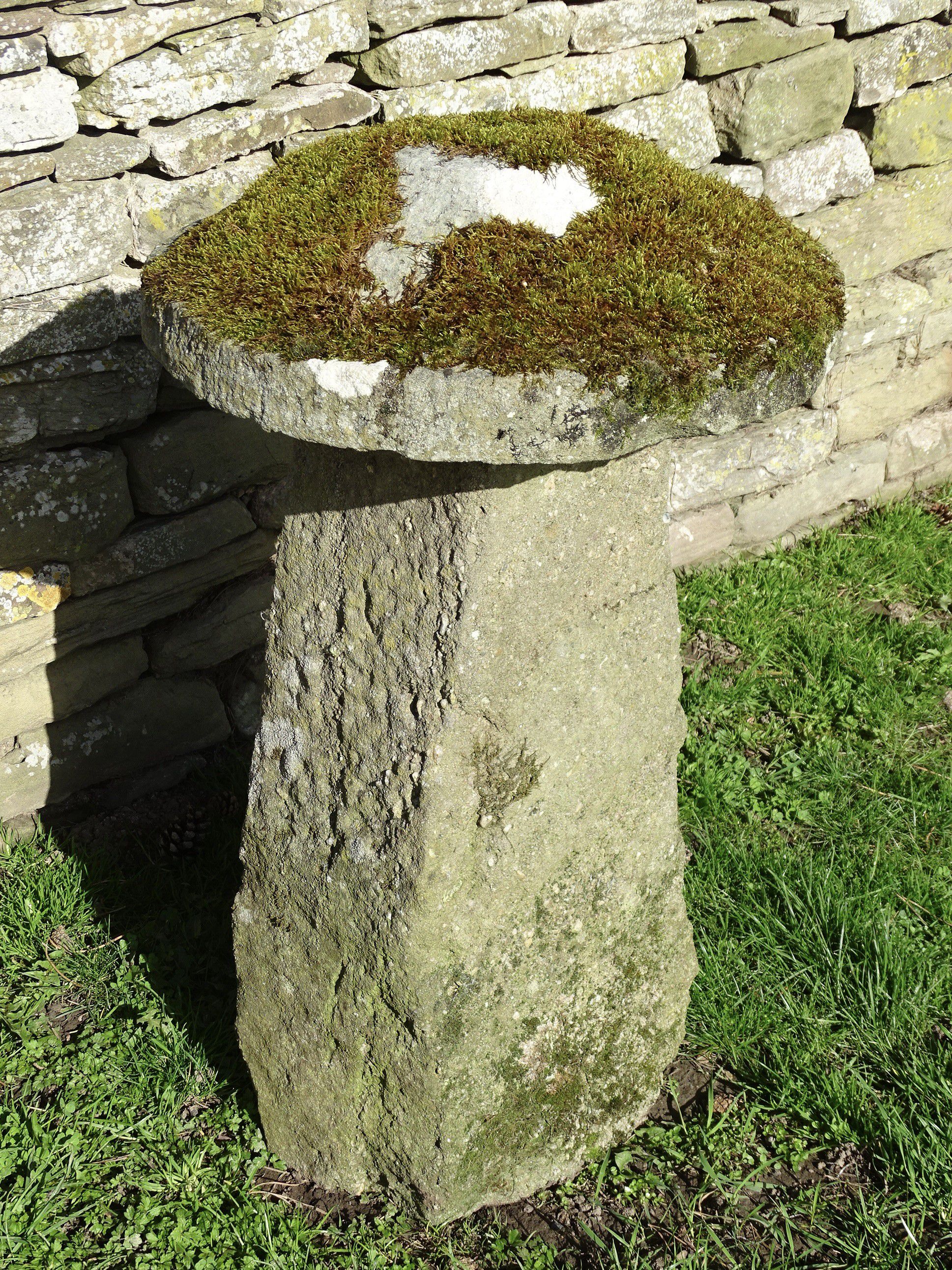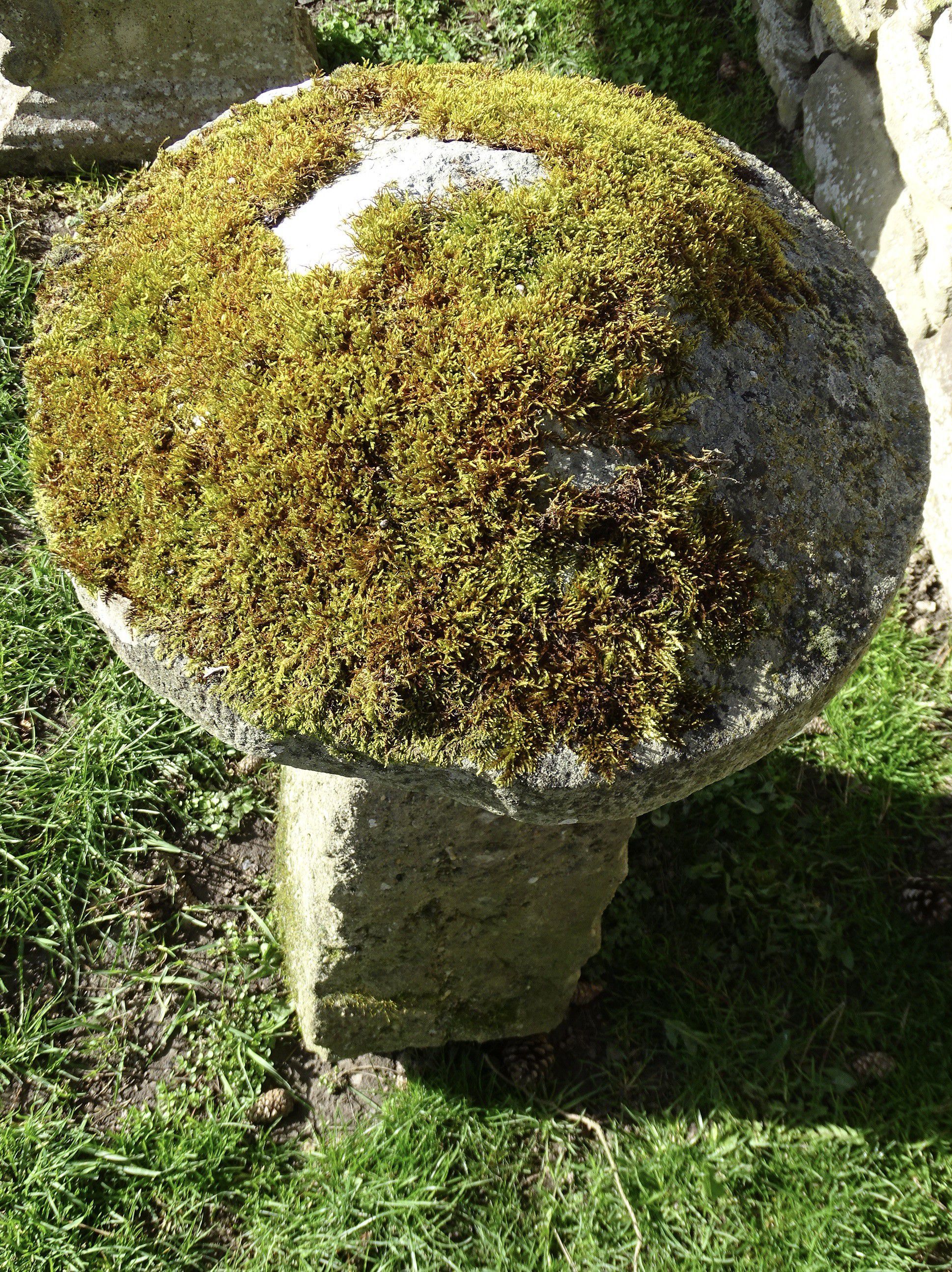 An antique staddlestone from Herefordshire, the mossy round top on a separate tapered stone base carved from a hard conglomerate stone.