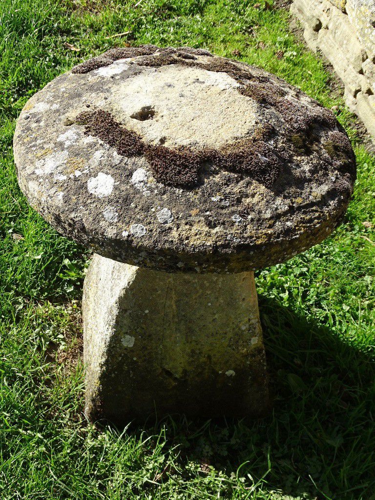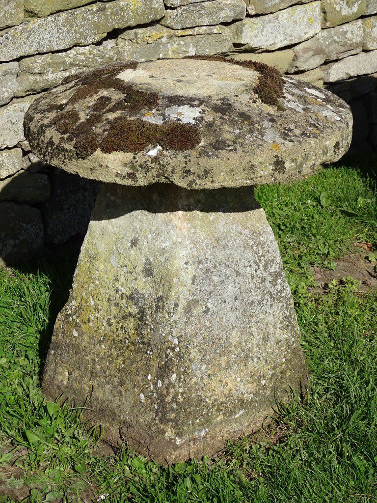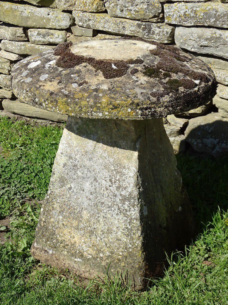 An antique limestone staddlestone from South Oxfordshire, the broad round top on a separate tapered square base.