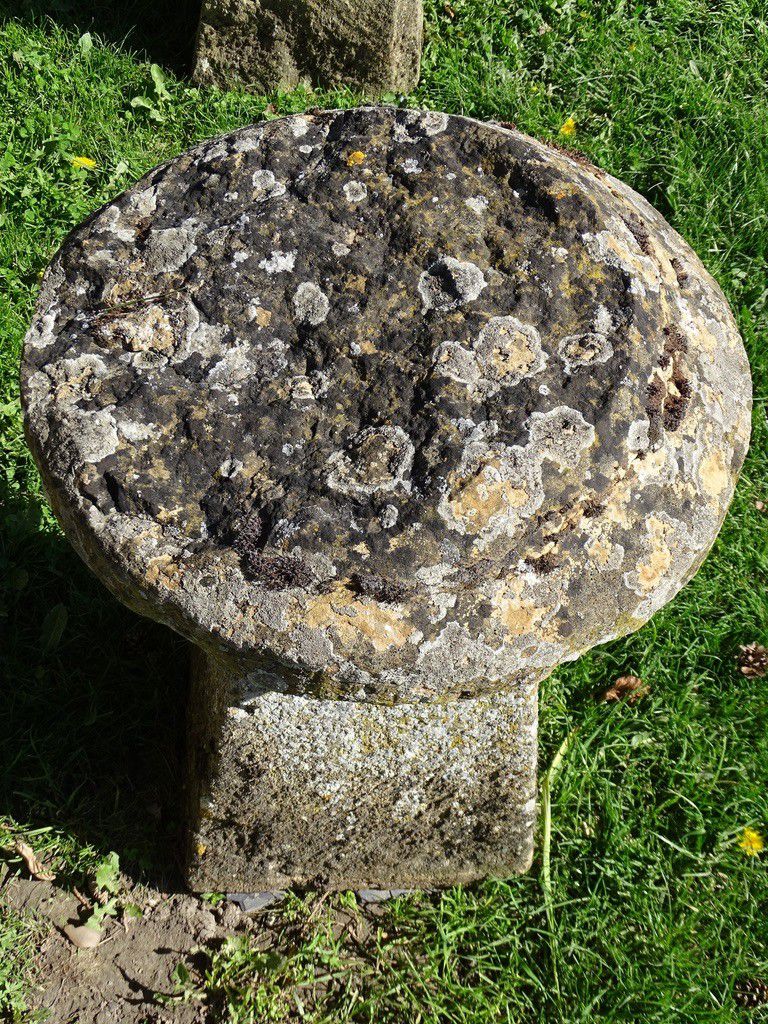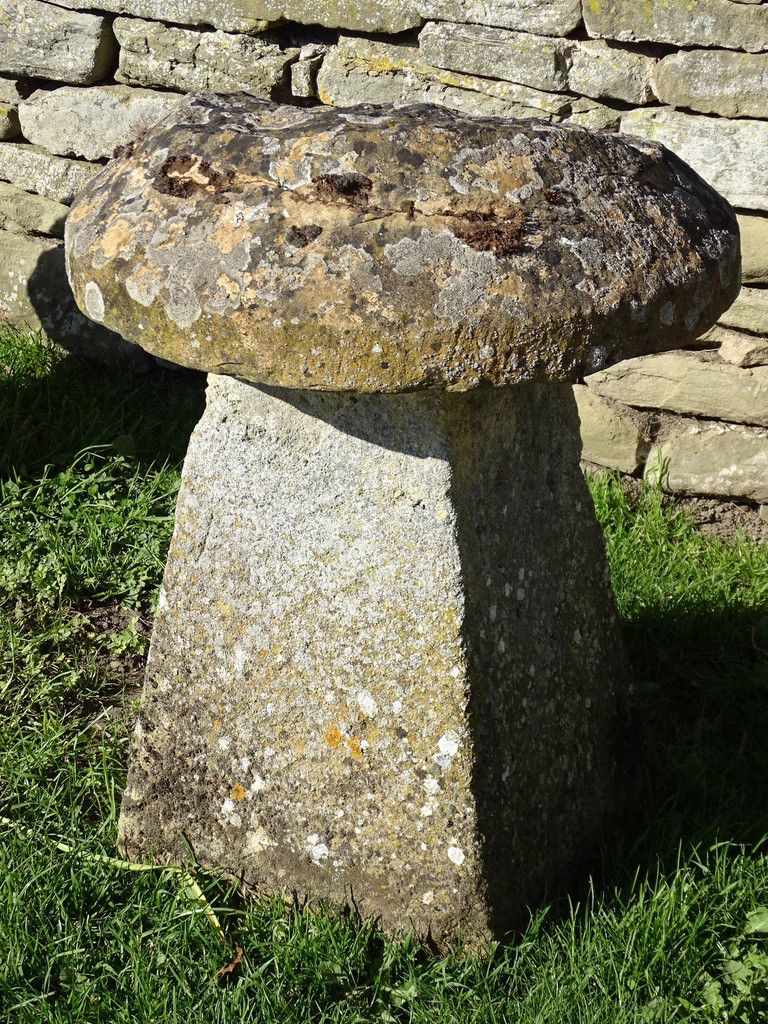 An antique limestone staddle stone from South Oxfordshire, the round top with old weathering losses on a separate tapered square base.