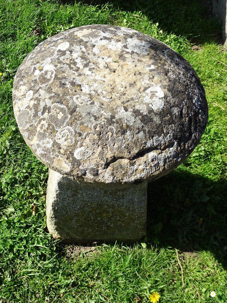 An antique limestone staddlestone from South Oxfordshire, the round top on a separate tapered square base.