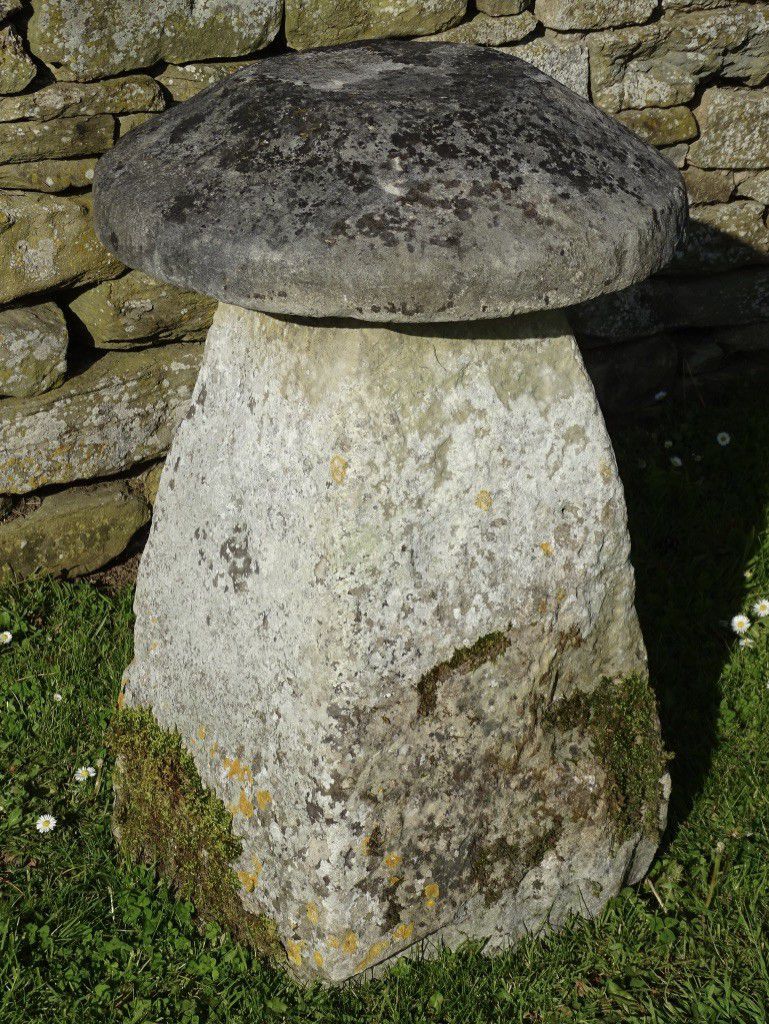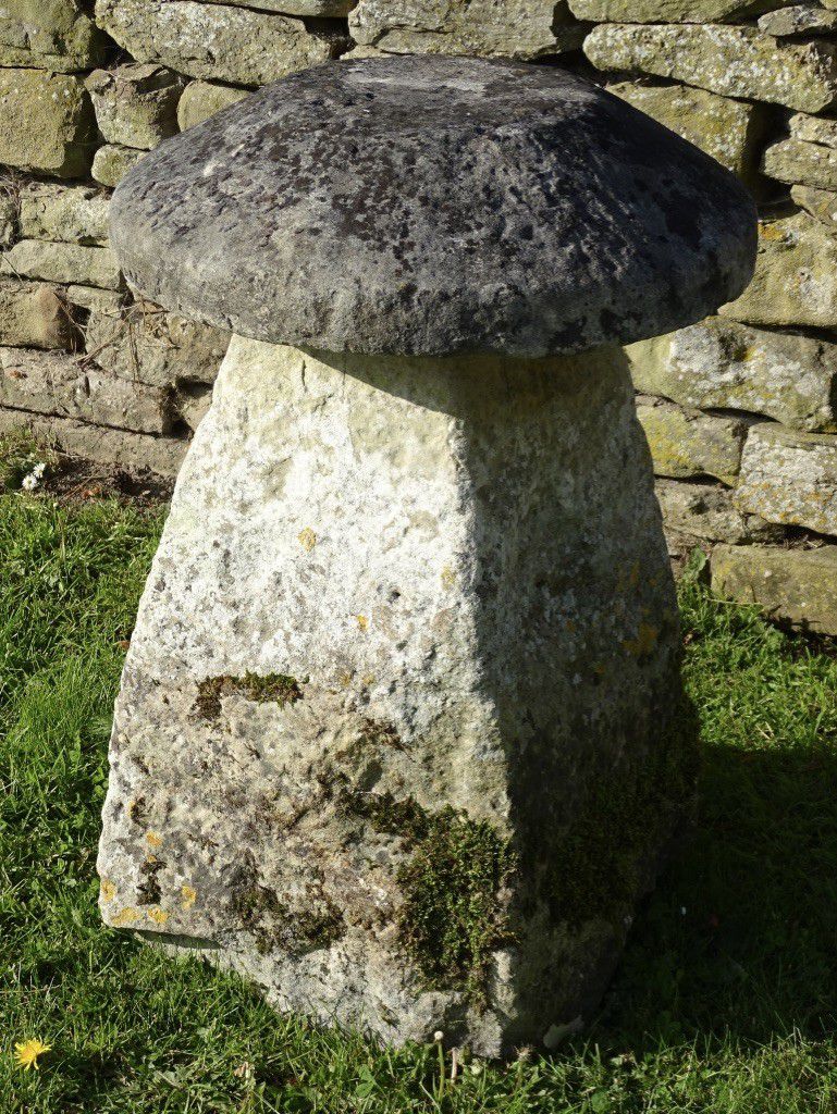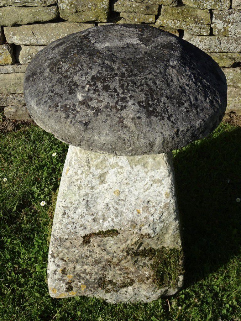 An antique limestone staddlestone from Dorset, the round top on a separate well weathered tapered base.