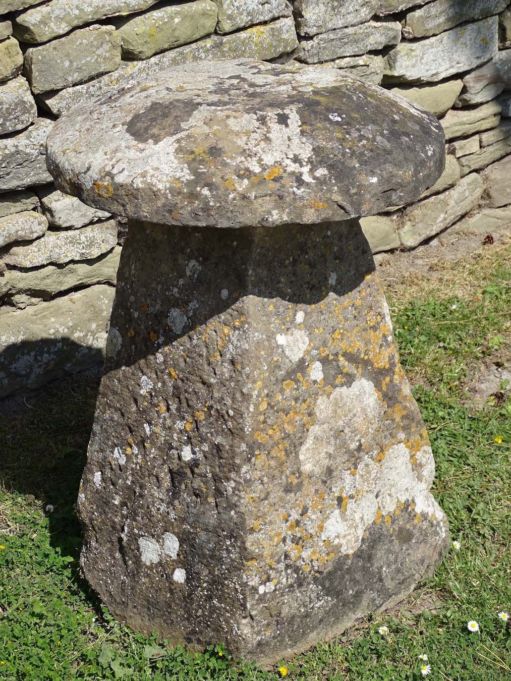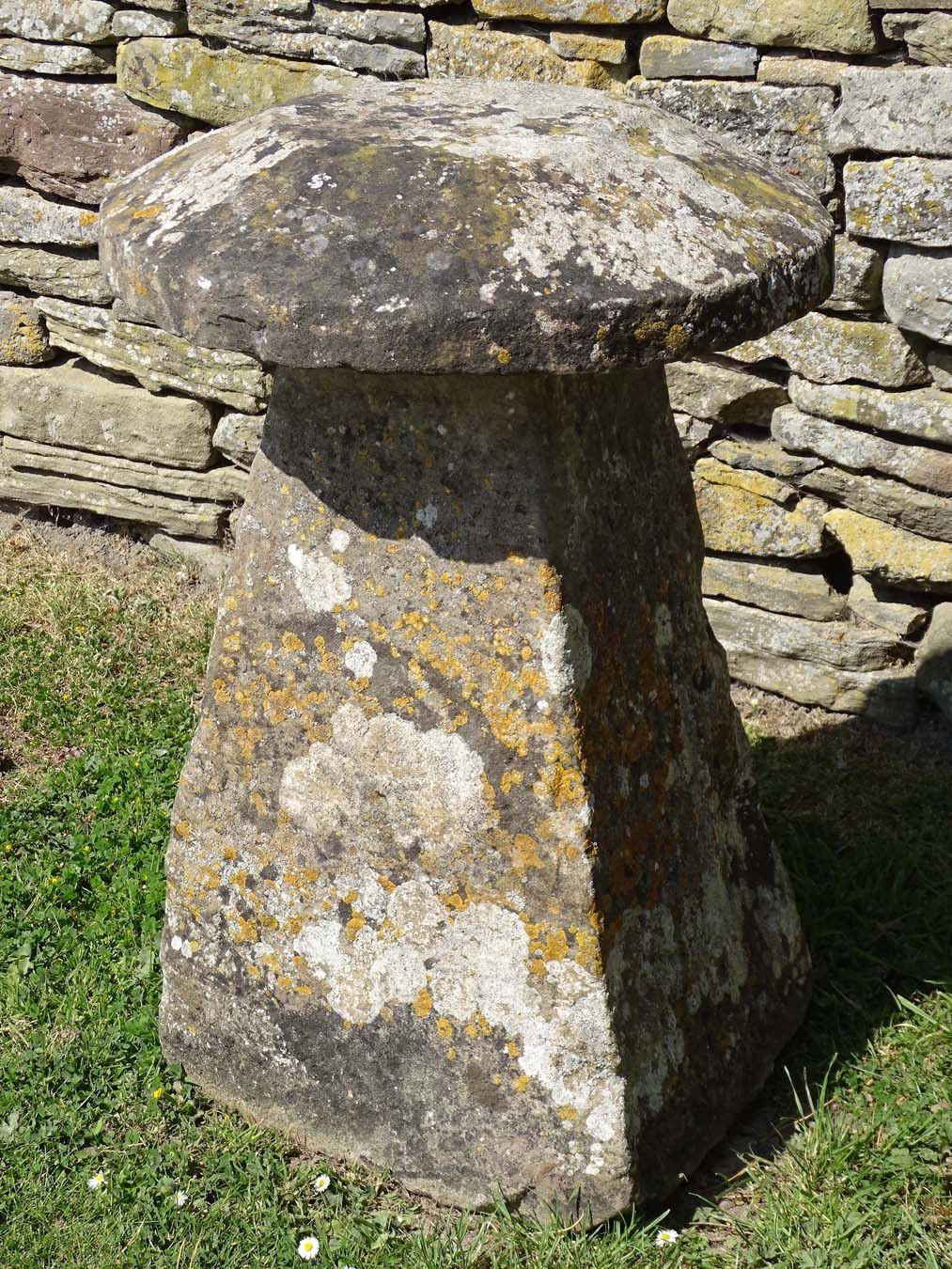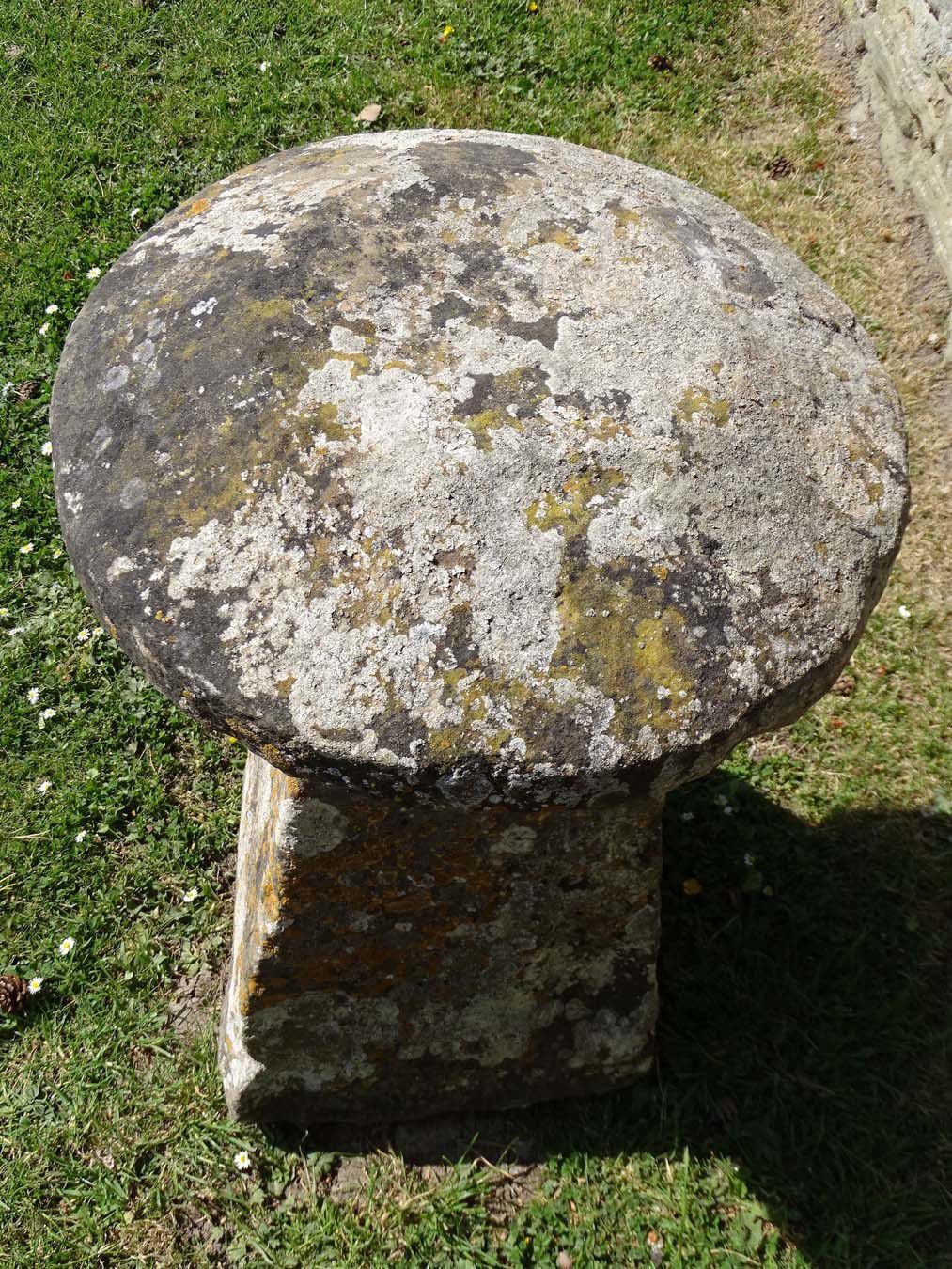 An antique limestone staddlestone from Gloucestershire, the well weathered round top on a tapered square base.