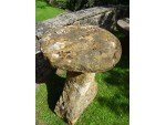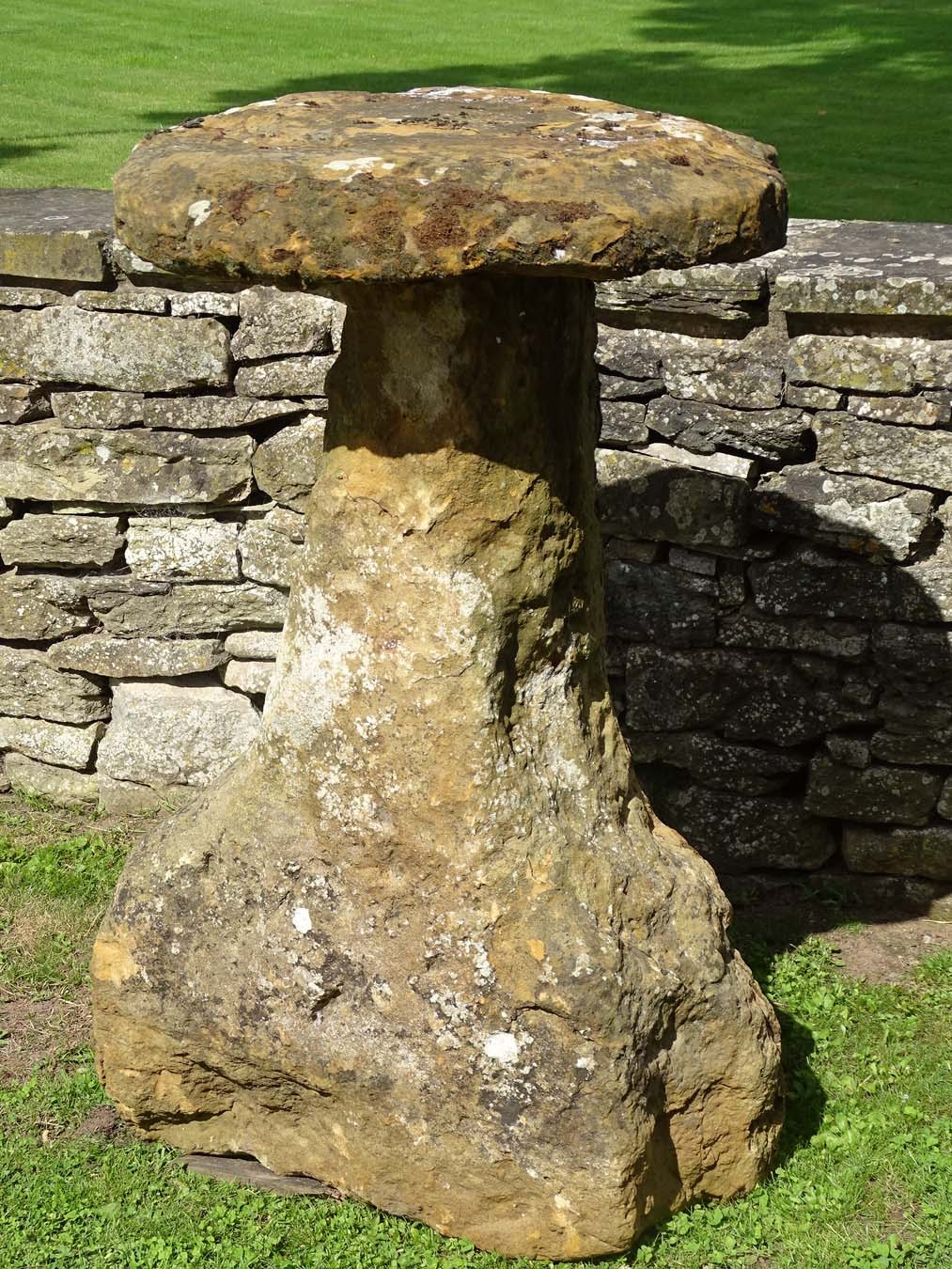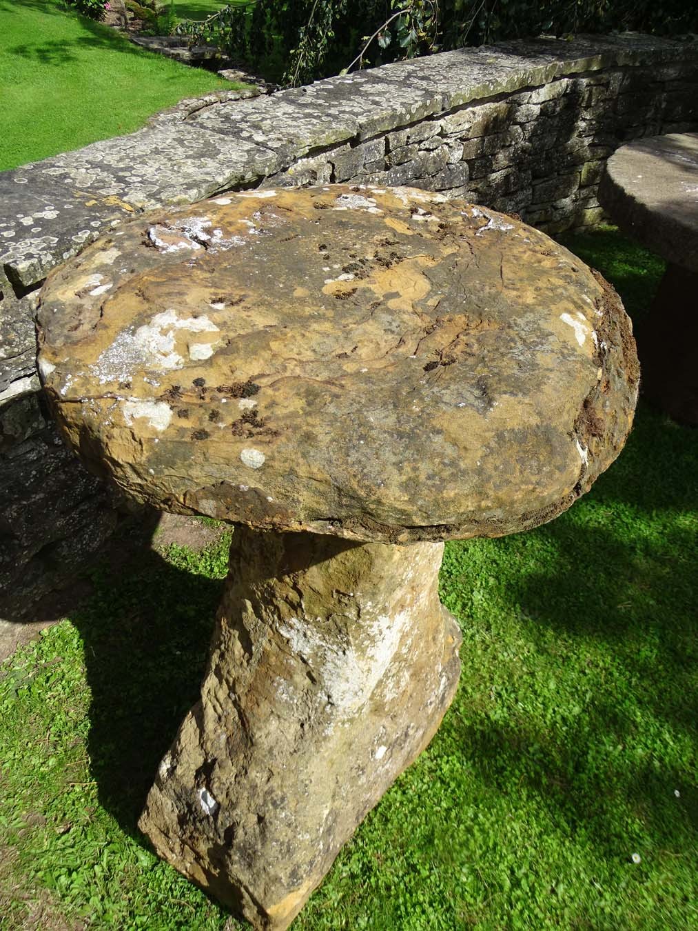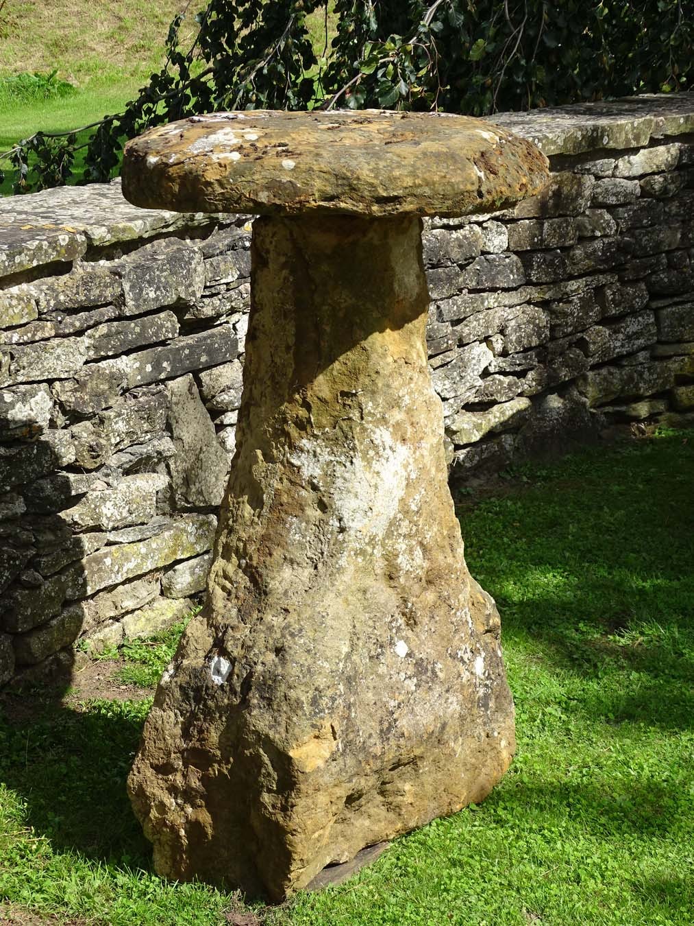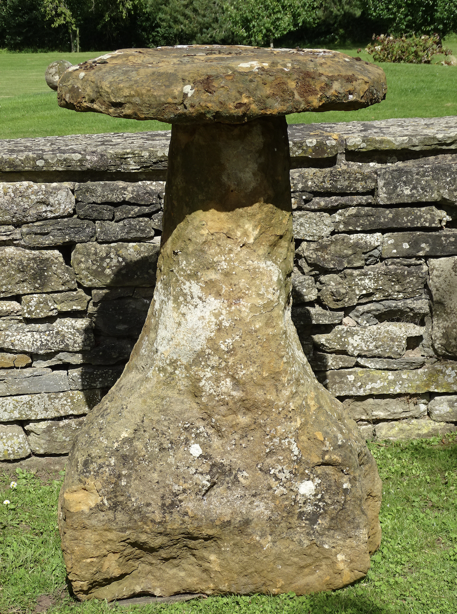 A large antique staddle stone, the round top on a separate tapered base. Carved from what looks like ironstone and unusually large, this staddle stone probably originated from the Northamptonshire area and could be used as a standalone garden feature. It would look very effective if the base could be set into the earth slightly so that it appears to have come up from underground.