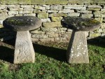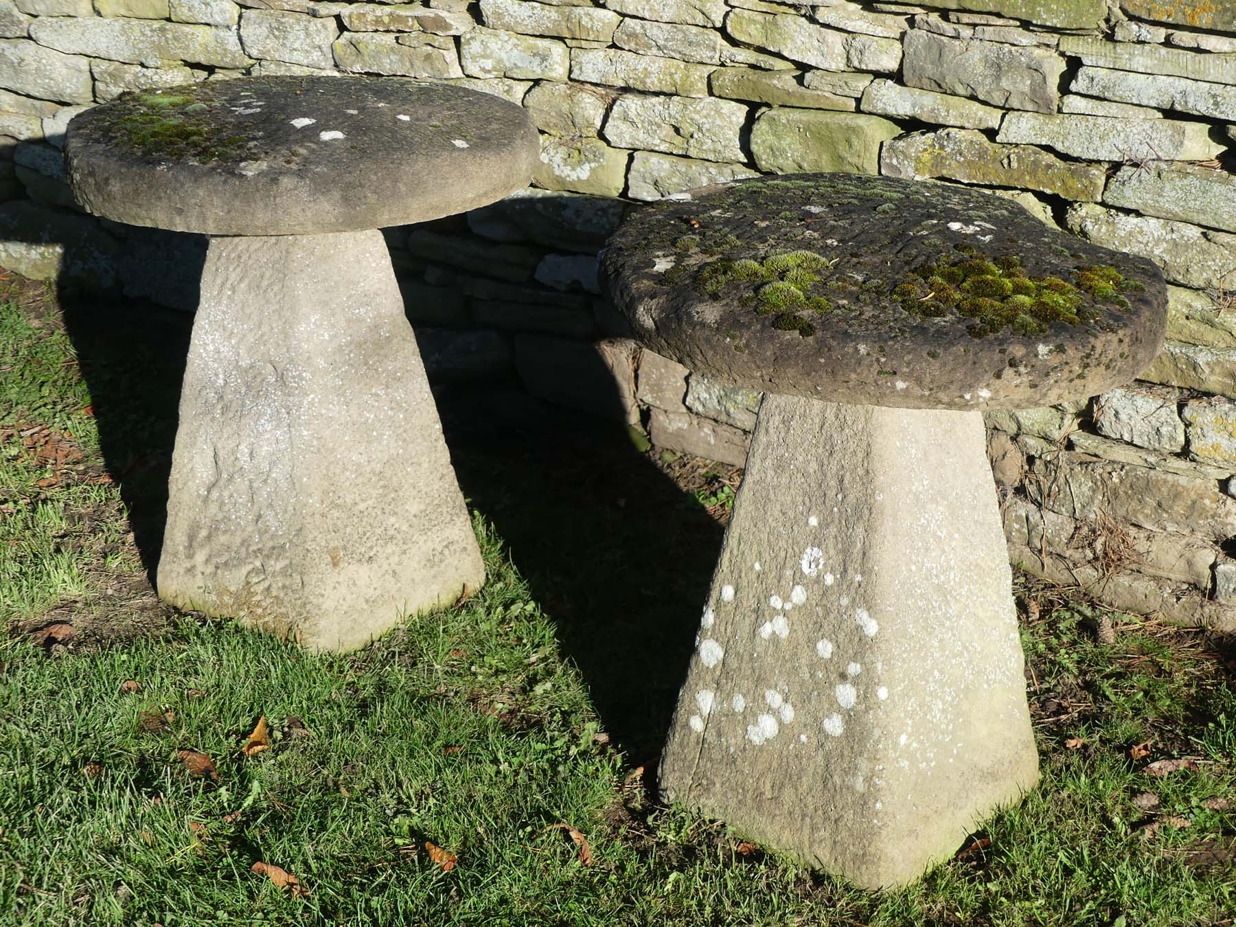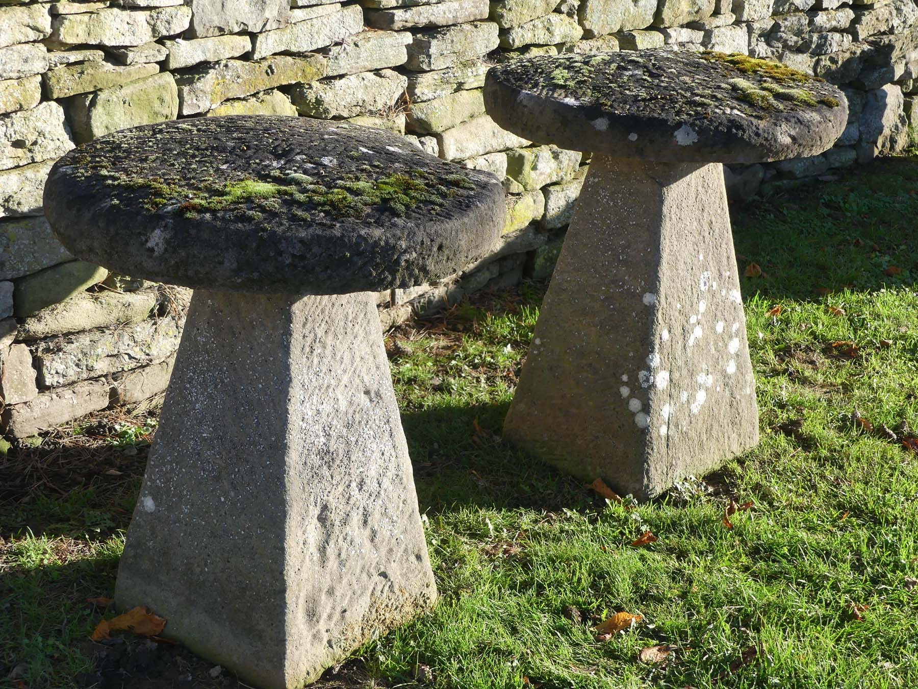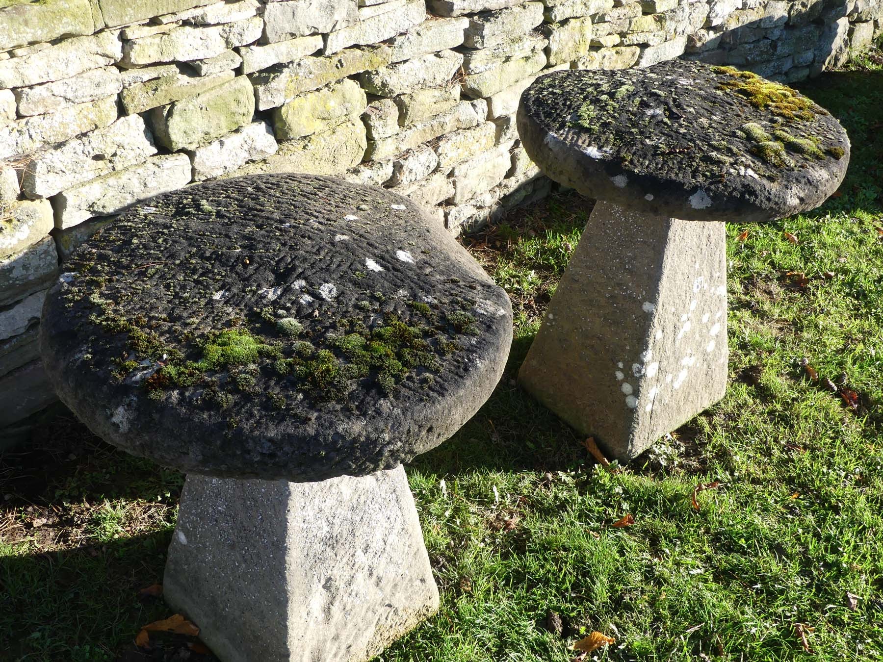 A group of weathered composition stone staddlestones, the round tops on separate tapered square bases. These staddlestones were handmade in the last century by a private garden owner for his own use and these are the last ones remaining from a long set of over 20.