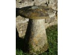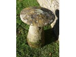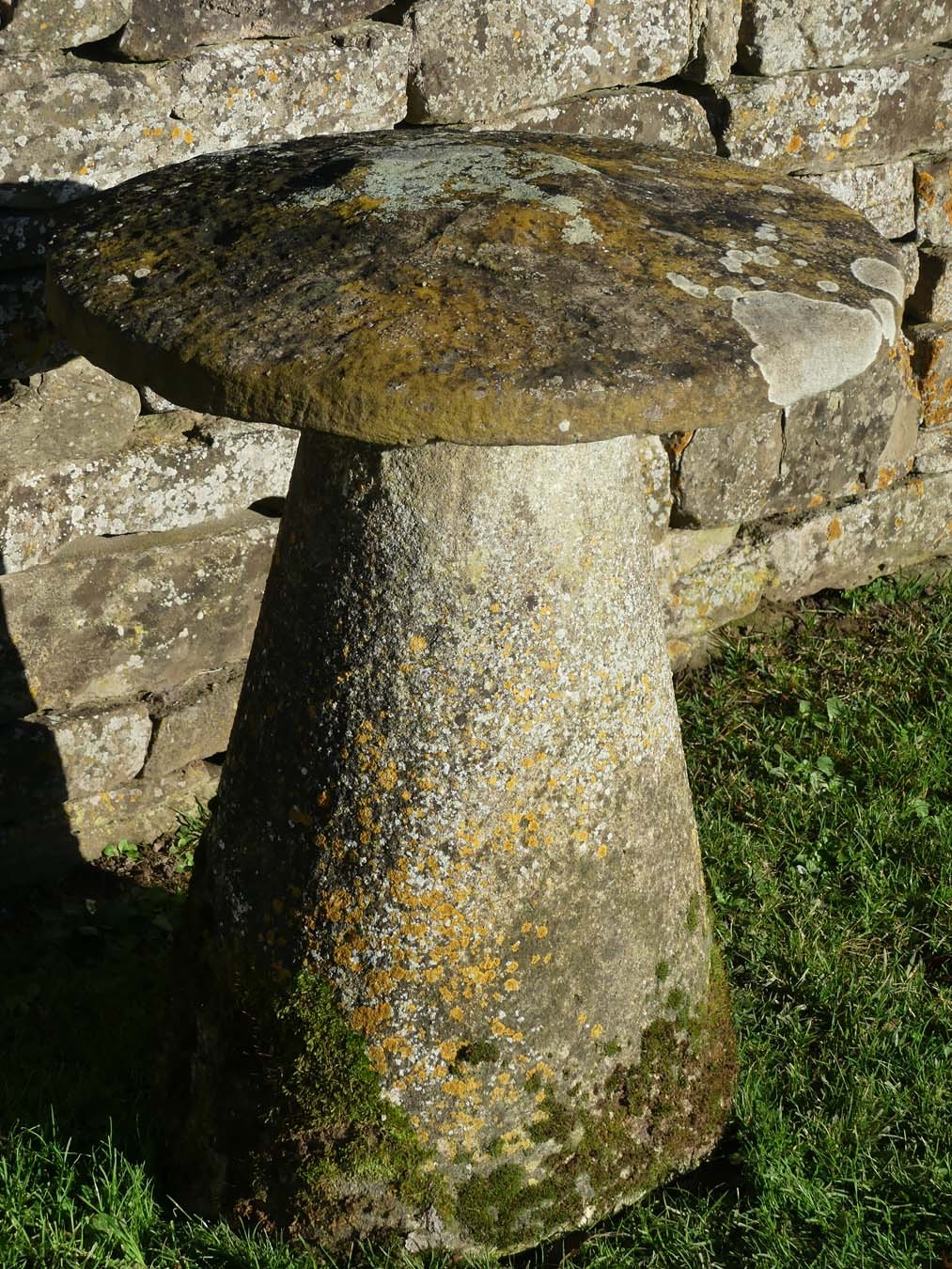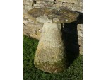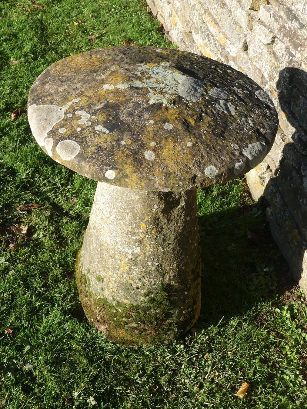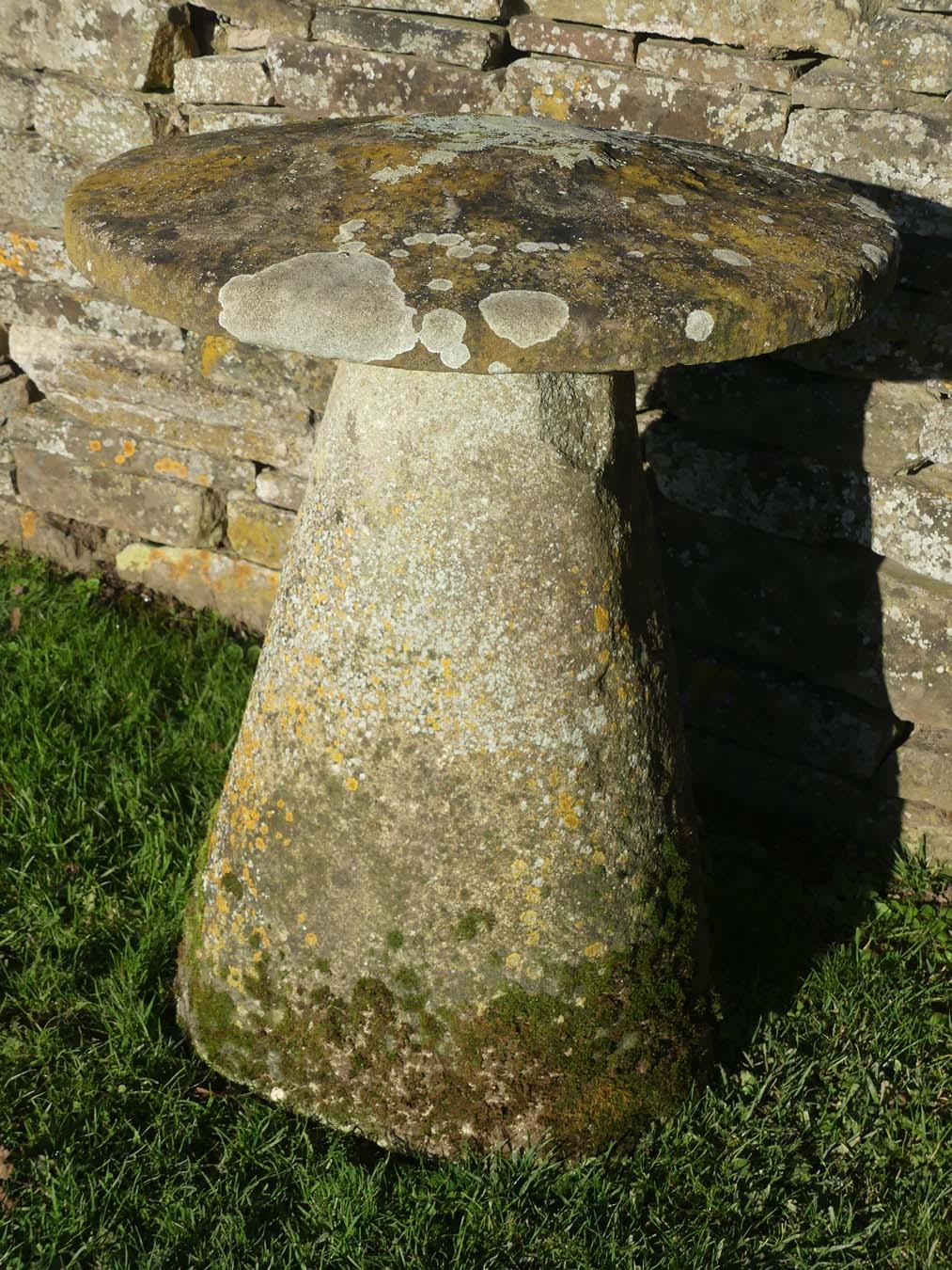 An antique limestone staddlestone from Gloucestershire, the slightly domed thin round top on a separate tapered round base. This is an unusual and elegant staddlestone with a well established weathered patination.