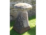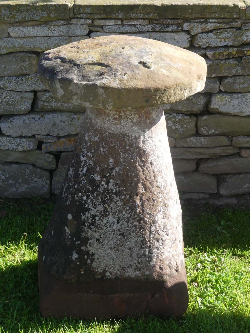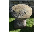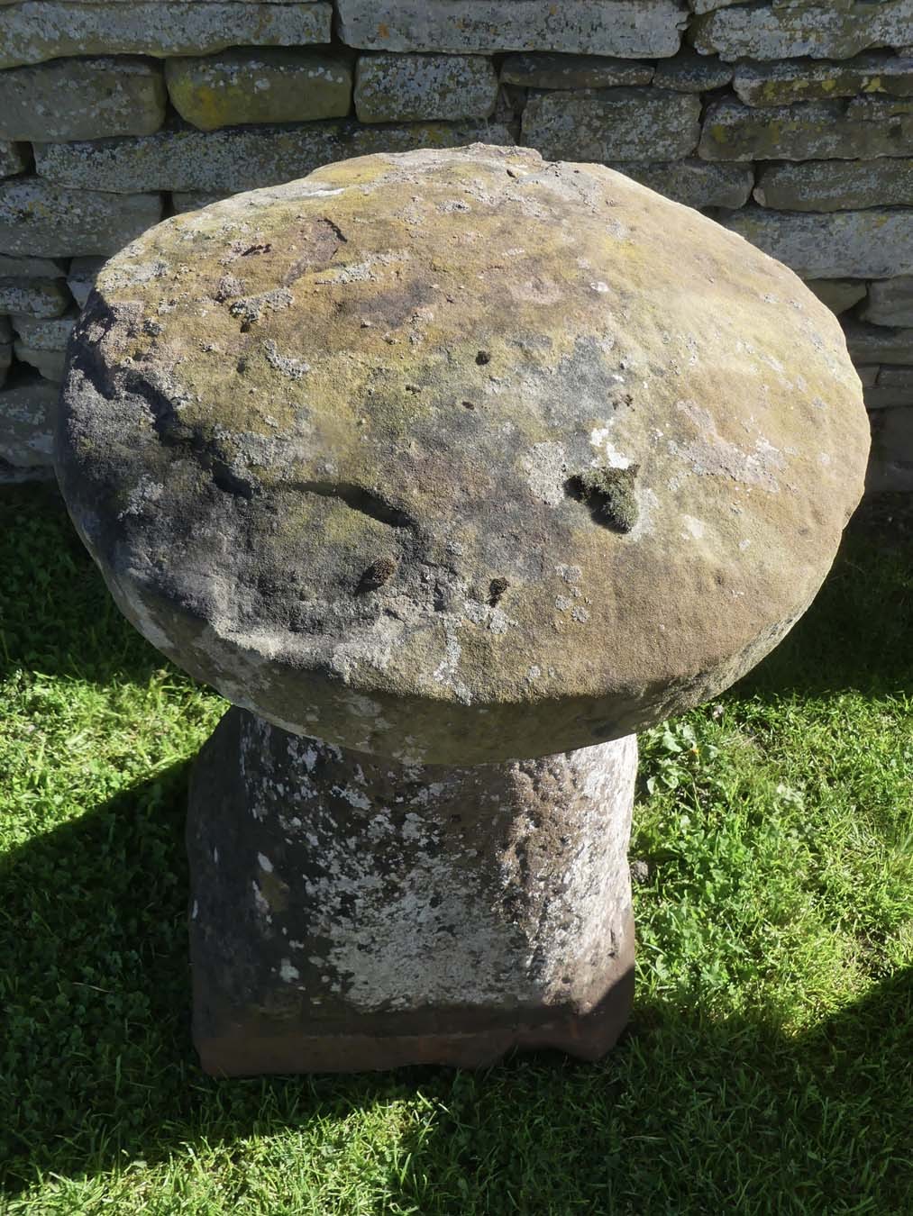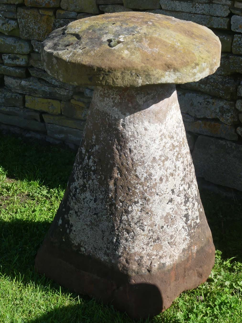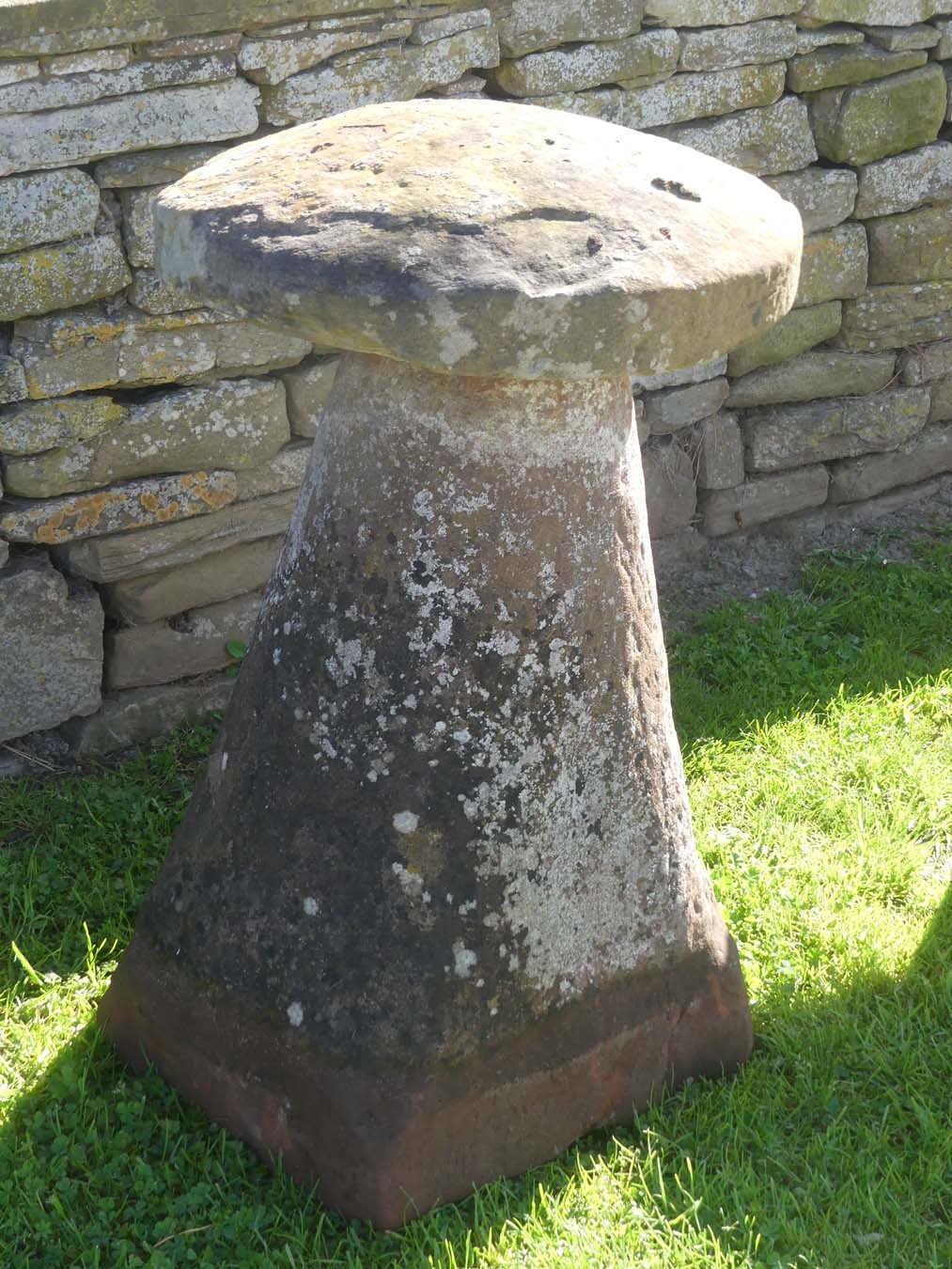 An antique sandstone staddlestone from the North Midlands, near Ashby de la Zouch, the round top on a separate tapered round base. This is a large and genuine old staddlestone with an attractive weathered patination.