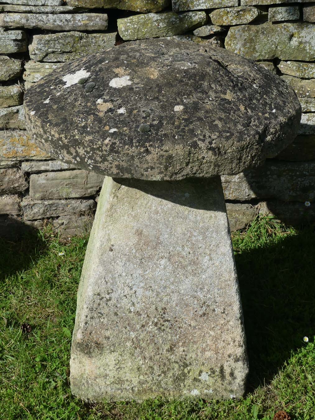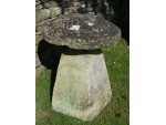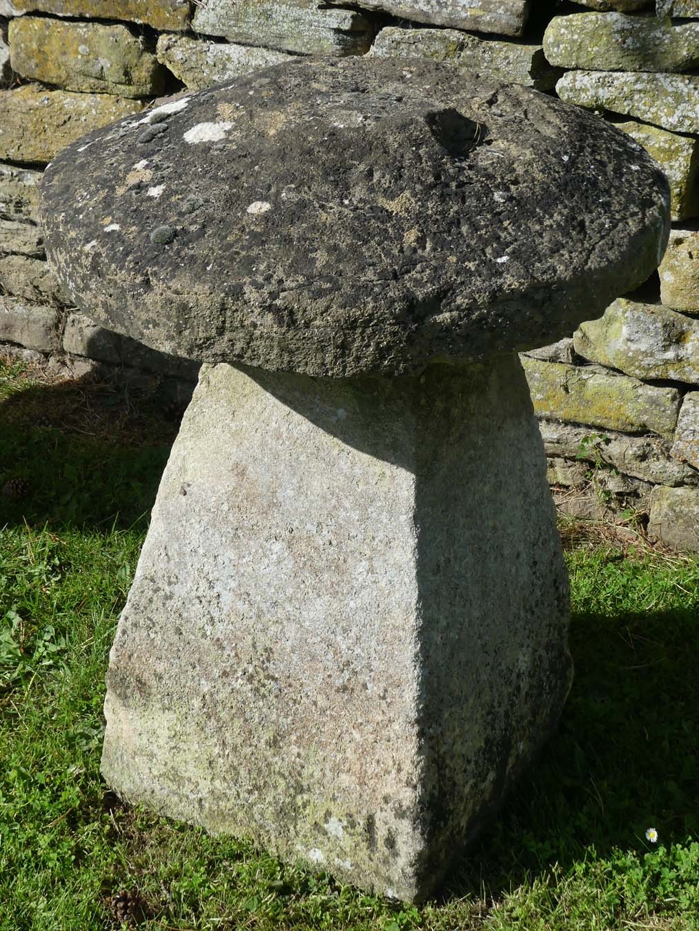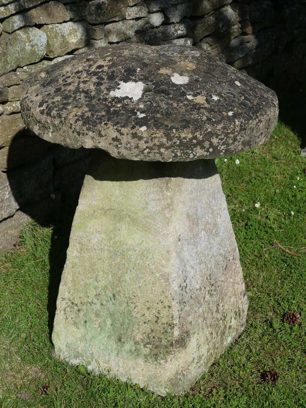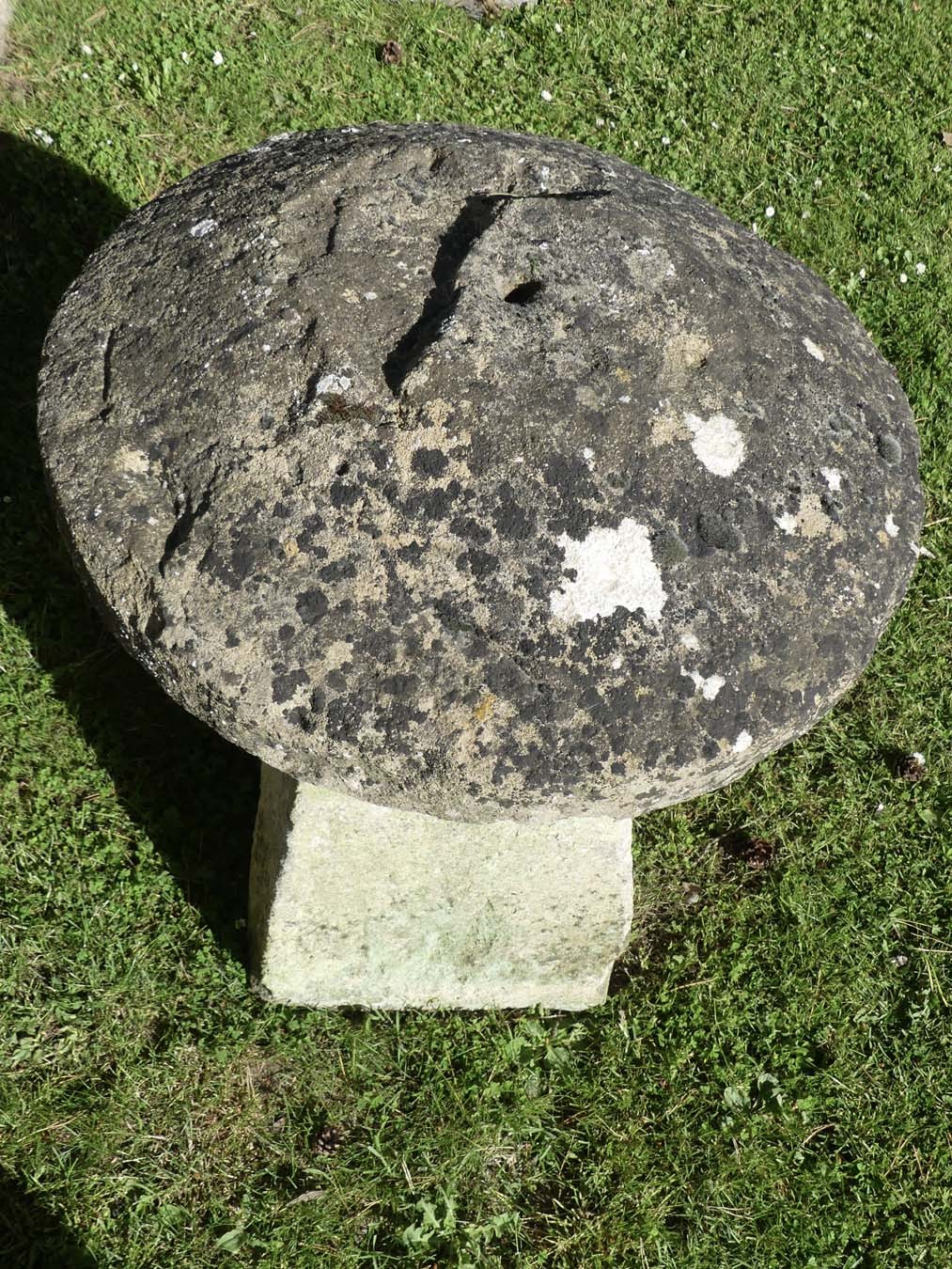 A good antique limestone staddle stone from South Worcestershire, the round top on a separate tapered square base.
