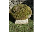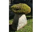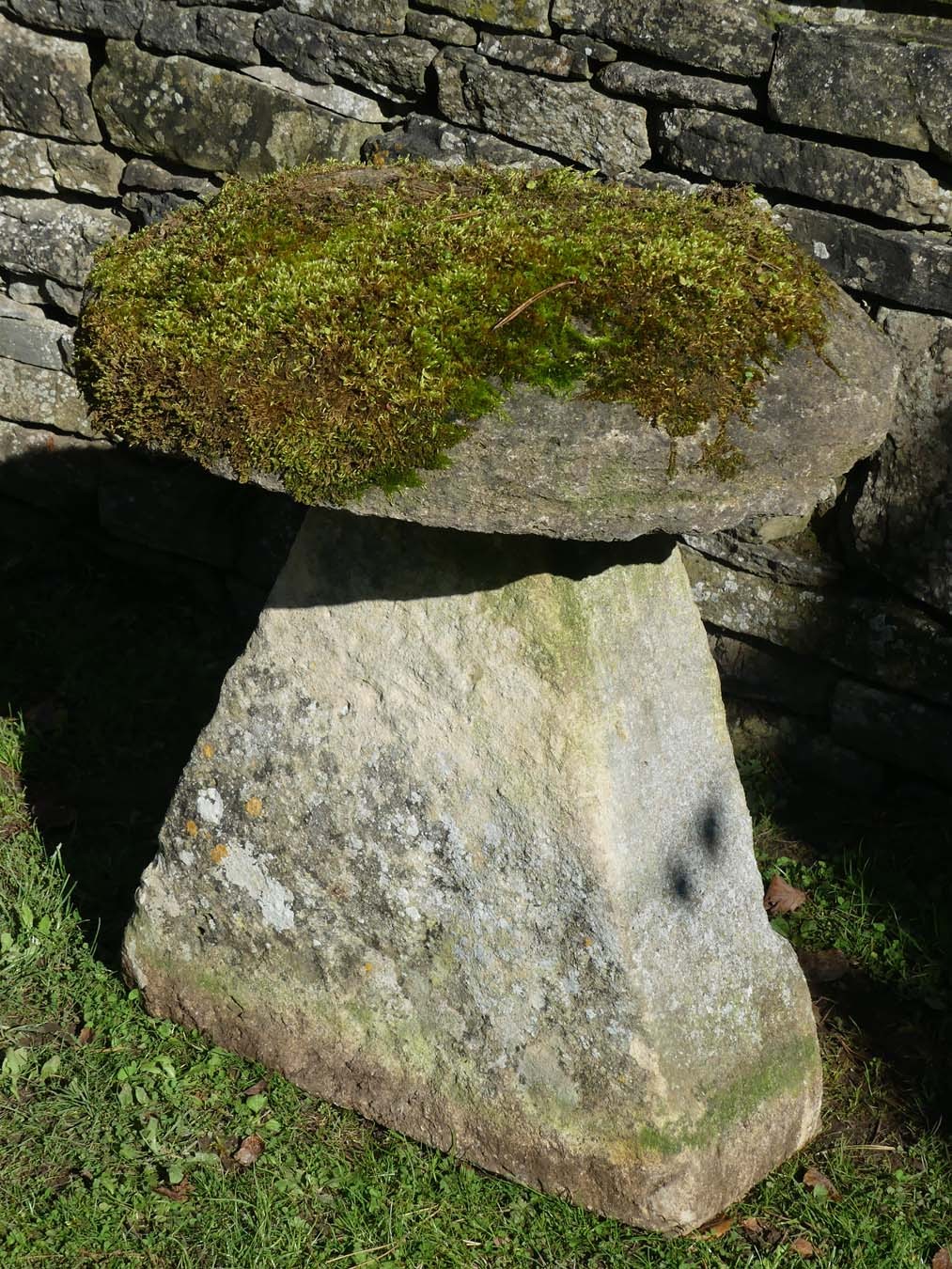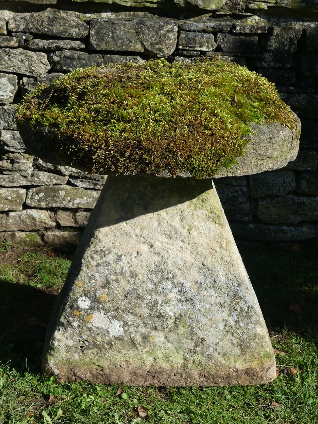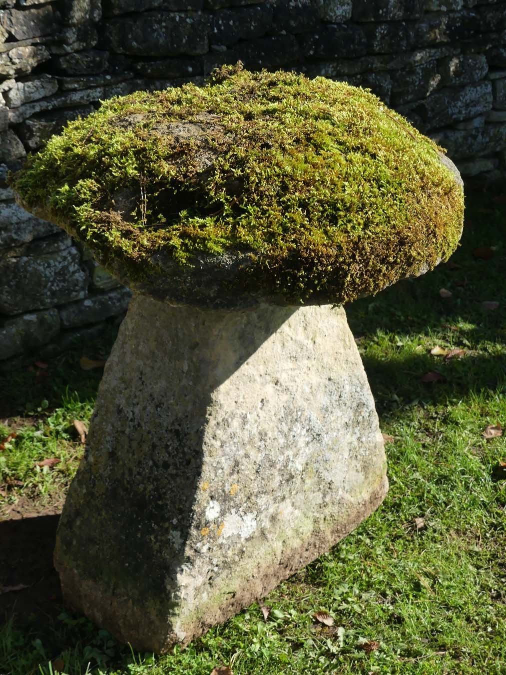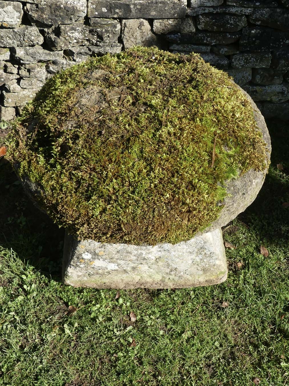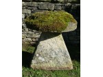 An antique limestone staddle stone from Gloucestershire, the mossy round top on a separate rectangular tapered base.
