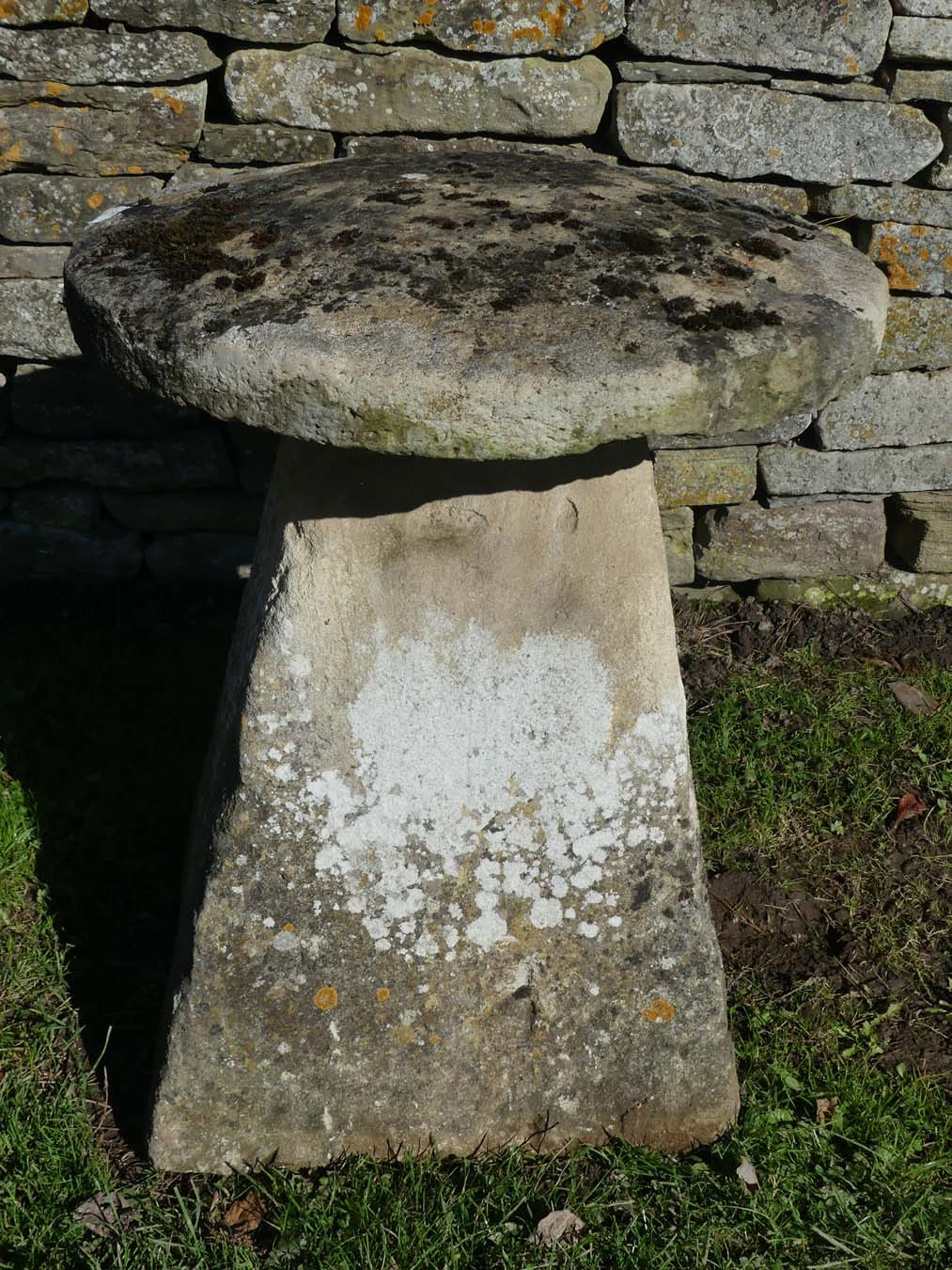 An antique limestone staddle stone from Wiltshire, the well weathered round top on a separate tapered square base.