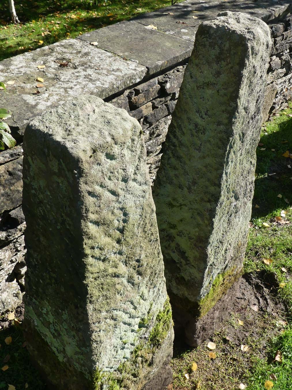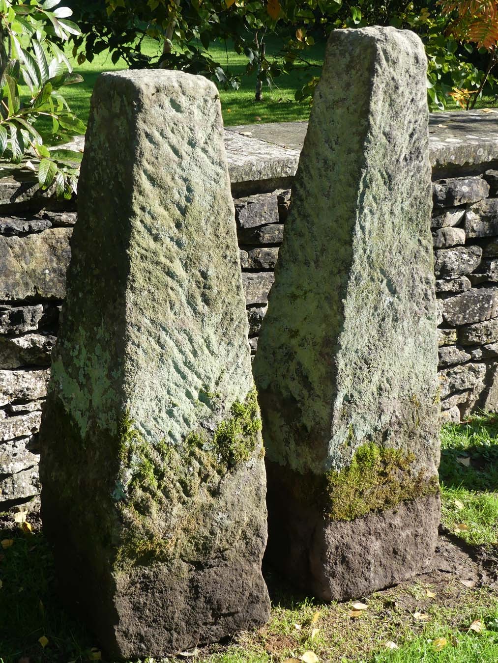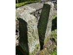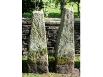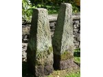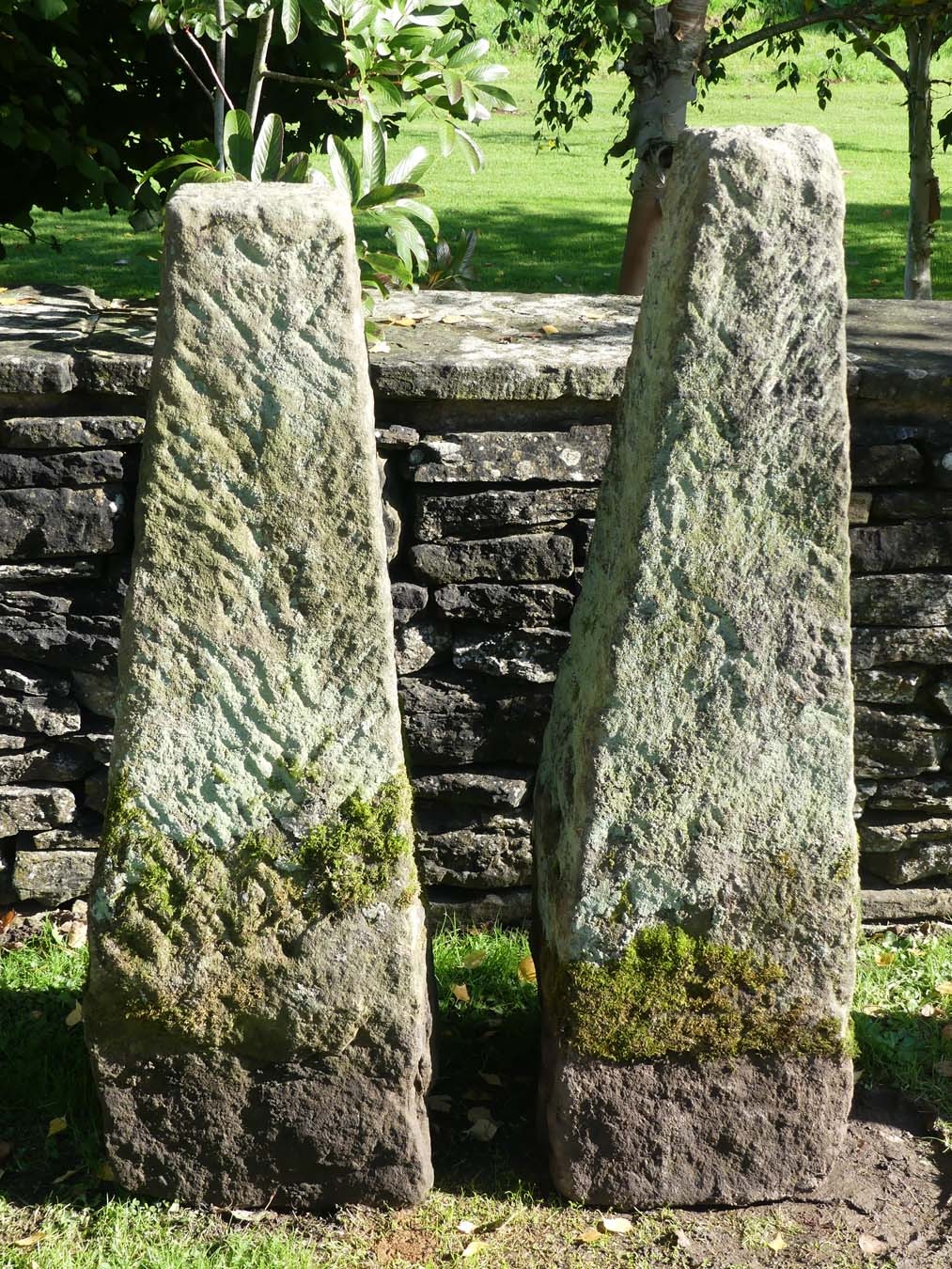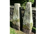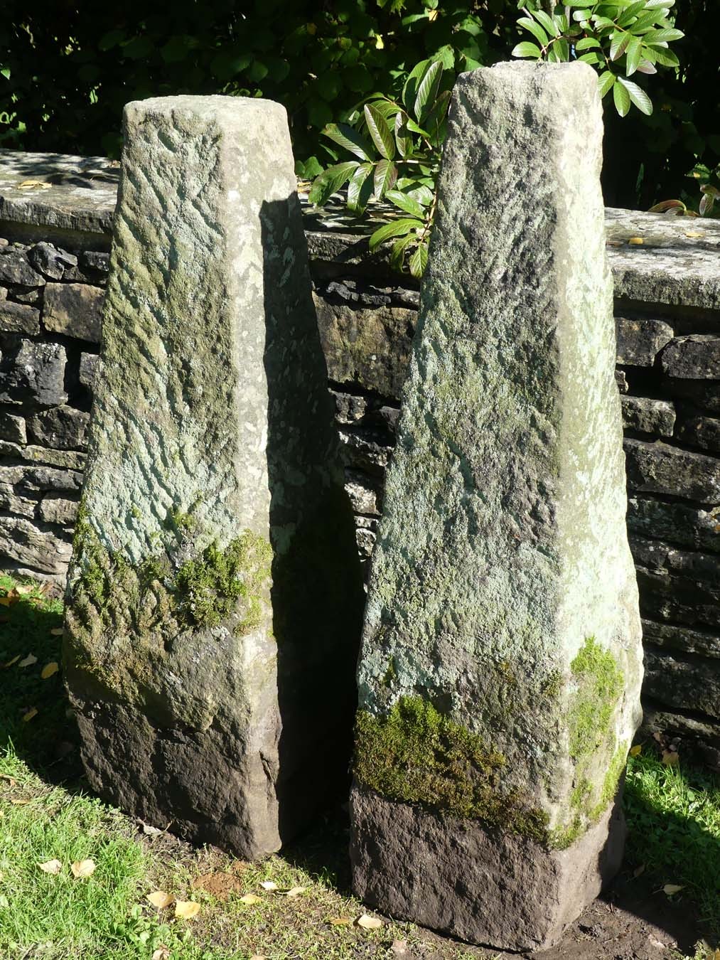 Two similar antique sandstone staddle stone bases from a farm in Derbyshire, both unusually tall with chiselled tapering sides. They are for sale separately and the price is for each stone.