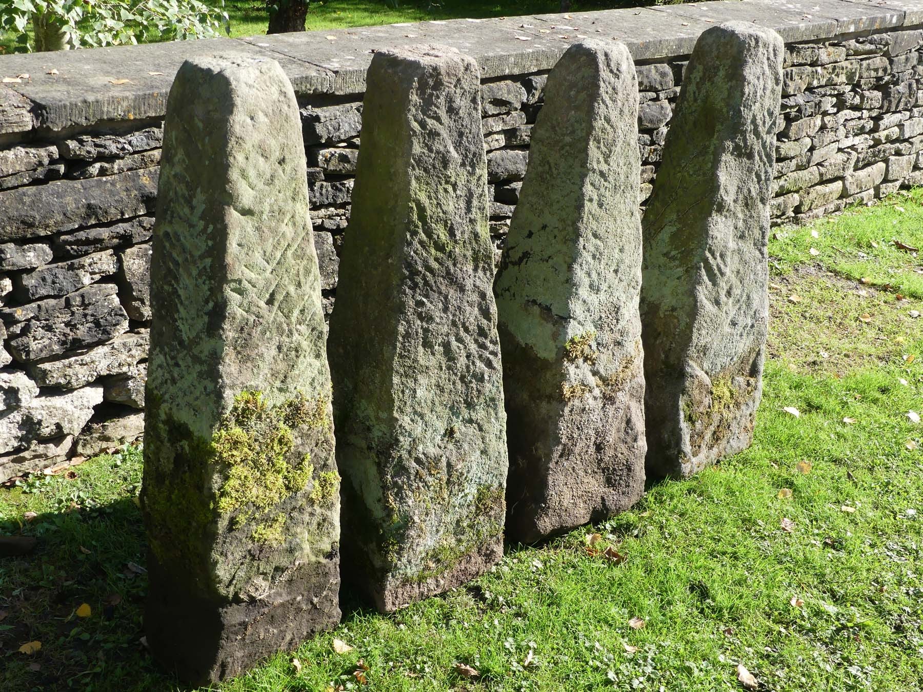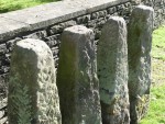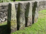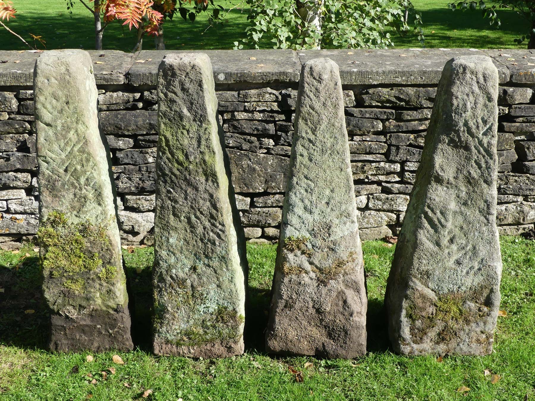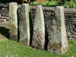 A set of four matching staddle stone bases from Derbyshire, all carved from Derbyshire gritstone and of similar tall tapered form with chisel etched sides. These stones are unusually tall and narrow and could be a very effective way of introducing some vertical symmetry into a country garden.