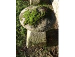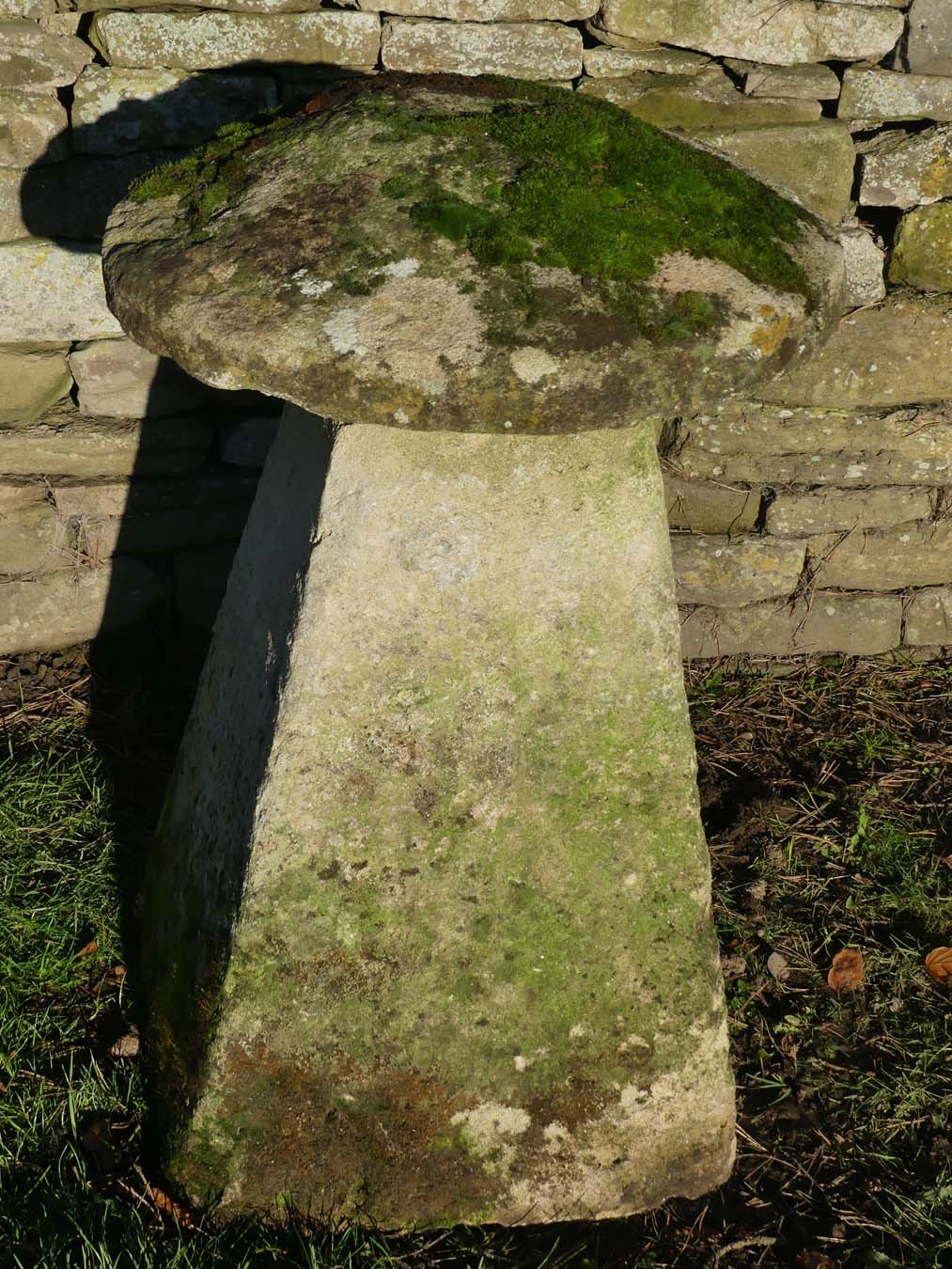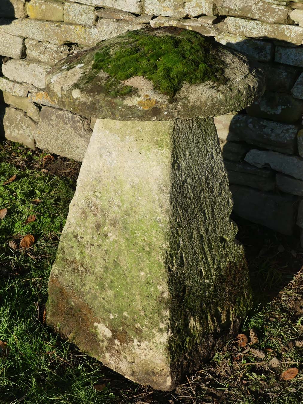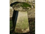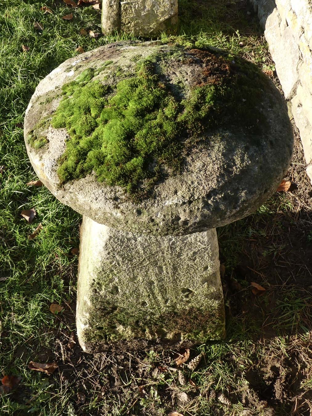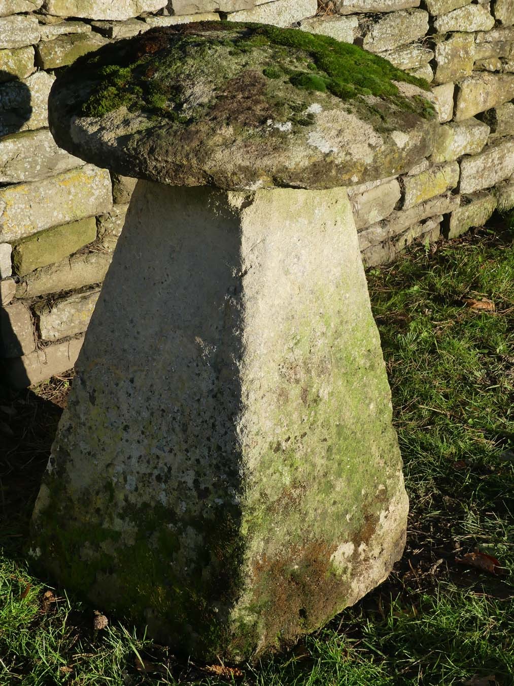 An antique limestone staddlestone from Wiltshire, the mossy round top on a tapered square base.